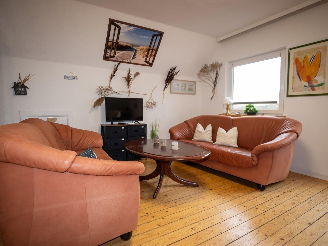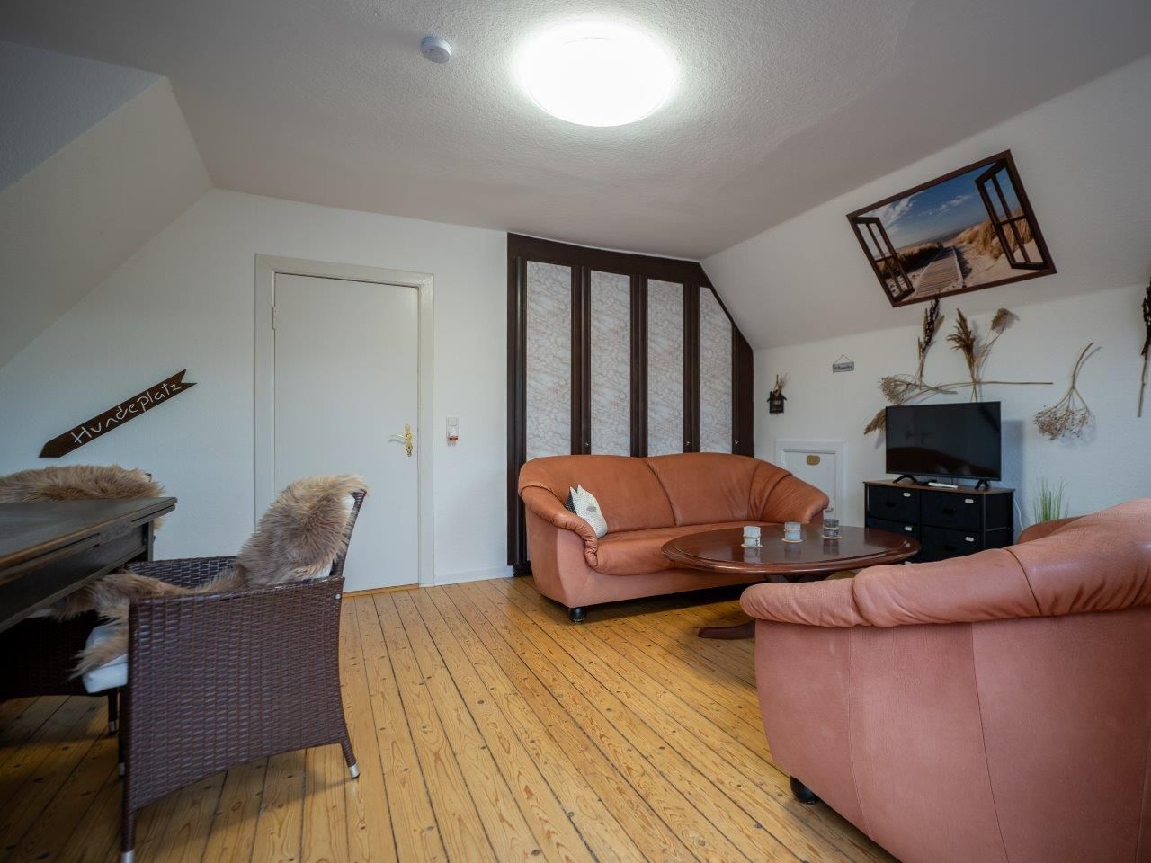 Für gemütliche Fernsehabende oder Faulenzertage steht Ihnen ein LCD TV/ SAT mit den wichtigsten Sendern und zwei Ledersofas davor zur Verfügung.