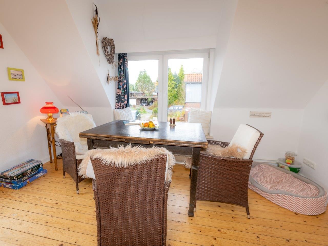 Ein Hundekorb nebst Näpfen steht für Ihre Fellnase bereit.