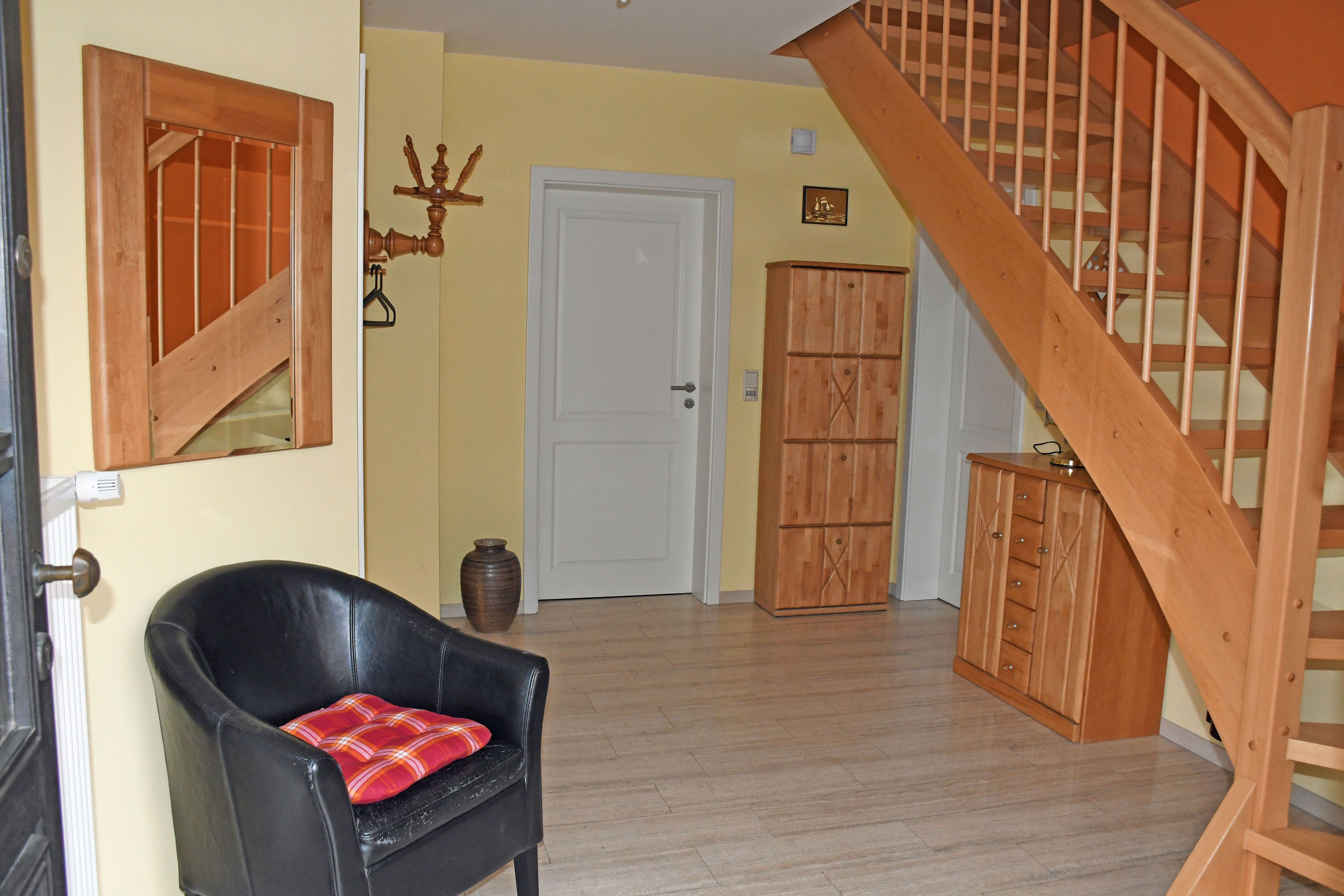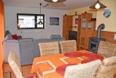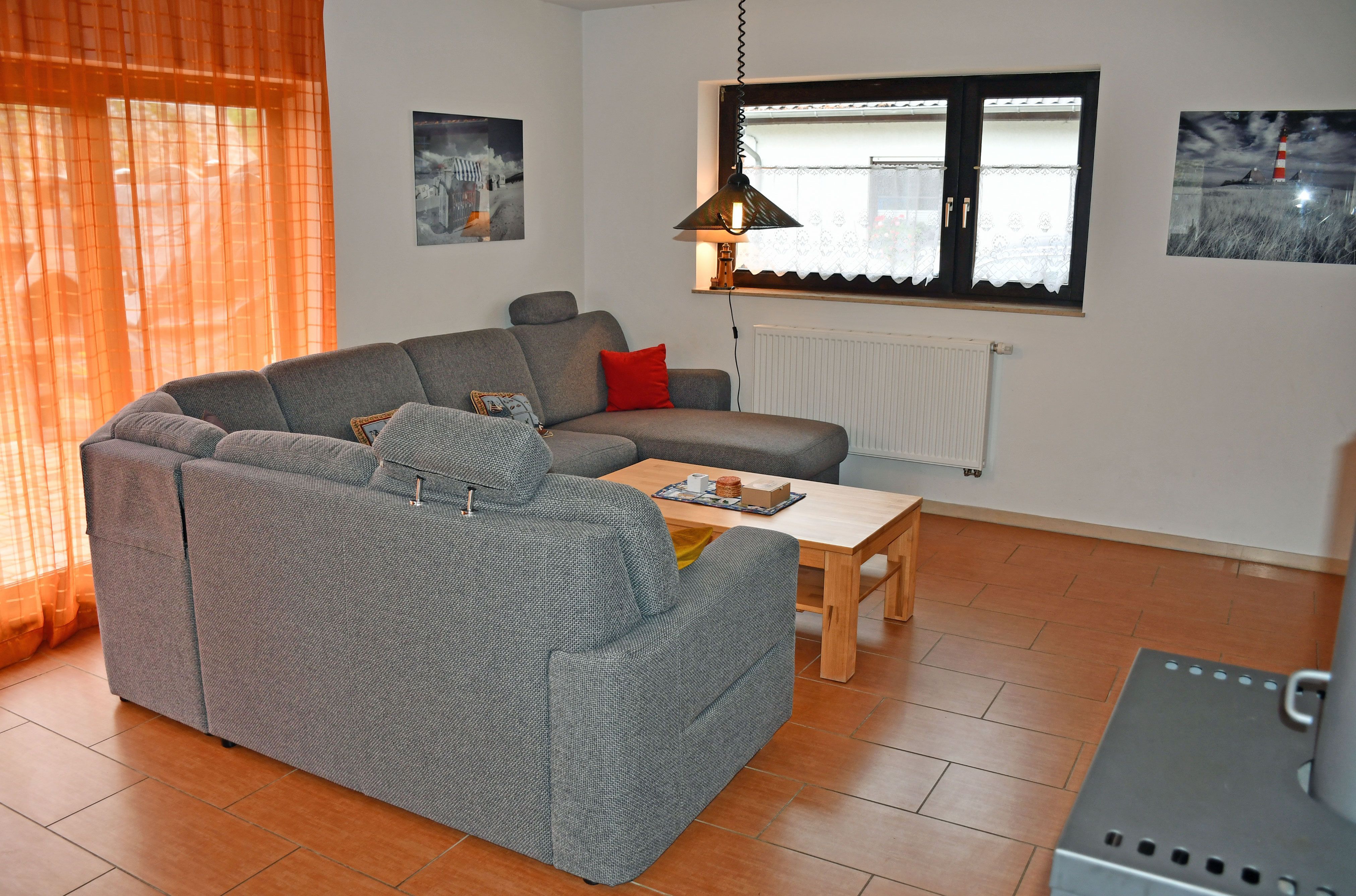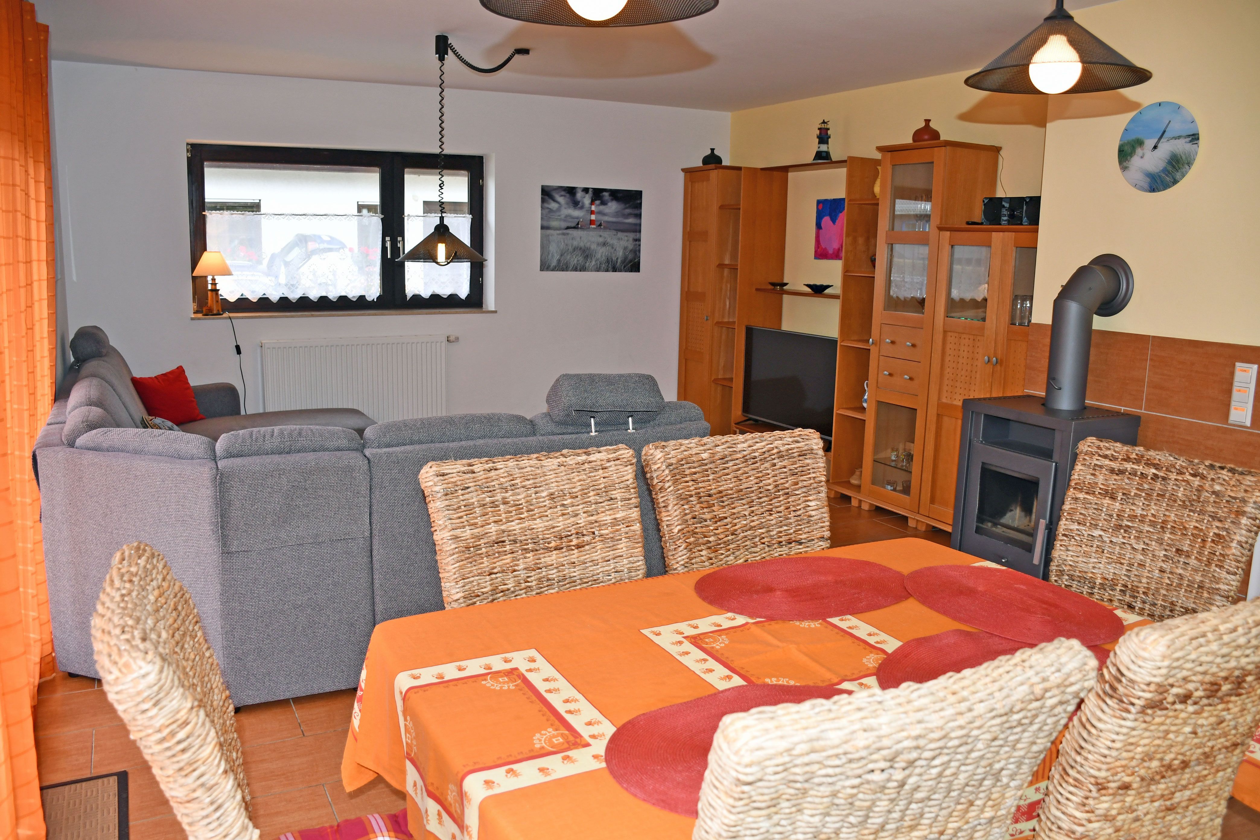 Das freistehende Ferienhaus erstreckt sich mit ca. 130 qm Wohnfläche über 2 Etagen. Im Erdgeschoss gelangen Sie zunächst in den hellen Flurbereich. Im großen Wohnzimmer befinden sich eine Couchgarnitur die auch für eine Gästeaufbettung genutzt werden kann, ein 49 Zoll Flachbild-TV, die Küchenzeile und der Essbereich. Im Wohnzimmer sorgt gerade in der kühleren Jahreszeit ein Kamin für eine behagliche Atmosphäre.