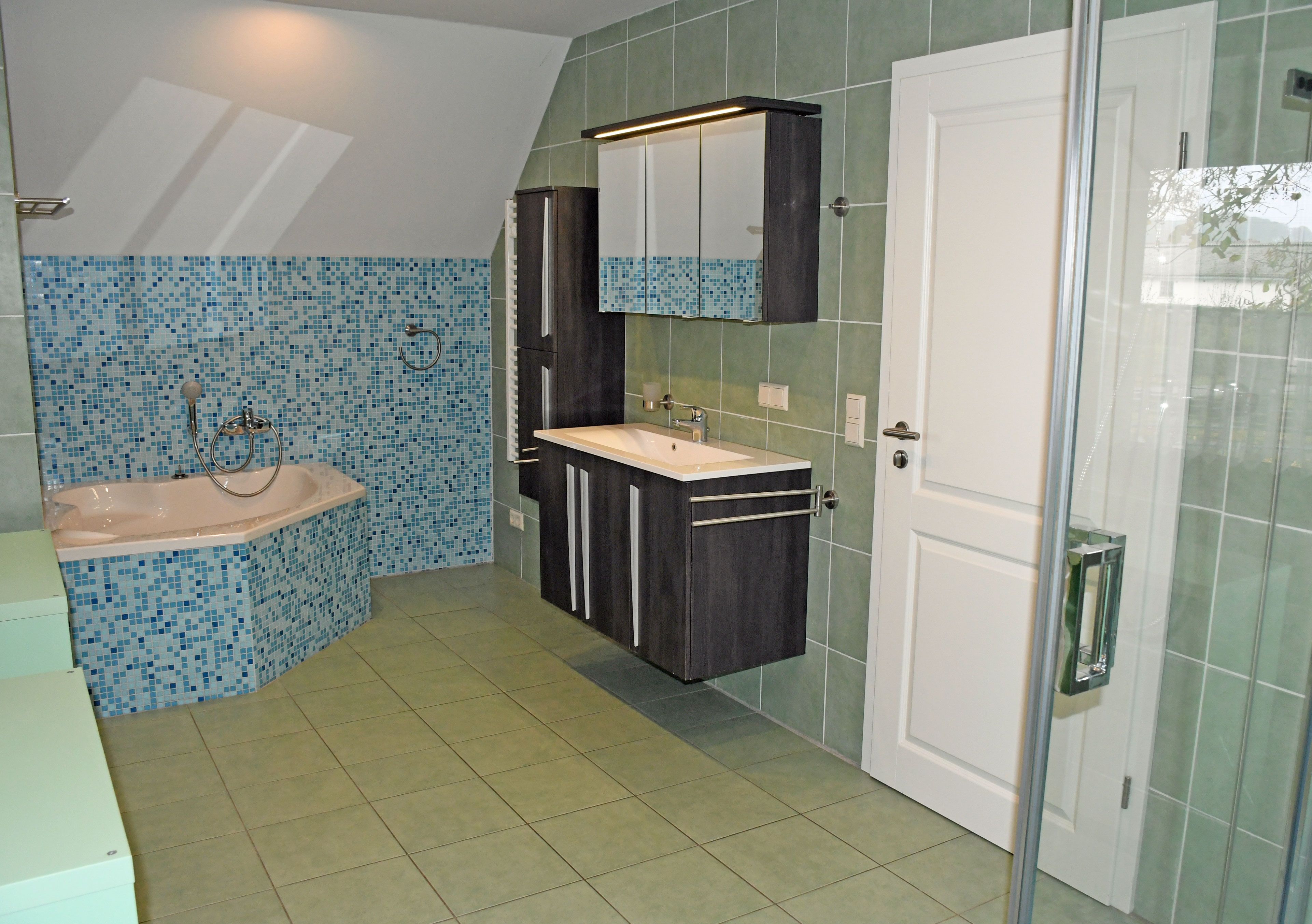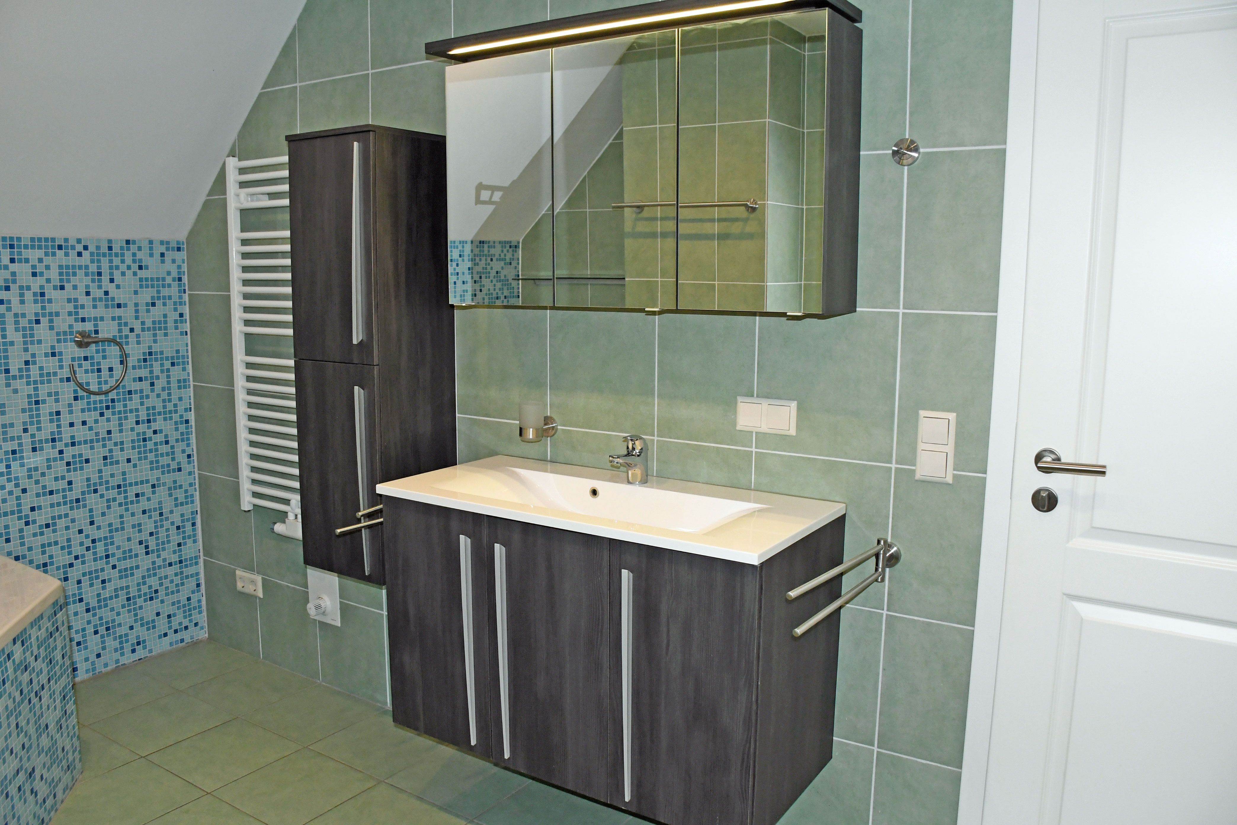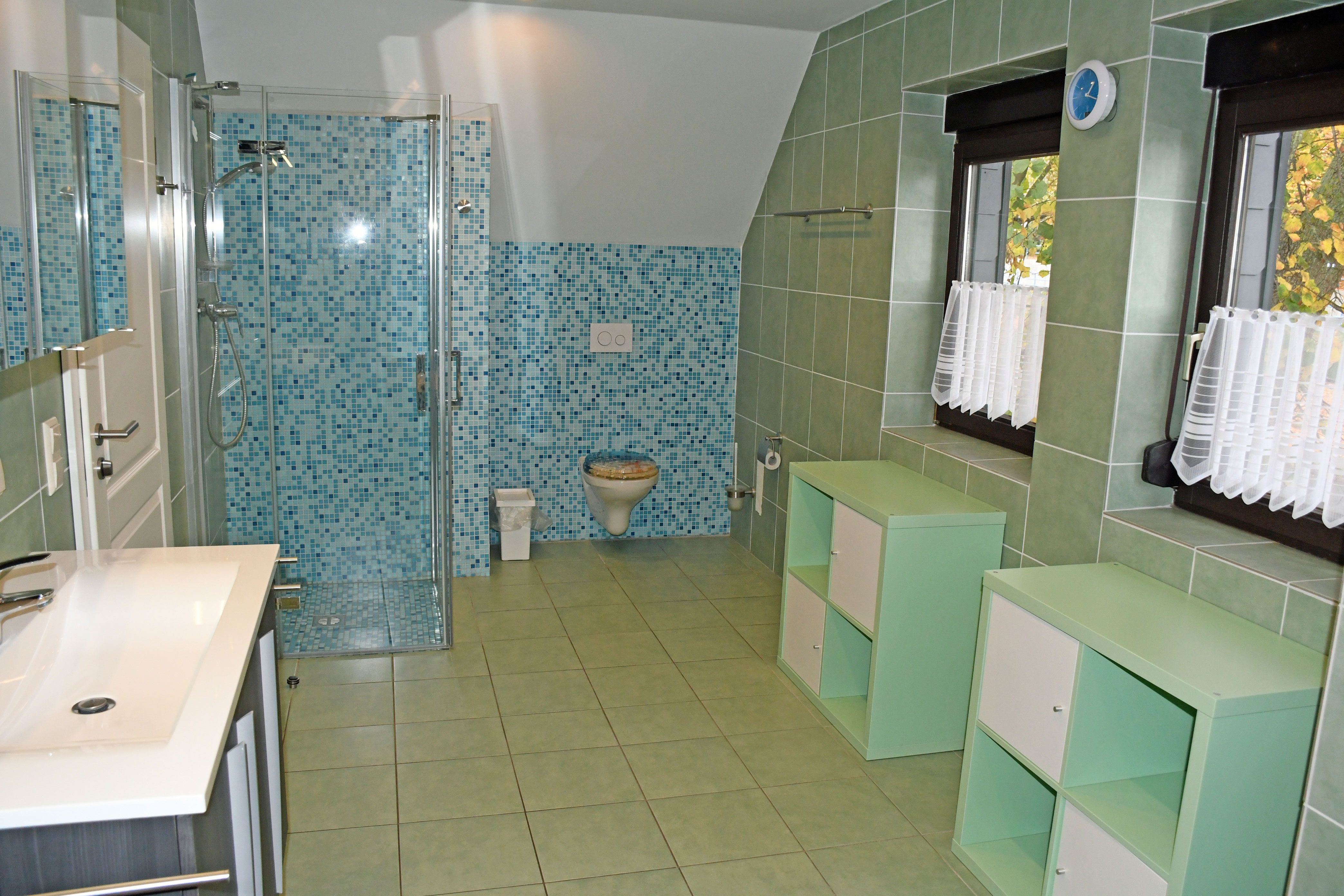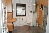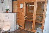 Ebenfalls im Erdgeschoss befindet sich ein modernes Badezimmer mit WC und ebenerdiger Dusche sowie Tageslicht. Die finnische Sauna lädt nach einem Strandspaziergang ebenfalls zur Entspannung ein.