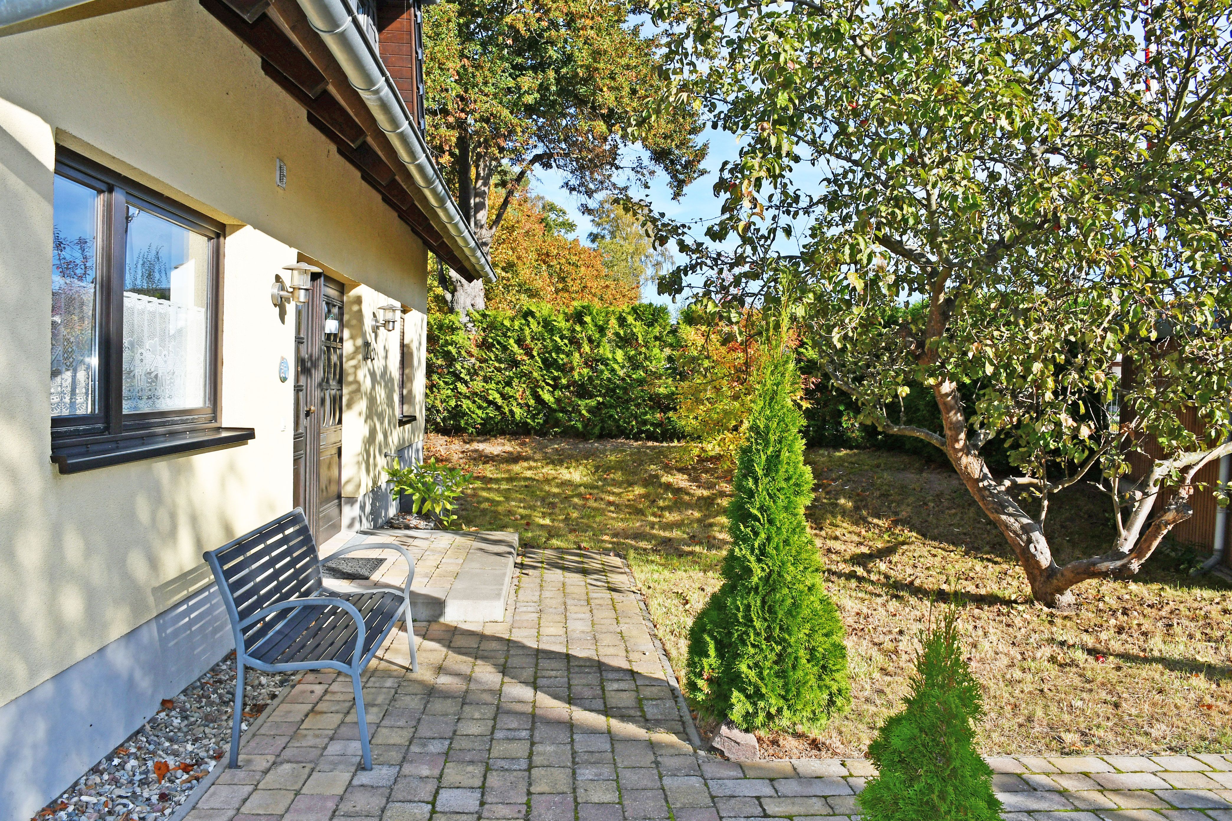 Vom Wohnzimmer aus gelangen Sie auf die große Sonnenterrasse mit Gartenmöbeln, Strandkorb und Grill.