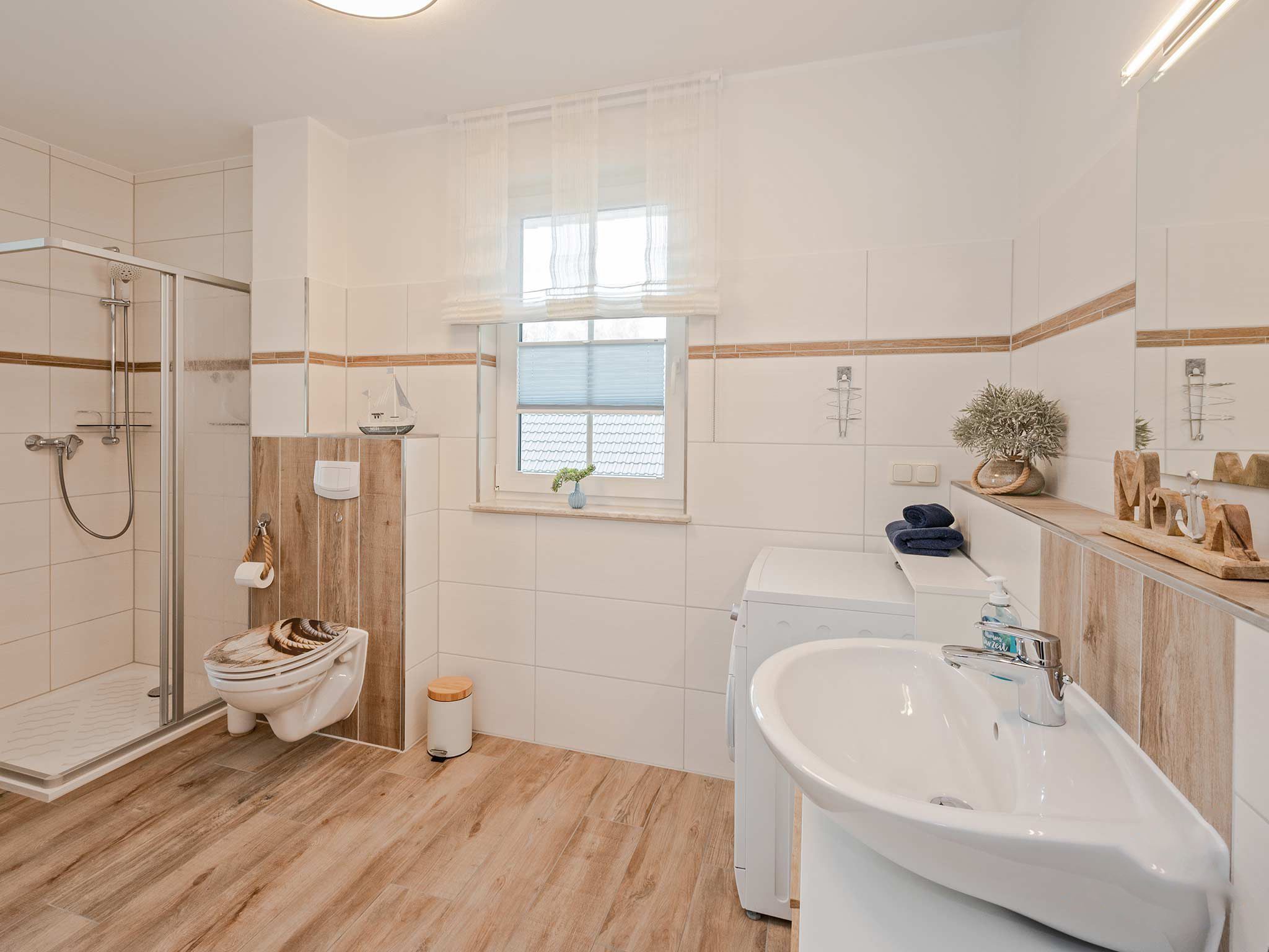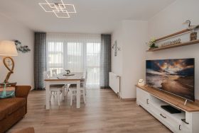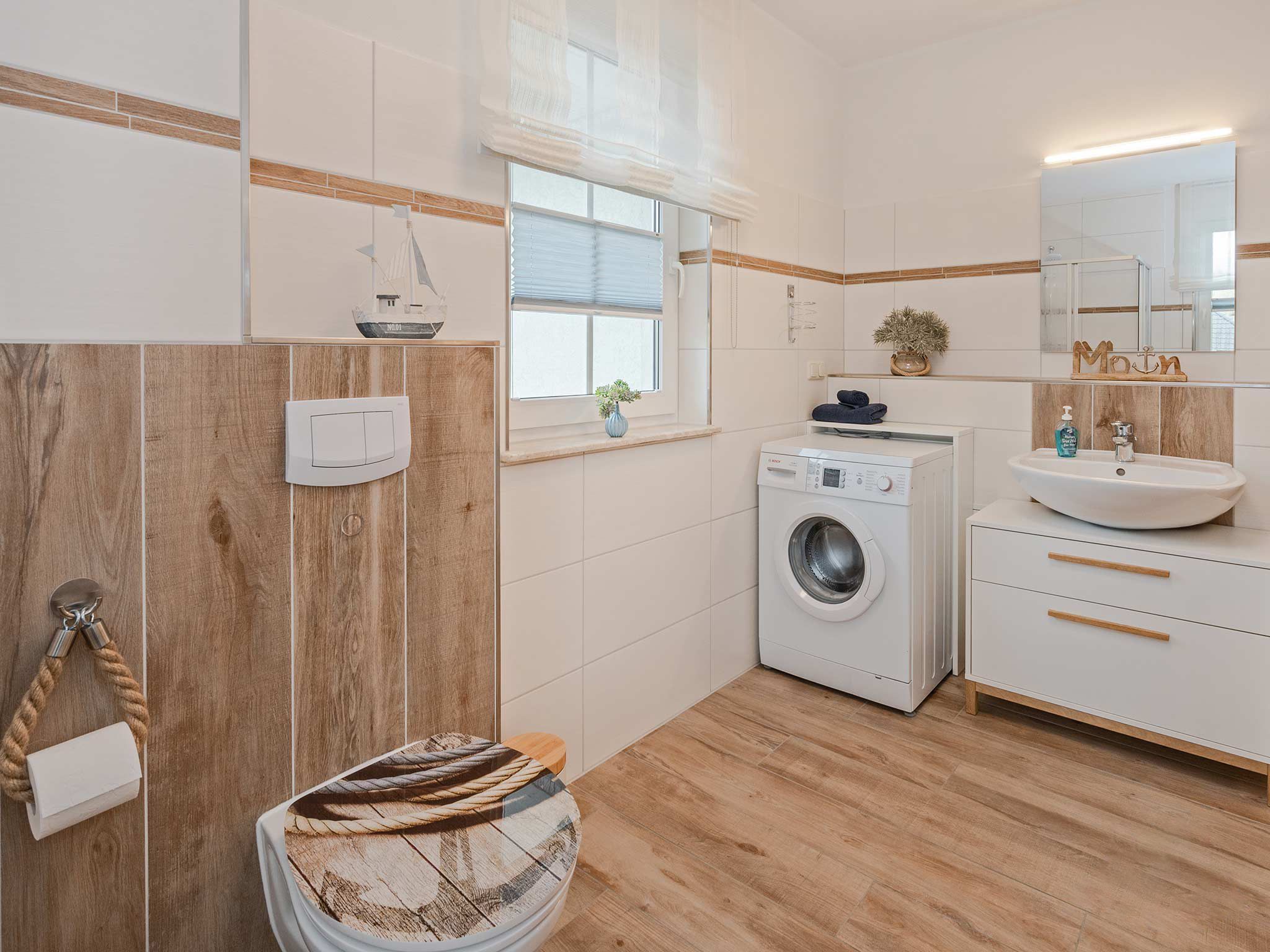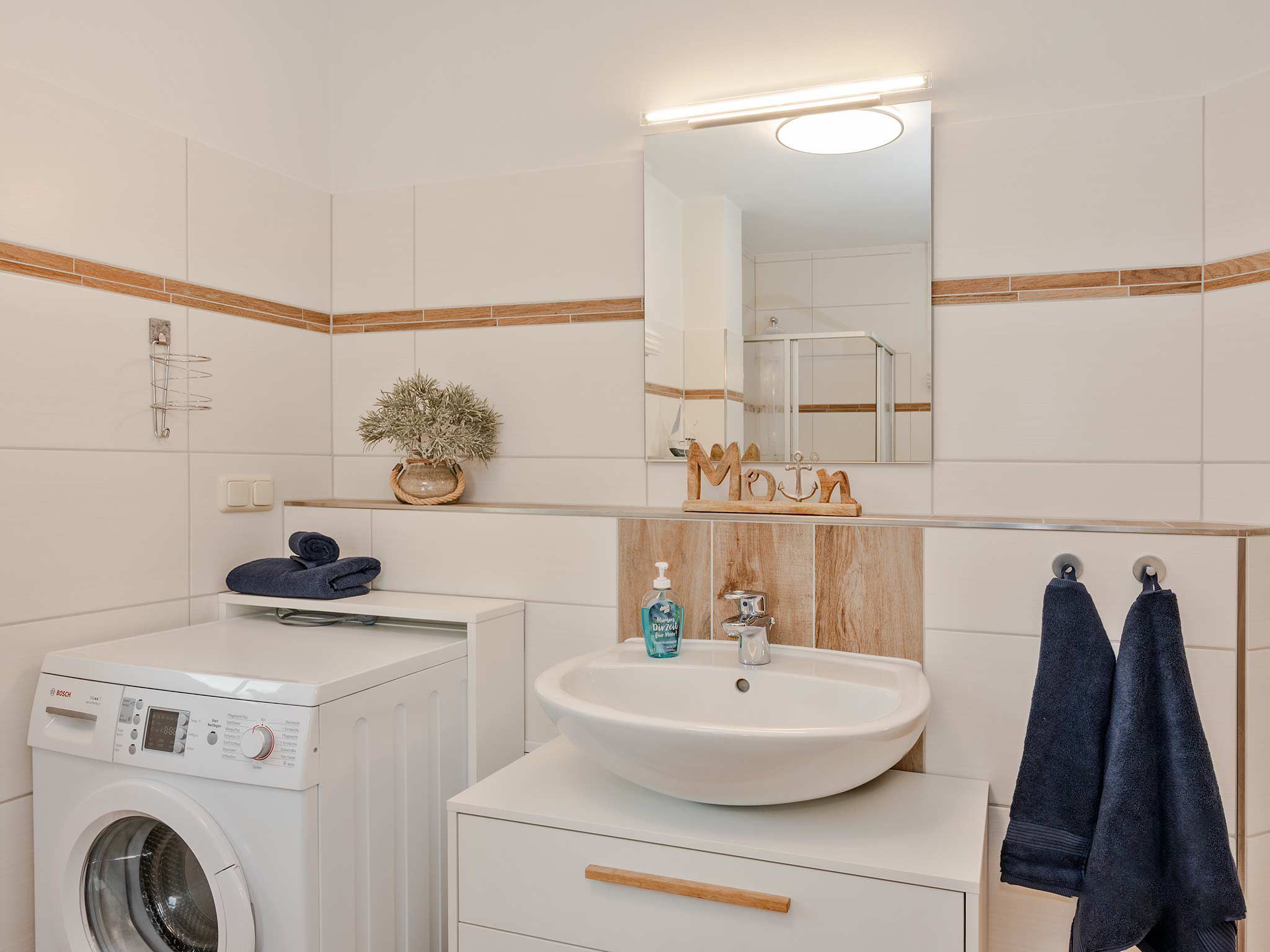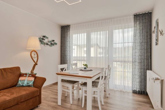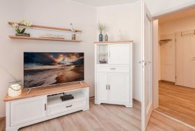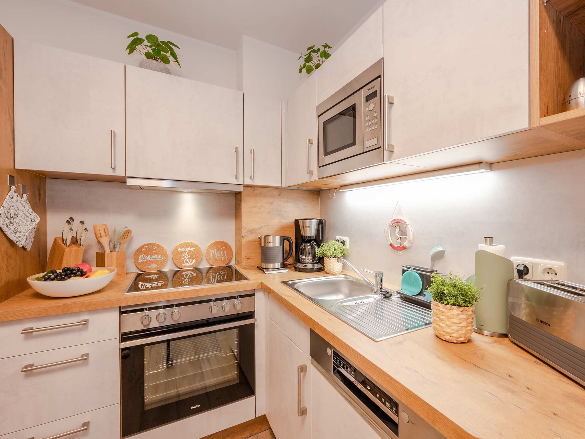 Die moderne 2- Raum Ferienwohnung befindet sich im 1. Obergeschoß der Villa Maria-Gabriele. Die Wohnung wurde im Jahr 2022 komplett modernisiert und mit viel Liebe zum Detail eingerichtet. Auf 44 qm erwartet sie ein gemütliches Wohnzimmer mit einer ausziehbaren Schlafcouch (Aufbettung für 3.+4. Pers. 1,80 x 2,00m), Smart- TV sowie einem Esstisch. Vom Wohnzimmer aus gelangen Sie auch auf den möblierten Balkon in Nord- West Lage. Die voll ausgestattete Küche ist mit Spülmaschine, Backofen, Ceran- Kochfeld, Mikrowelle, Kühlschrank mit Gefriermöglichkeit, Wasserkocher, Toaster und Kaffeemaschine ausgestattet und lässt keine Wünsche offen. Das Schlafzimmer verfügt über ein Doppelbett (1,80 m x 2,00 m), Smart-TV und einem Kleiderschrank. Das maritime Badezimmer ist mit Dusche, WC, Föhn und Waschmaschine ausgestattet. Ein Kinderbett, Kinderhochstuhl sowie Kindergeschirr stehen Ihnen kostenfrei zur Verfügung.