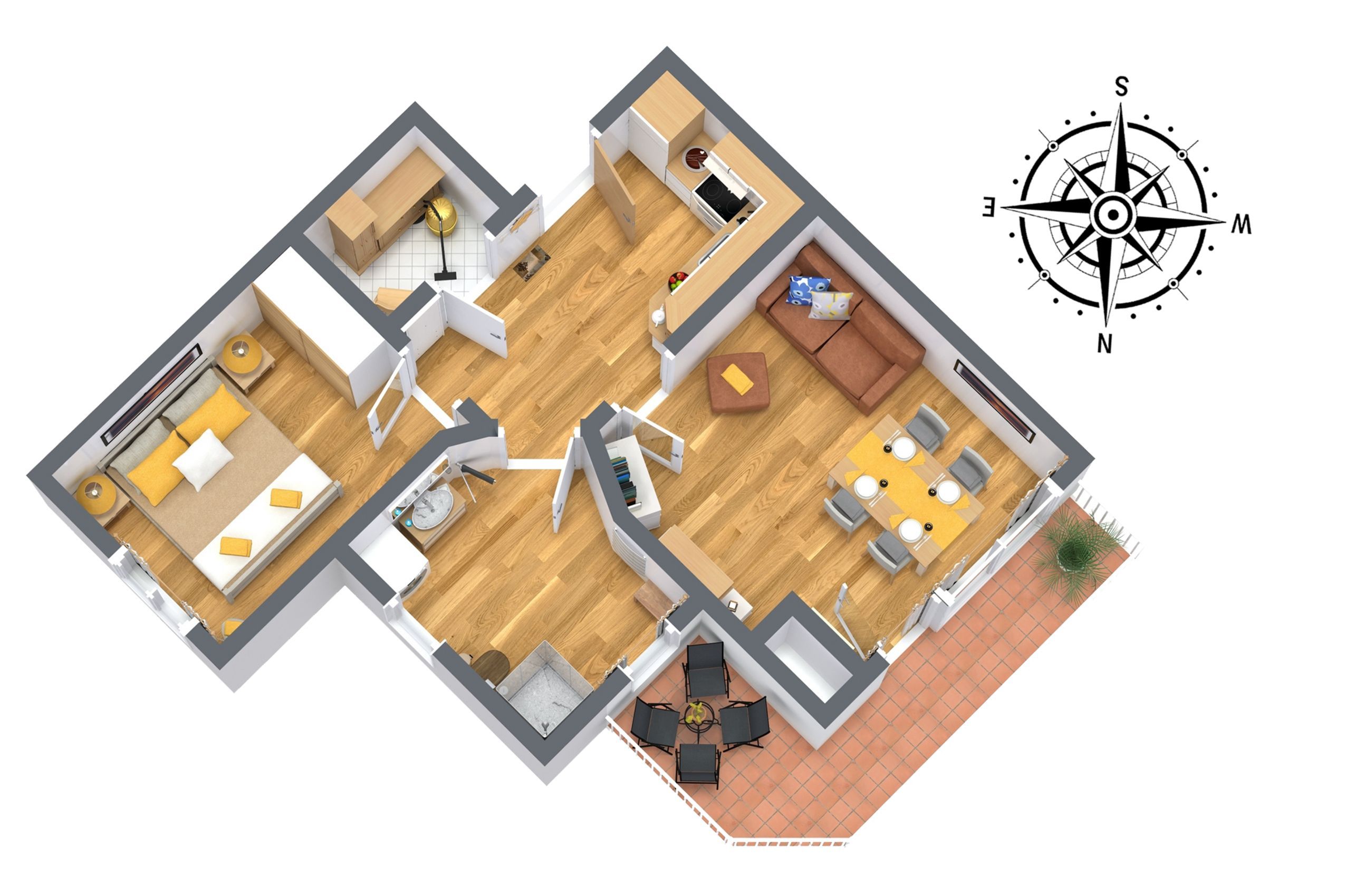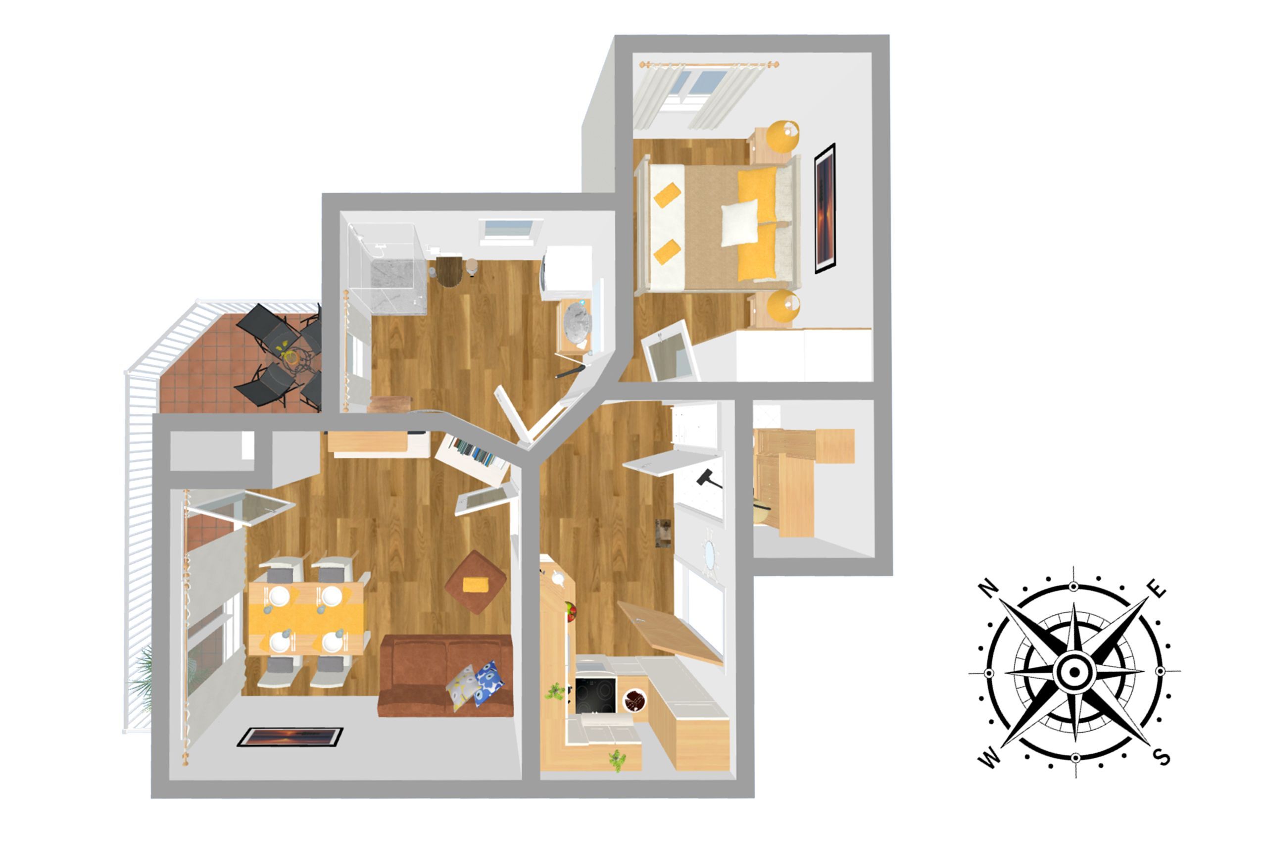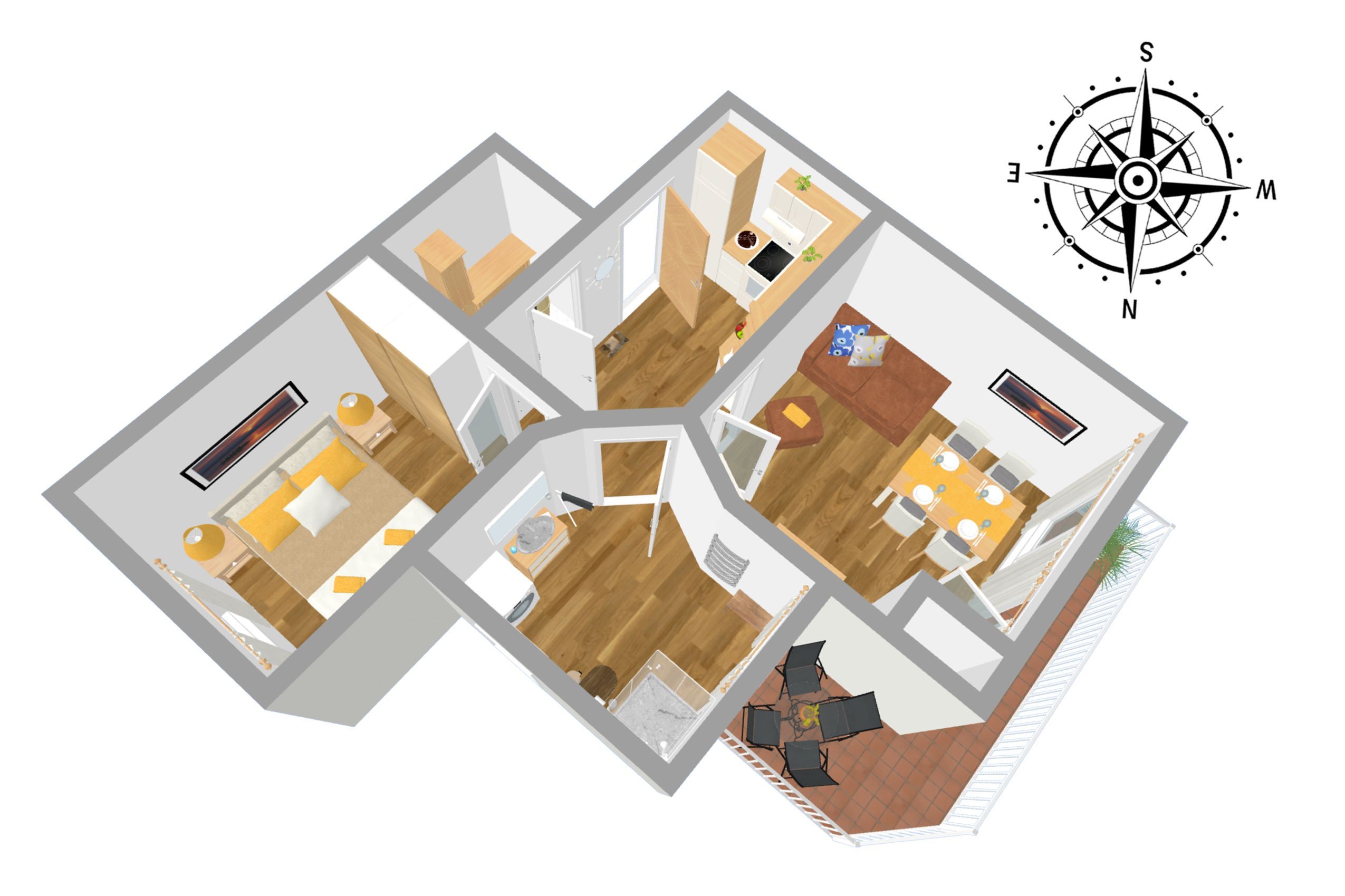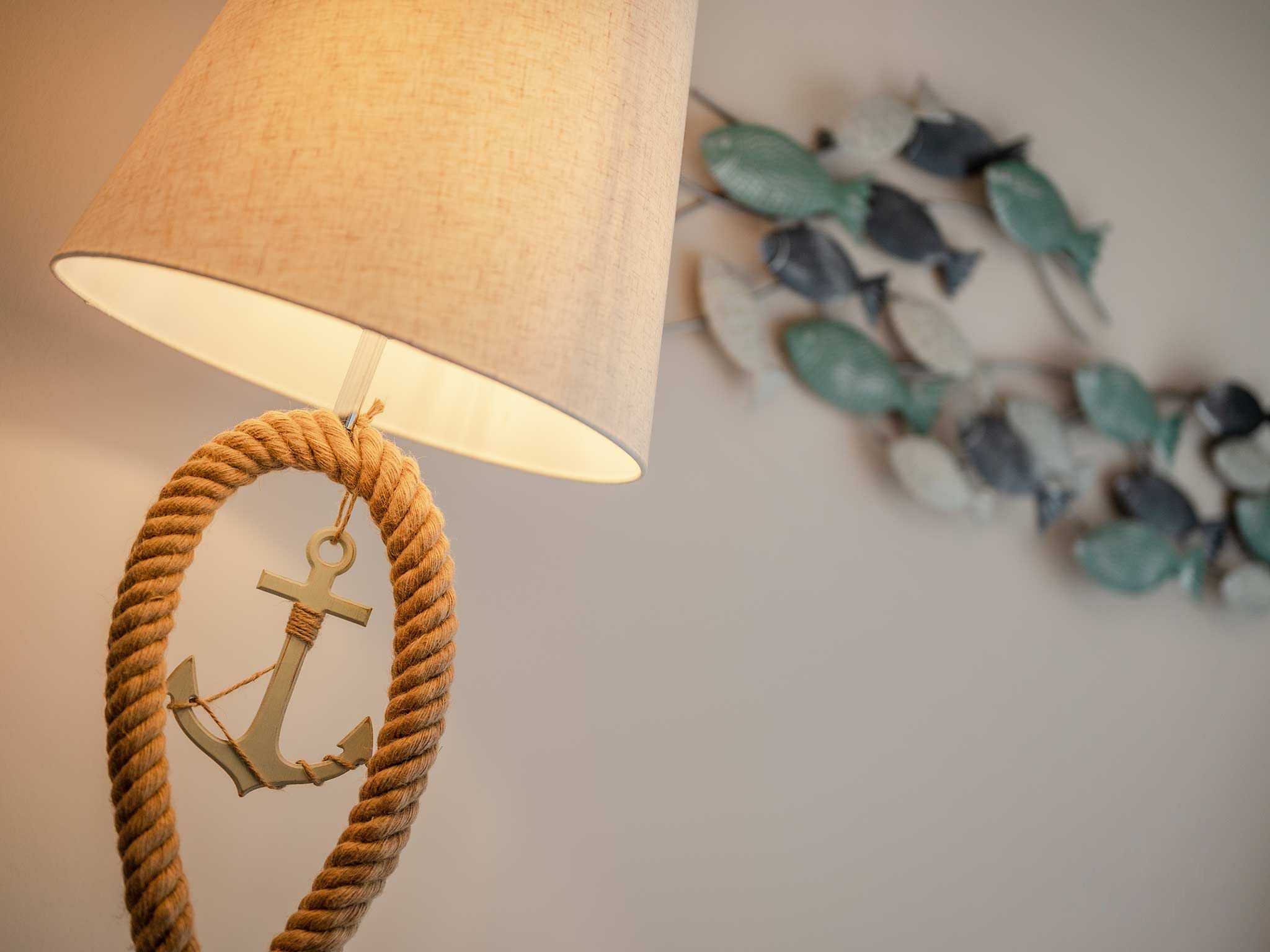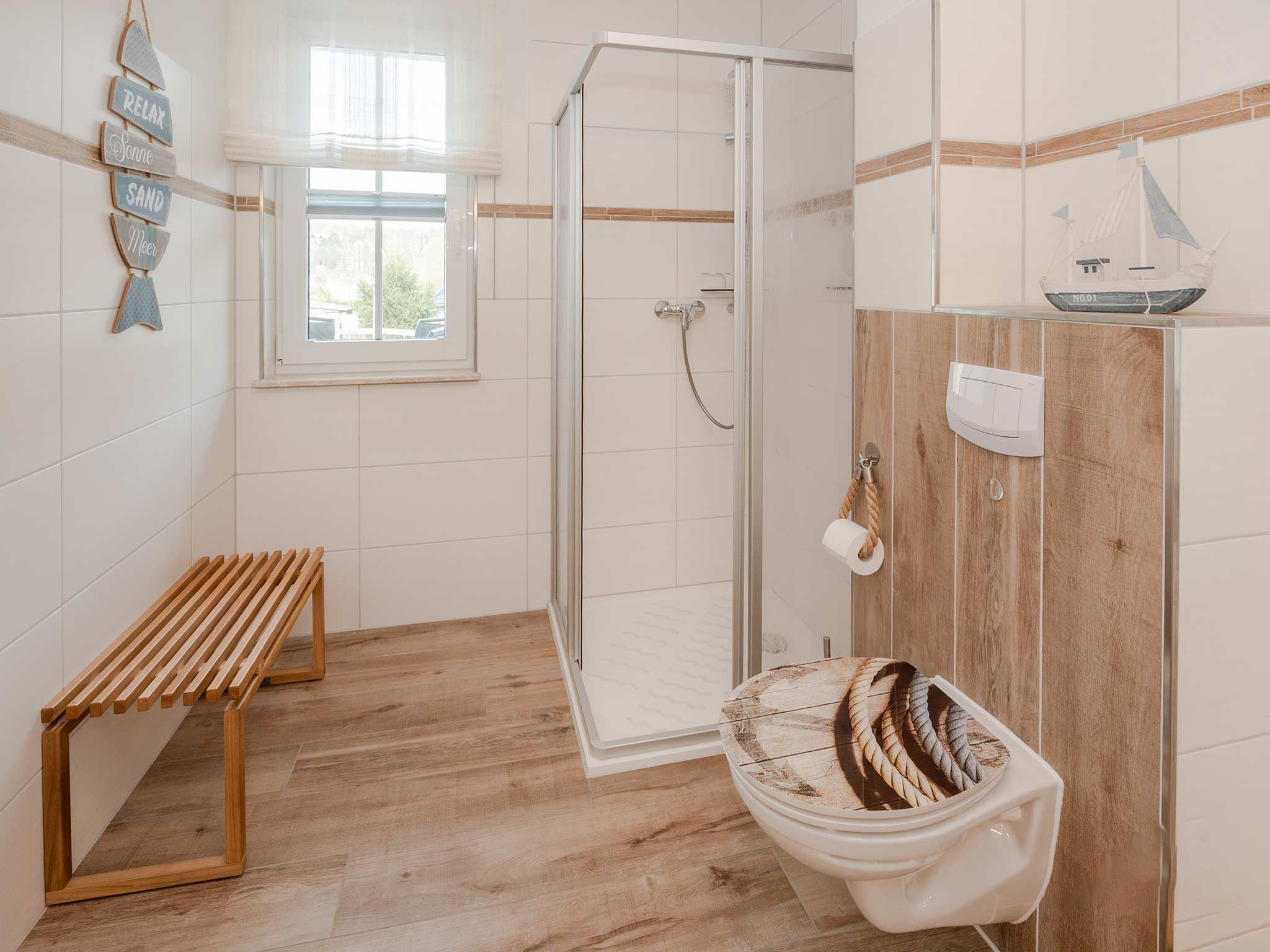 Die moderne 2- Raum Ferienwohnung befindet sich im 1. Obergeschoß der Villa Maria-Gabriele. Die Wohnung wurde im Jahr 2022 komplett modernisiert und mit viel Liebe zum Detail eingerichtet. Auf 44 qm erwartet sie ein gemütliches Wohnzimmer mit einer ausziehbaren Schlafcouch (Aufbettung für 3.+4. Pers. 1,80 x 2,00m), Smart- TV sowie einem Esstisch. Vom Wohnzimmer aus gelangen Sie auch auf den möblierten Balkon in Nord- West Lage. Die voll ausgestattete Küche ist mit Spülmaschine, Backofen, Ceran- Kochfeld, Mikrowelle, Kühlschrank mit Gefriermöglichkeit, Wasserkocher, Toaster und Kaffeemaschine ausgestattet und lässt keine Wünsche offen. Das Schlafzimmer verfügt über ein Doppelbett (1,80 m x 2,00 m), Smart-TV und einem Kleiderschrank. Das maritime Badezimmer ist mit Dusche, WC, Föhn und Waschmaschine ausgestattet. Ein Kinderbett, Kinderhochstuhl sowie Kindergeschirr stehen Ihnen kostenfrei zur Verfügung.