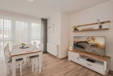 Ruhig gelegene Ferienwohnung in der Villa Maria-Gabriele im Seebad Kölpinsee, direkt an seinem namensgebenden See. Bis zum feindsandigen Ostseestrand sind es nur wenige Gehminuten, ebenso wie bis ins Zentrum wo sich eine Bäckerei, die Tourist- Information und der Bahnhof befinden. Die Villa Maria-Gabriele verfügt über mehrere Ferienwohnungen. Vor dem Haus befindet sich ein Parkplatz der kostenfrei genutzt werden kann. Pro Wohnung steht ein Parkplatz zur Verfügung. Bitte beachten Sie, dass der Parkplatz nicht für Transporter oder Kleinbusse geeignet ist. Eine abschließbare Fahrradunterstellmöglichkeit ist ebenfalls vorhanden. Die moderne 2-Raum-Ferienwohnung ist 44qm groß und befindet sich im 1. Obergeschoss des Hauses. Sie teilt sich auf in ein Wohnzimmer mit Essbereich, eine separate Küche, Schlafzimmer und Badezimmer. Vom Wohnzimmer erreichen Sie den möblierten Balkon.