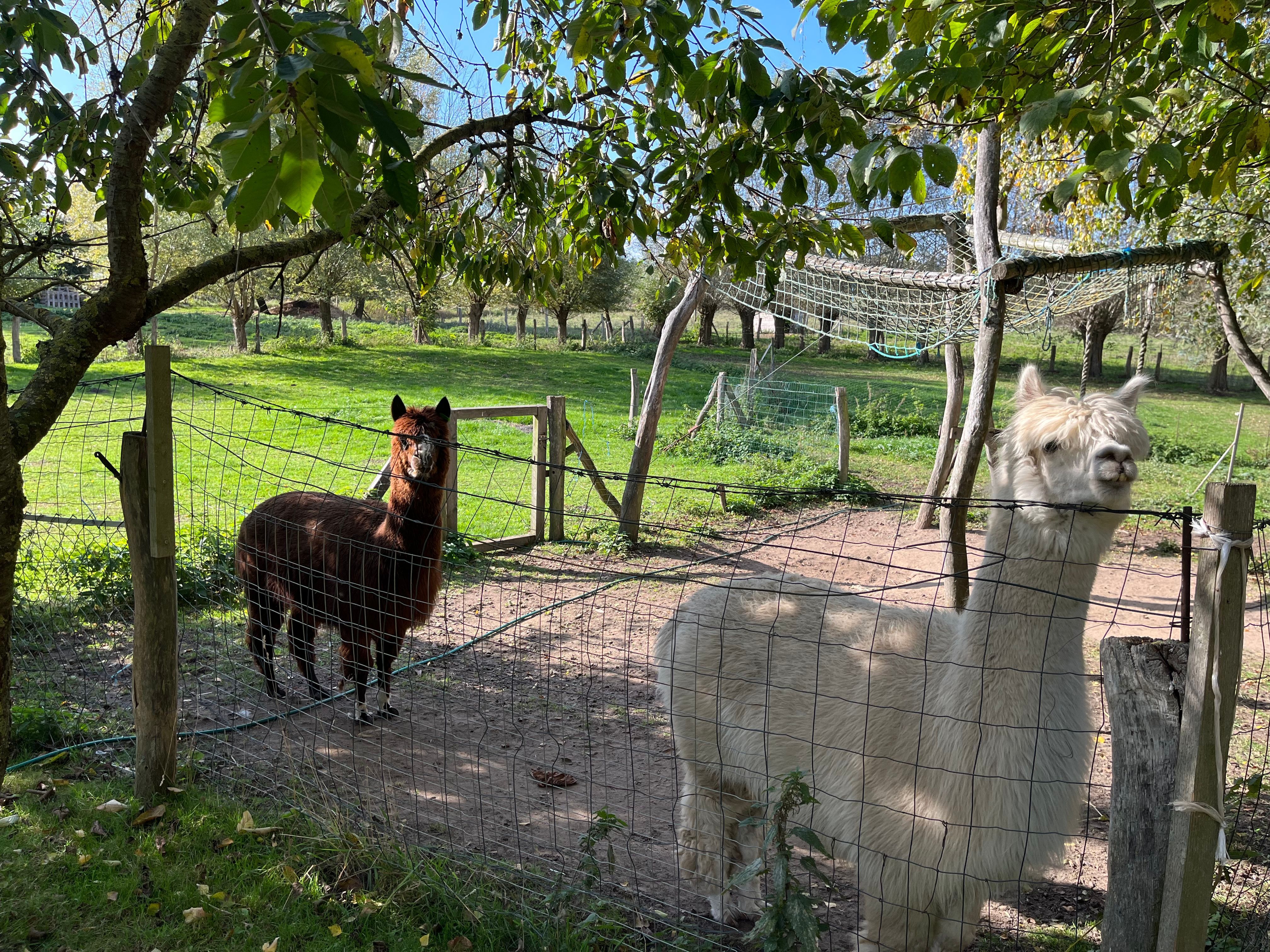Am Haus: viel Grün, 2 Alpakas, 1 PKW Stellplatz pro Ferienunterkunft.