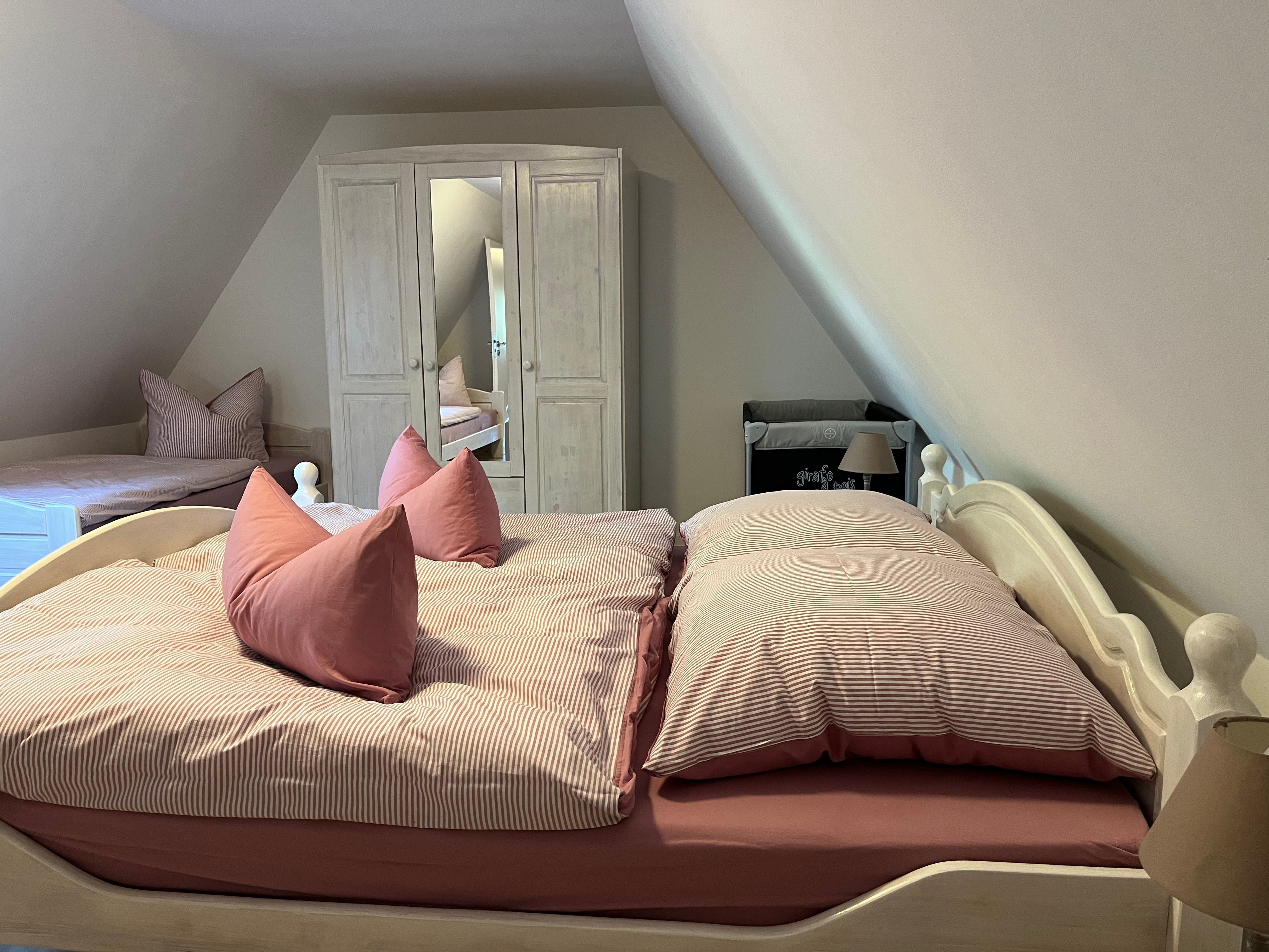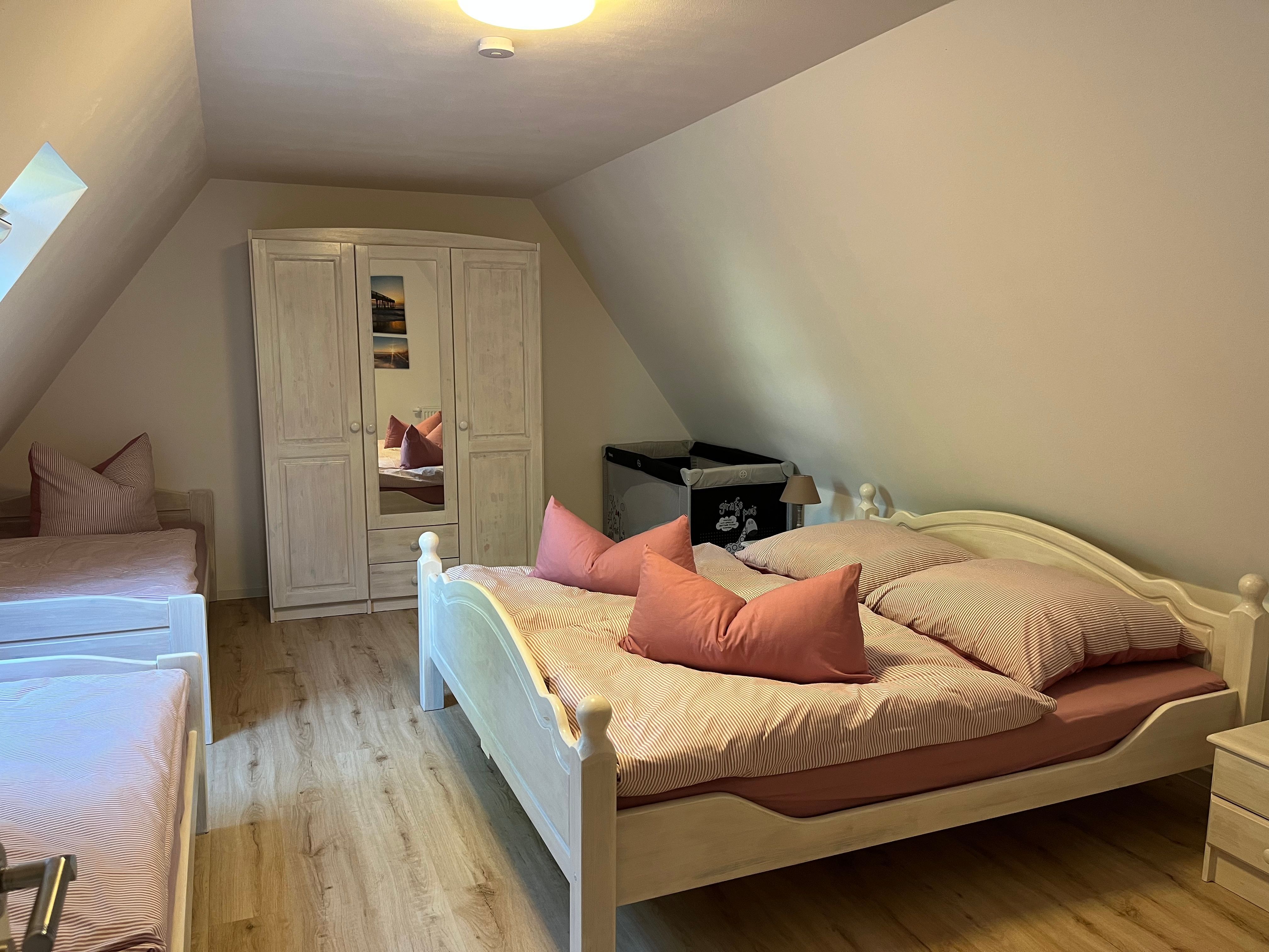 1 Schlafzimmer mit Doppelbett und 2 Einzelbetten und Reisebett für Baby