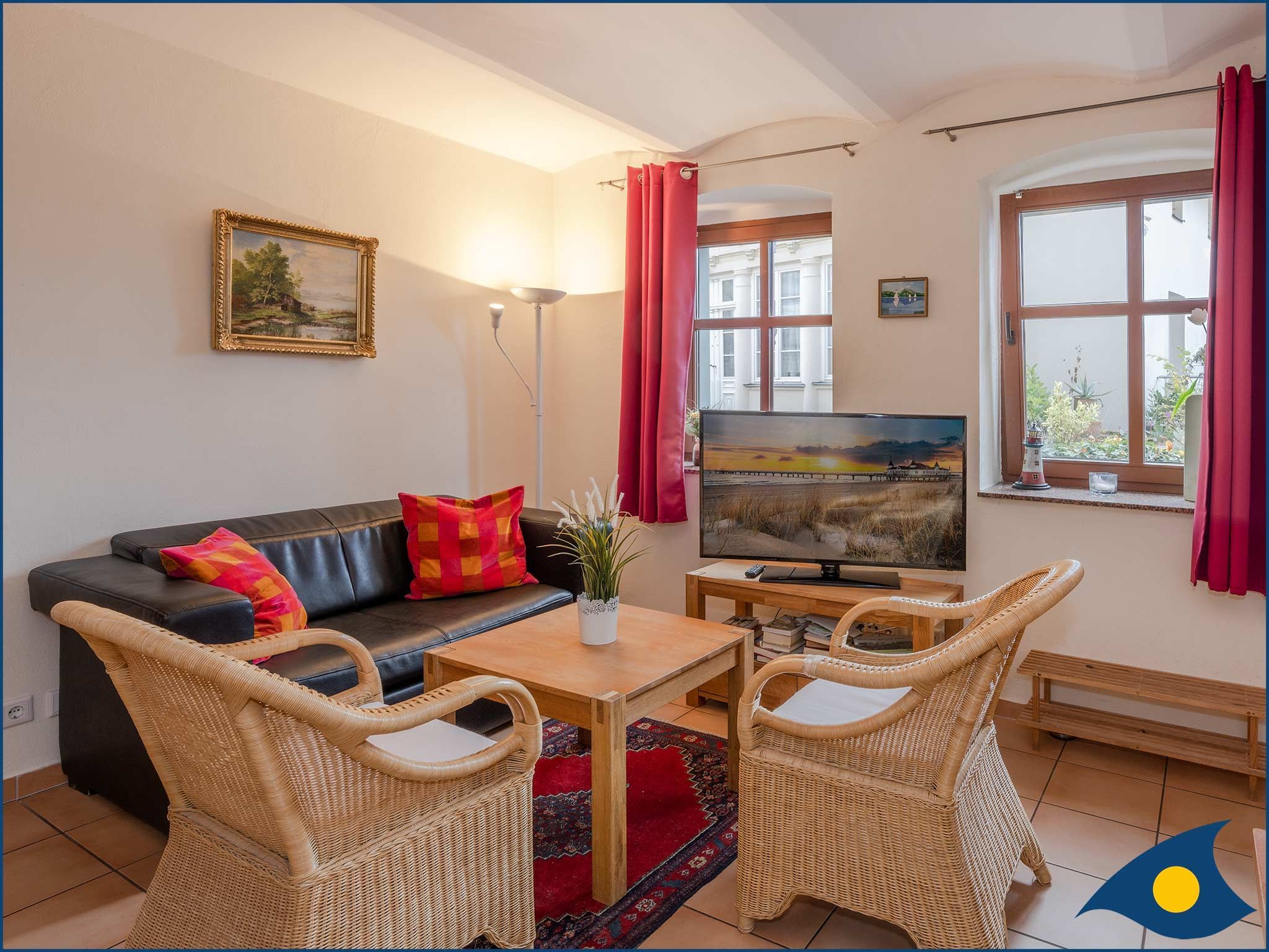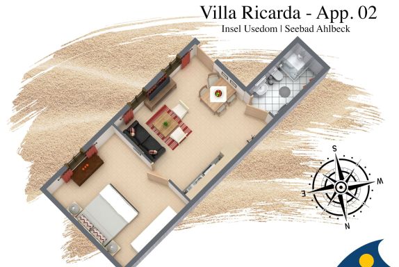Die Wohnung 2 befindet sich im Souterrain des Hauses Ricarda mit separatem Eingang. Sie ist eine komplett ausgestattete ca. 40m² große 2-Raum-Ferienwohnungen mit offener Küche und für bis zu 4 Personen ausgelegt.