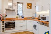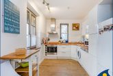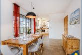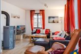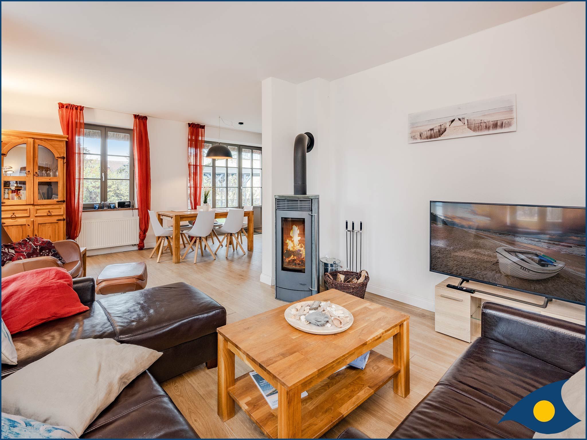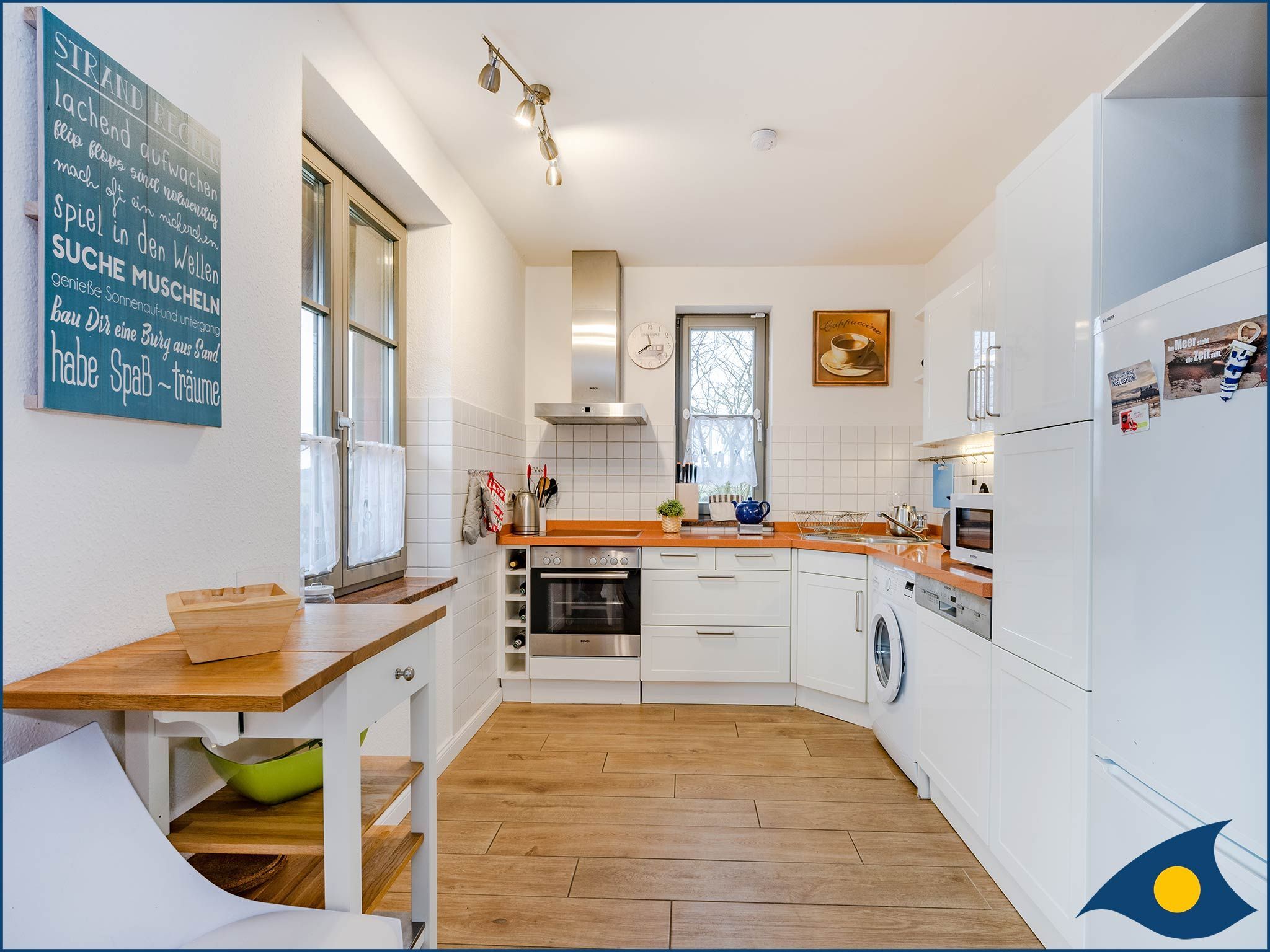 Durch den Wohnbereich mit offeren Küche, Essplatz für 6 Personen, Kamin und gemütlicher Couch kommen Sie zur Terrasse, auf der Sie entspannt den Urlaubstag ausklingen lassen können. Die Küche ist voll ausgestattet und bietet Ihnen alle Annehmlichkeiten - vom Geschirrspüler bis zur Waschmaschine.