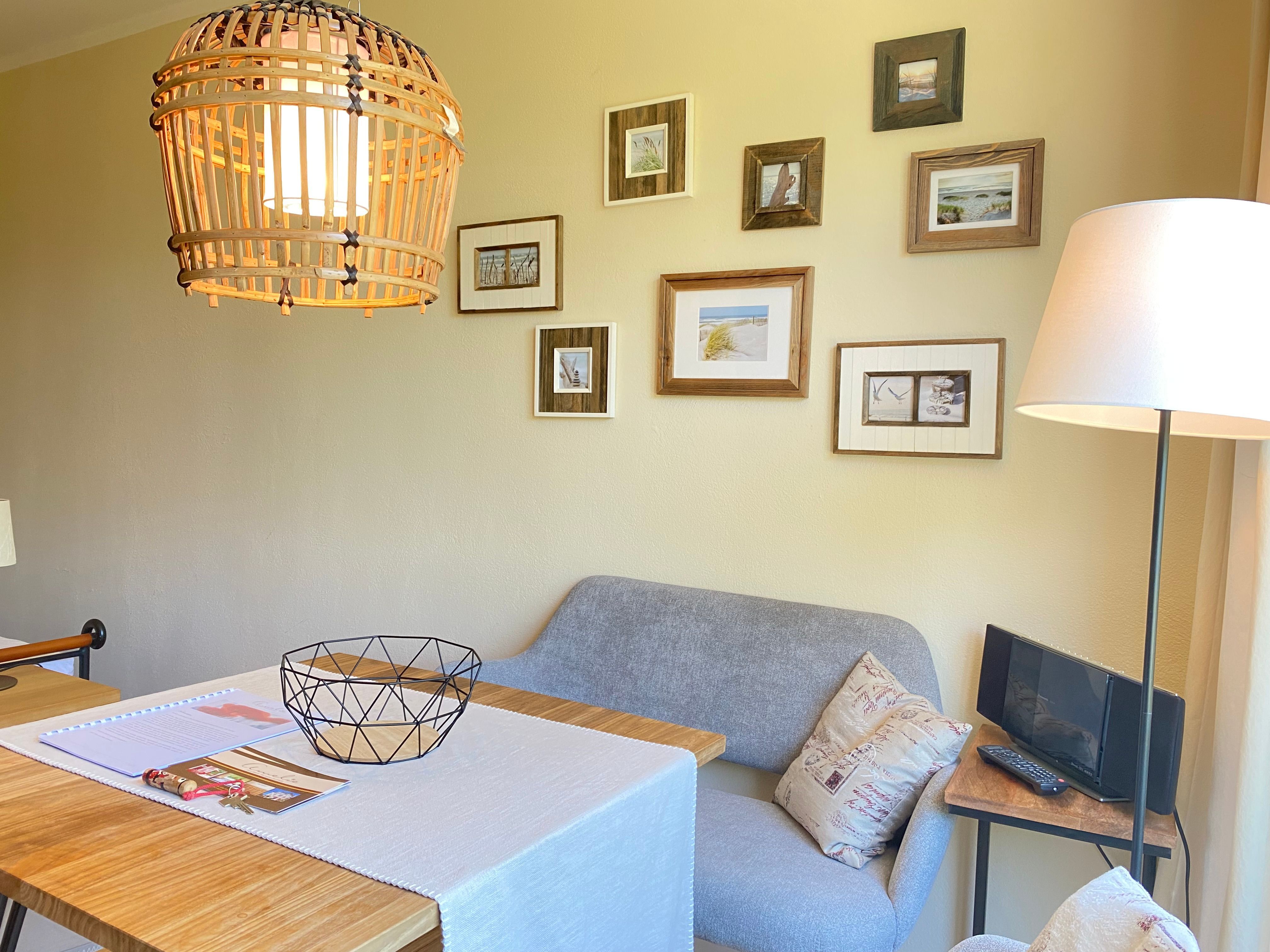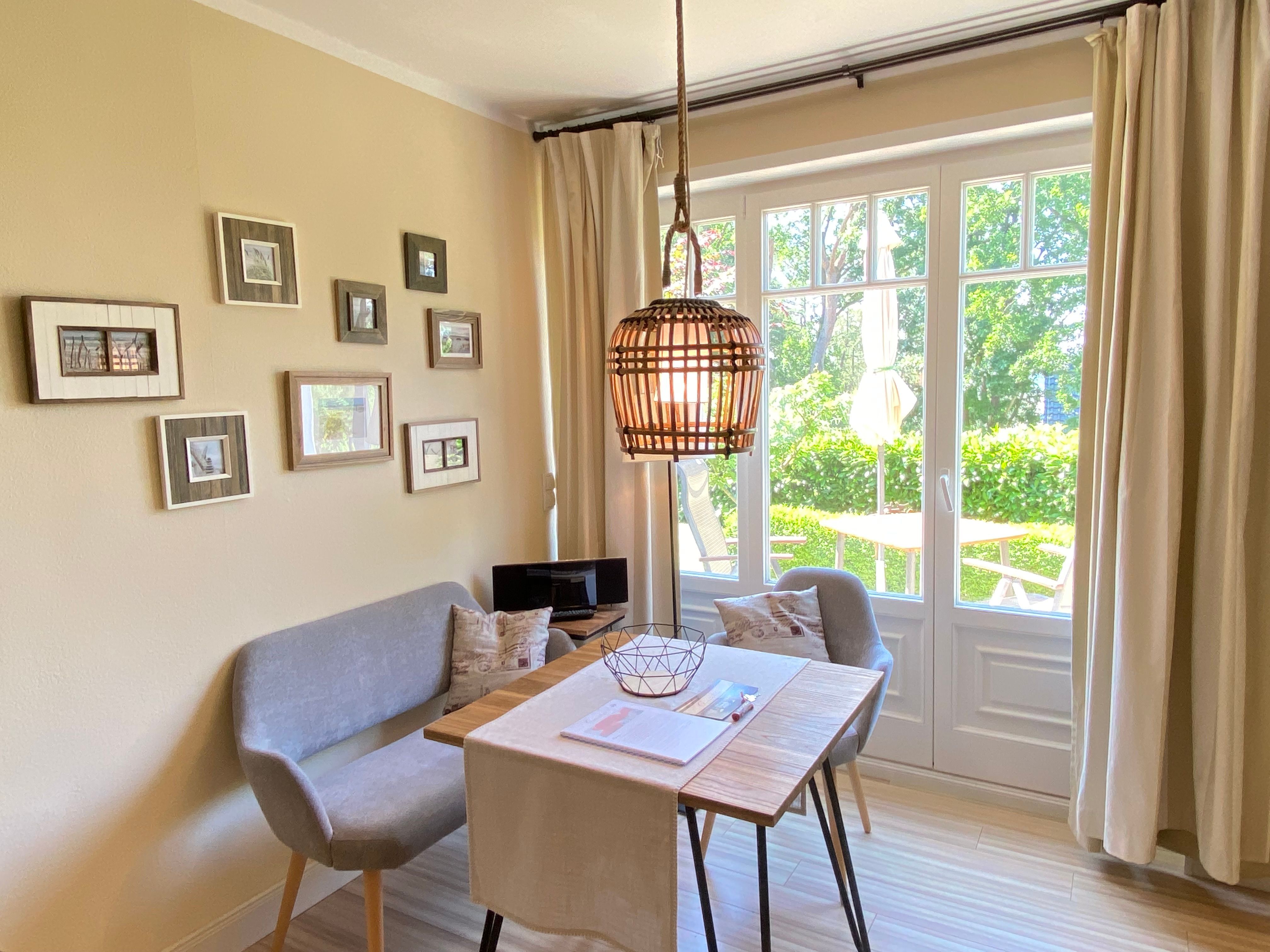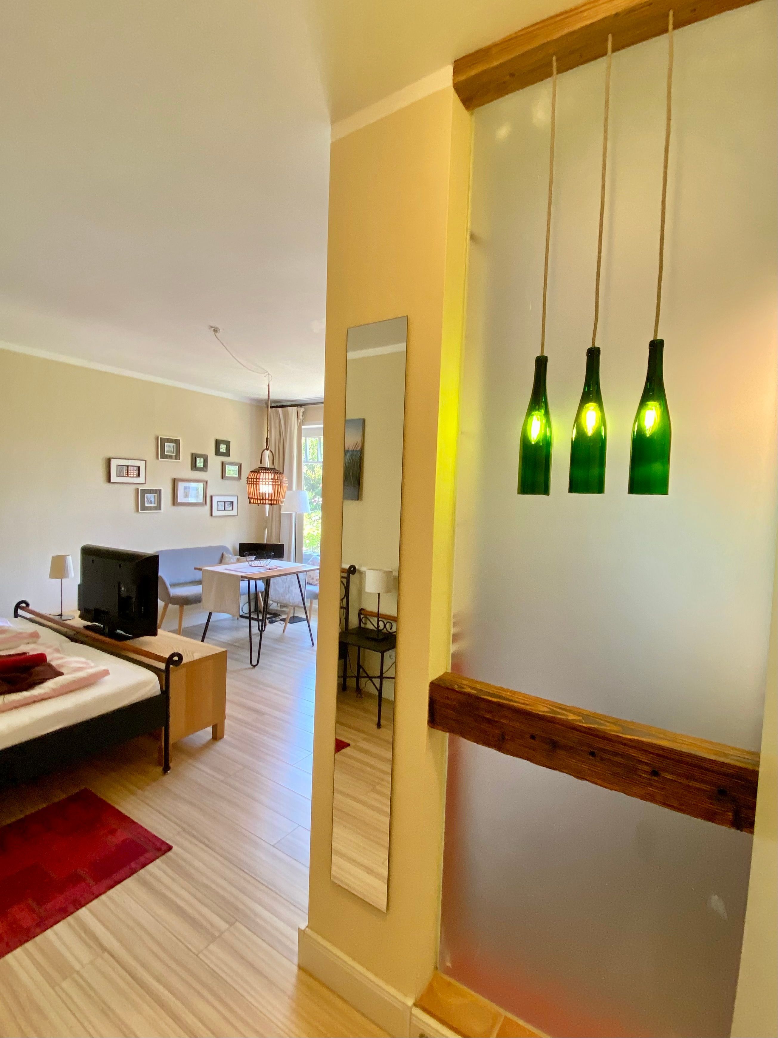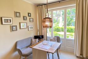 Eine kleine, raffiniert eingerichtete Wohnung für den Urlauber, der lieber am Strand oder auf Rügen unterwegs ist, als tagelang in seiner Ferienwohnung zu sitzen. Größe: ca. 26 m², sehr gemütlich und wie folgt eingerichtet: Fußbodenheizung, Laminat. Küchenzeile mit Flüsterkühlschrank, Cerankochfeld, Kaffeemaschine, Wasserkocher und Toaster. Doppelbett 200 x 180 cm, kleine Sitzgruppe. Bad mit Fön, WC und Dusche (120x80 cm). Die Dusche ist durch Milchglaswände vom Wohnraum abgetrennt. 40 Zoll Smart-TV, Kreafunk Bluetooth Lautsprecher. Gepflasterte Terrasse Richtung Westen mit Möblierung, Gartengrill und einer kleinen Liegewiese. Diese Wohnung ist geeignet für Alleinreisende, oder Pärchen. Eine Aufbettung ist nicht zu empfehlen.