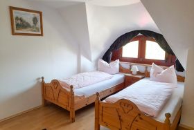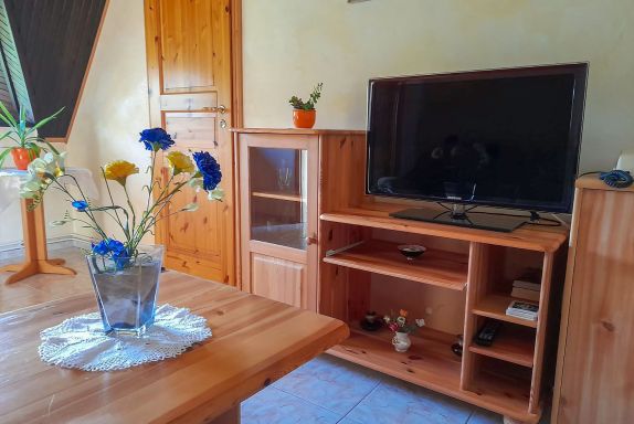 Die 3-Raum-Ferienwohnung Seekiste befindet sich in der ersten Etage eines reetgedeckten Hauses. Sie ist über einen separaten Eingang zu erreichen und bietet Platz für 2 - 4 Personen. Sie verfügt über zwei mit Naturholzmöbel eingerichtete Schlafzimmer, (im ersten Schlafzimmer befindet sich ein Doppelbett (getrennte Matratzen) und im zweiten Schlafzimmer zwei Einzelbetten), ein Wohnzimmer mit Sat-TV und Telefon sowie einer separaten kleinen Küche mit Essecke. Durch die Küche gelangen Sie in das kleine Bad mit Badewanne, und von da aus in das erste Schlafzimmer, welches ebenfalls ein Durchgangszimmer zum zweiten Schlafzimmer ist. Auf der vom zweiten Schlafraum zu begehenden Loggia finden Sie Ruhe und Entspannung nach einem erlebnisreichen Tag. Angeschlossen an die Ferienwohnung ist eine Sitzecke für Ihre private Nutzung.