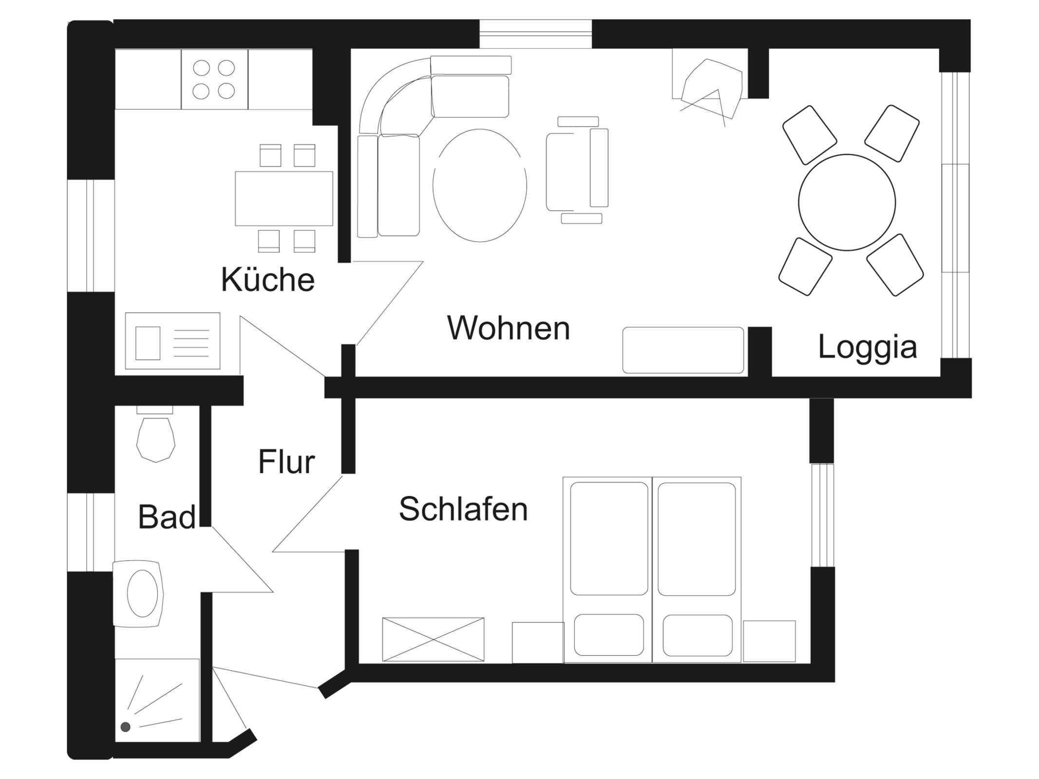 Für 1-4 Personen, 55 qm, Küche mit Küchenzeile und Esstisch, DU/WC, im EG oder 1. OG, Blick zum Waldrand.
