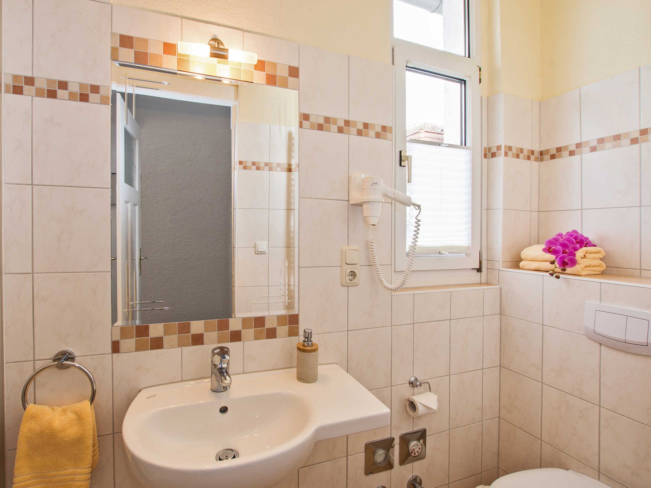 Ferienwohnung (55 qm) im EG oder 1. OG im Seitenflügel hinter der Villa, geräumiges Wohnzimmer mit geschlossener Veranda und Esstisch mit Waldblick, TV, separate Küche mit Spülmaschine, 1 Schlafzimmer, Bad mit Dusche, Waschbecken und WC.