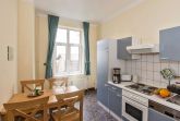 Ferienwohnung (55 qm) im EG oder 1. OG im Seitenflügel hinter der Villa, geräumiges Wohnzimmer mit geschlossener Veranda und Esstisch mit Waldblick, TV, separate Küche mit Spülmaschine, 1 Schlafzimmer, Bad mit Dusche, Waschbecken und WC.