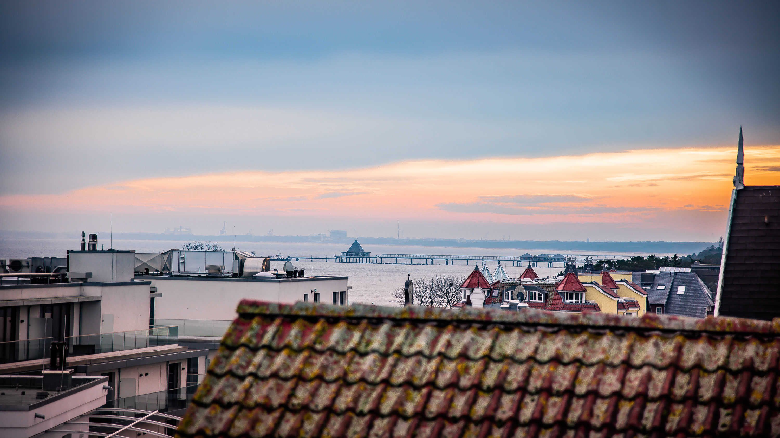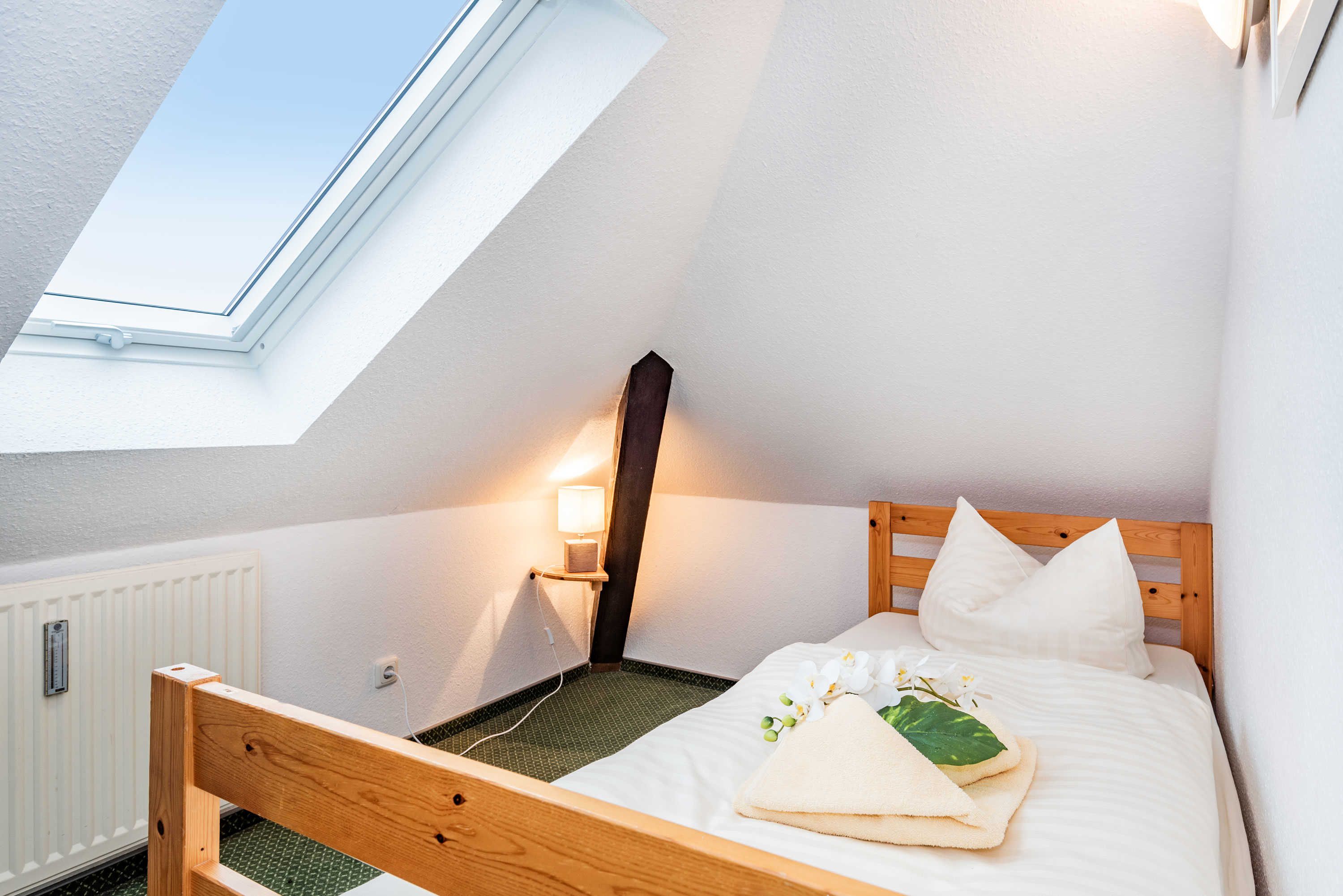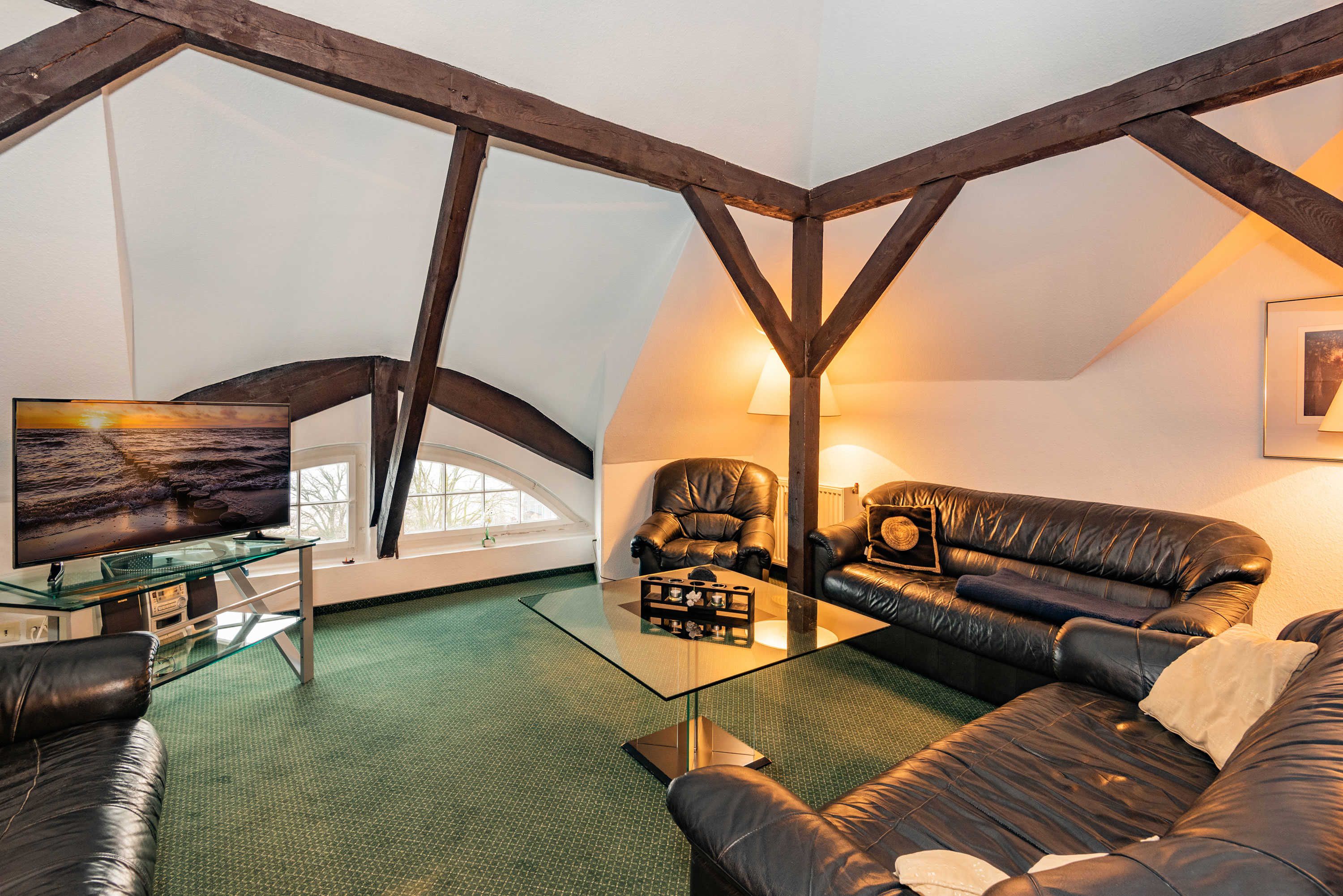 Das Dachstudio (96 qm) hat ein großes und sehr gemütliches Wohnzimmer mit phantastischem Meerblick, Küche mit Spülmaschine und Gefriertruhe, Küchentheke mit zwei Barhockern, 4 Schlafräume mit insgesamt 7 Betten, Bad/WC und zusätzlich ein Gäste-WC. Der gesamte Wohnbereich hat Stehhöhe.