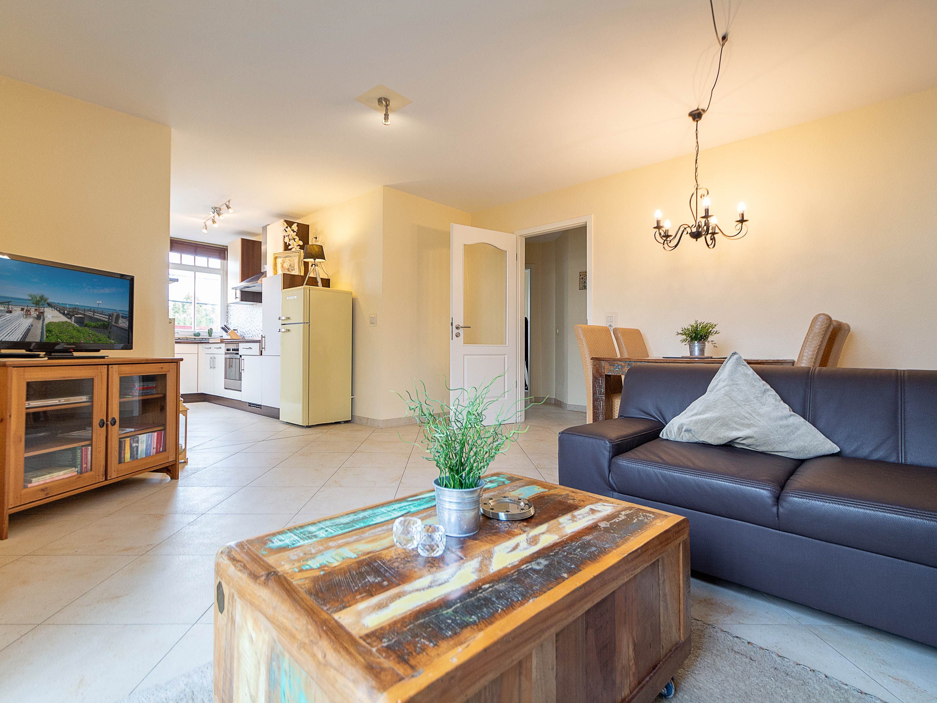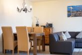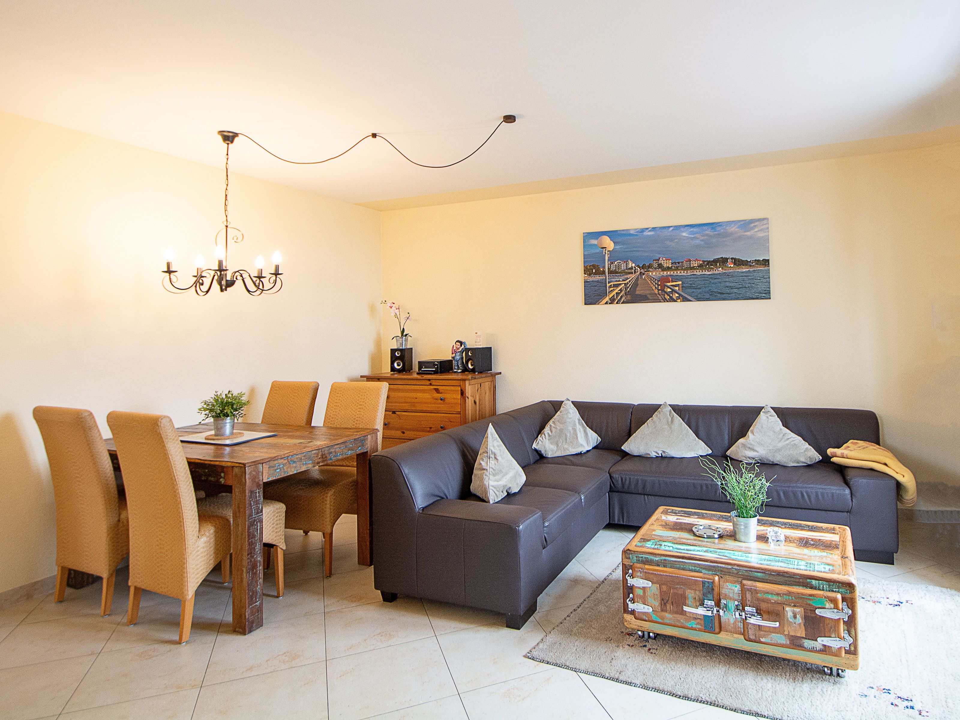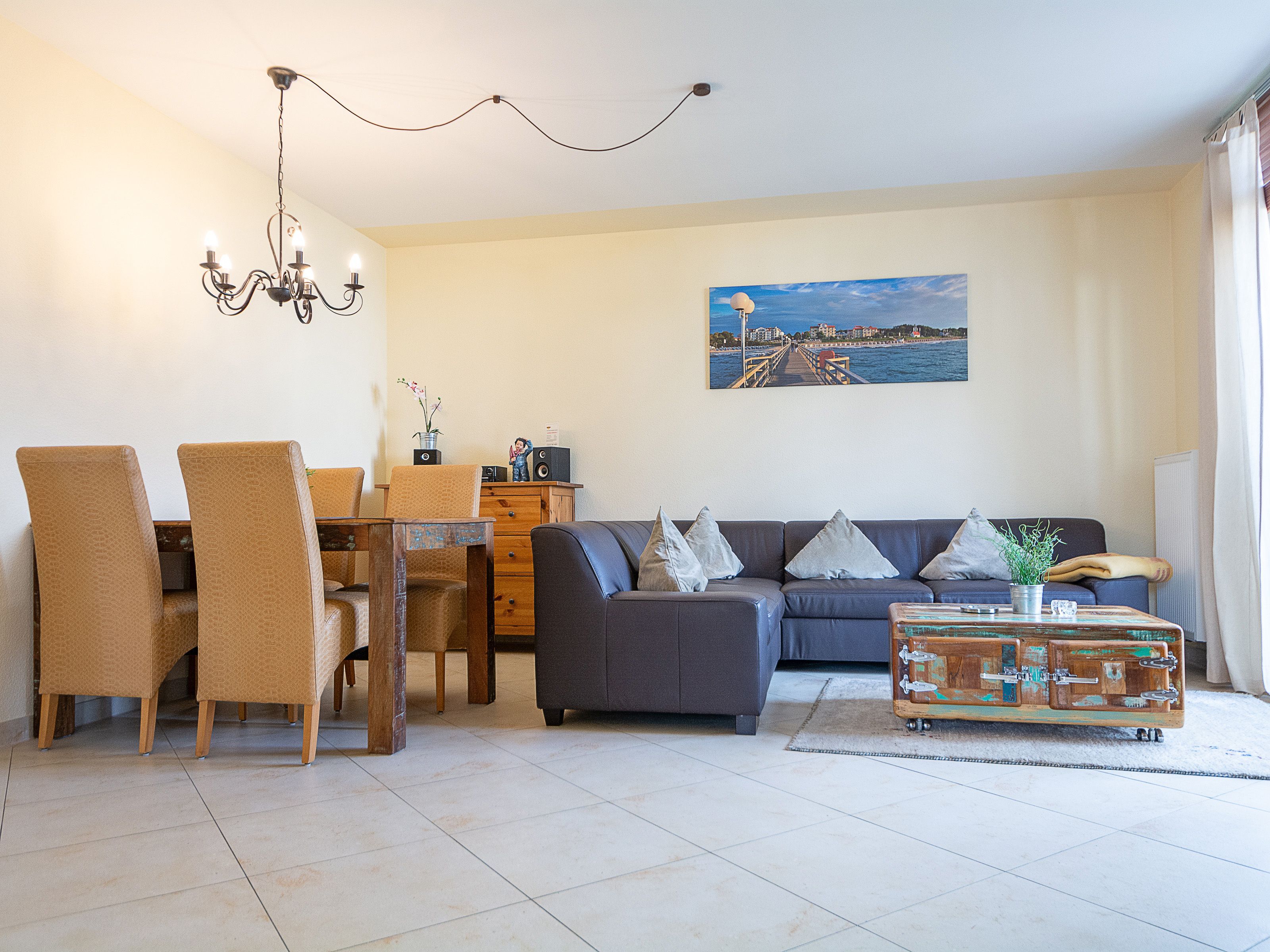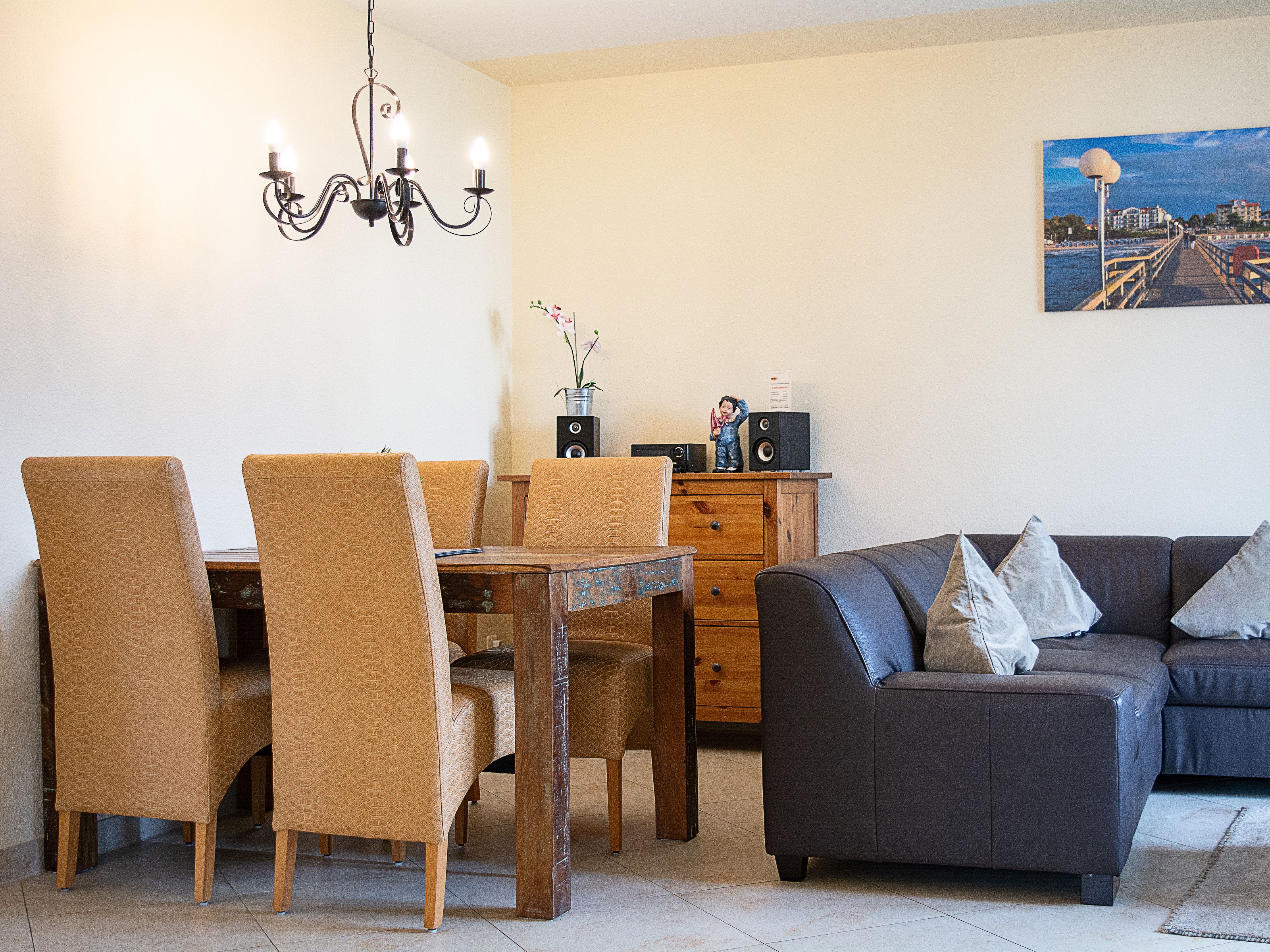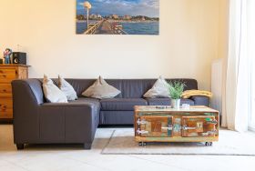 Sie wohnen in einer sehr geschmackvoll eingerichteten 3-Raum-Wohnung von ca. 68 qm Größe, die im ersten Obergeschoss liegt. Das Wohnzimmer ist ausgestattet mit Küchenzeile (Herd mit Backofen, Geschirrspüler, Kaffeemaschine, Wasserkocher, Toaster, Mikrowelle), bequemer Sitzgruppe, Essecke, Stereoanlage und TV-Gerät. Vom Wohnraum aus betreten Sie den Balkon in Richtung Westen, der zum Entspannen einlädt. Ein Schlafzimmer mit Doppelbett und ein Schlafzimmer mit Etagenbett sowie das Bad mit Dusche und WC vervollständigen das Gesamtbild dieser Wohnung.