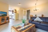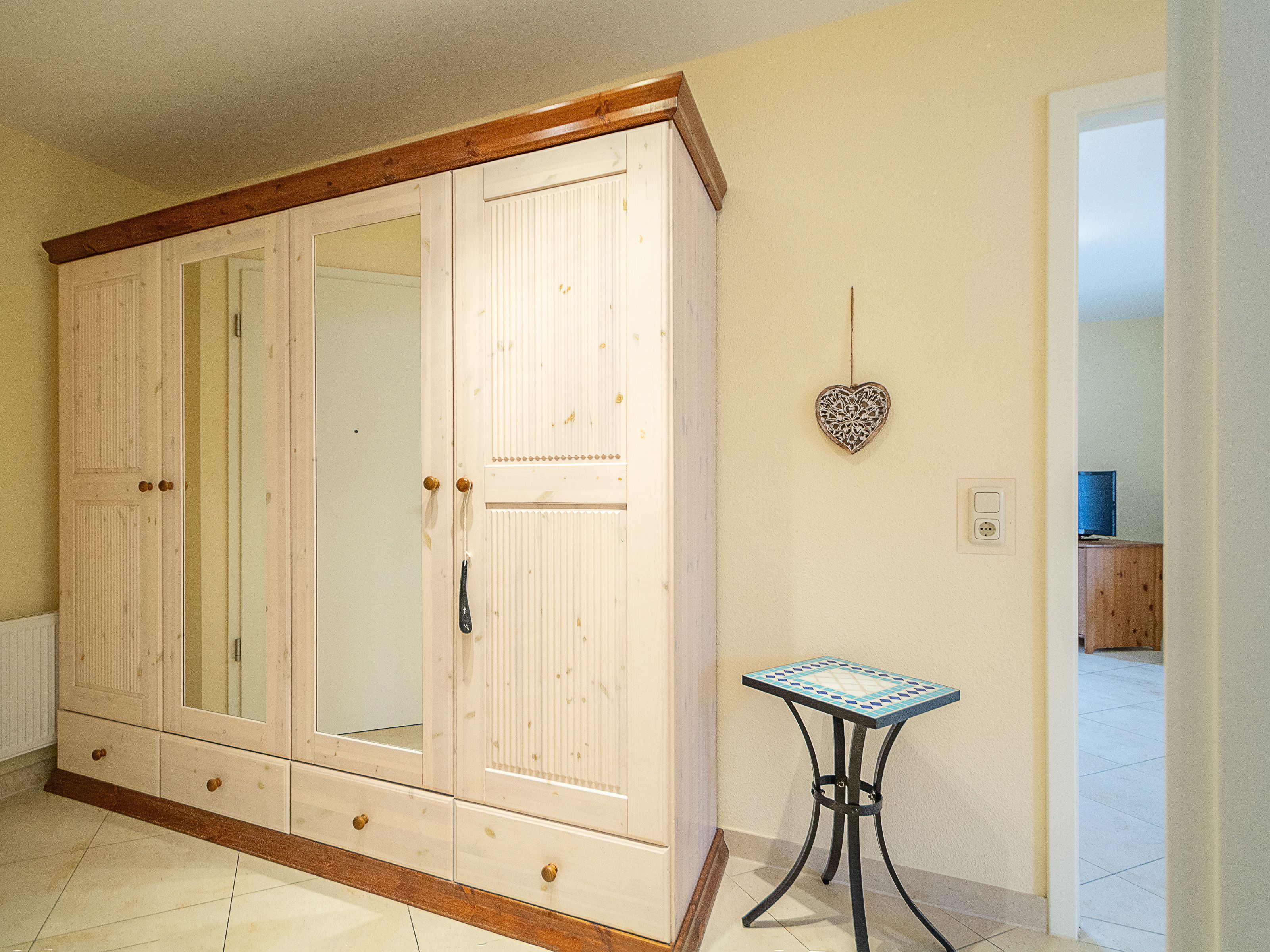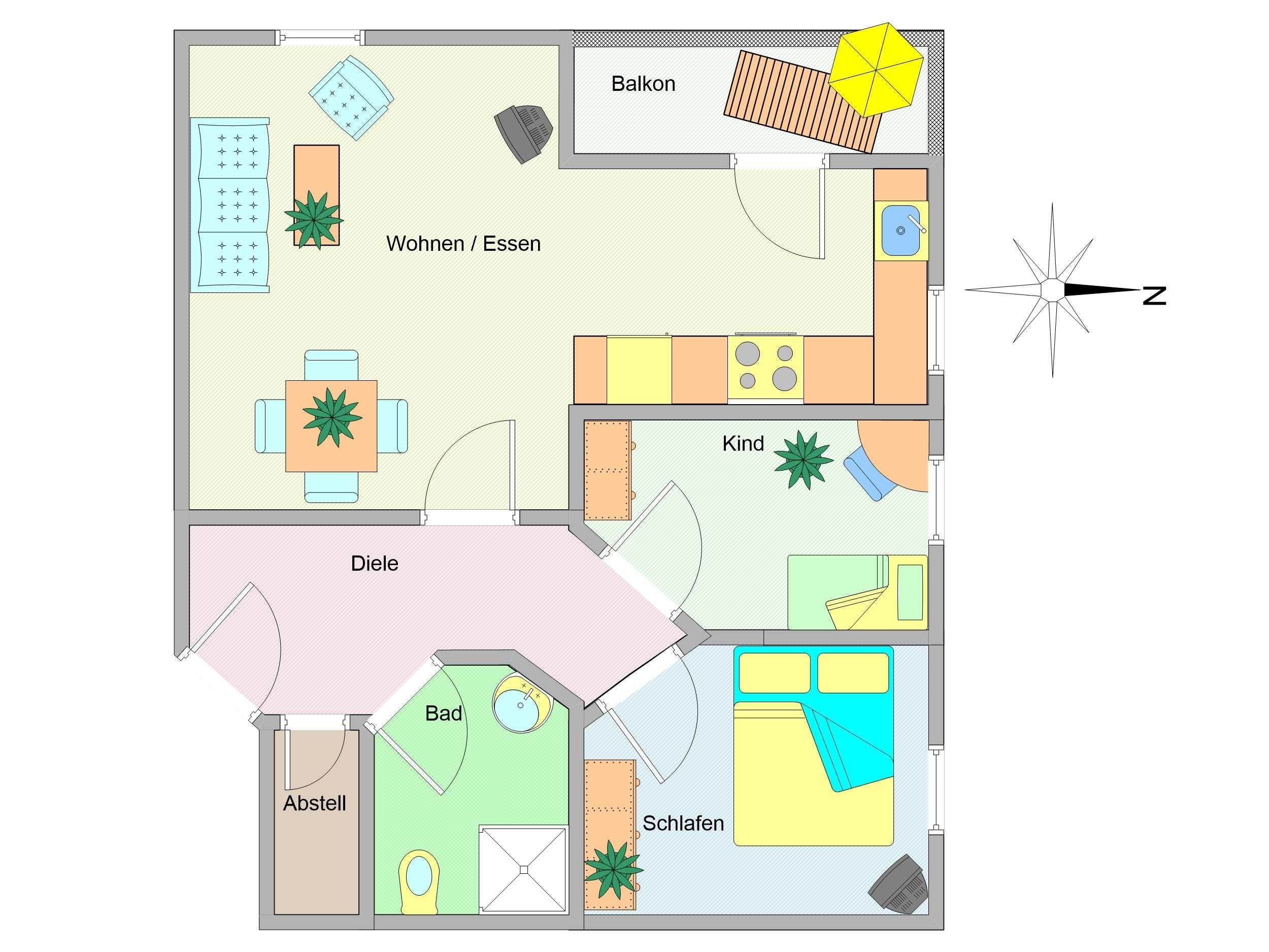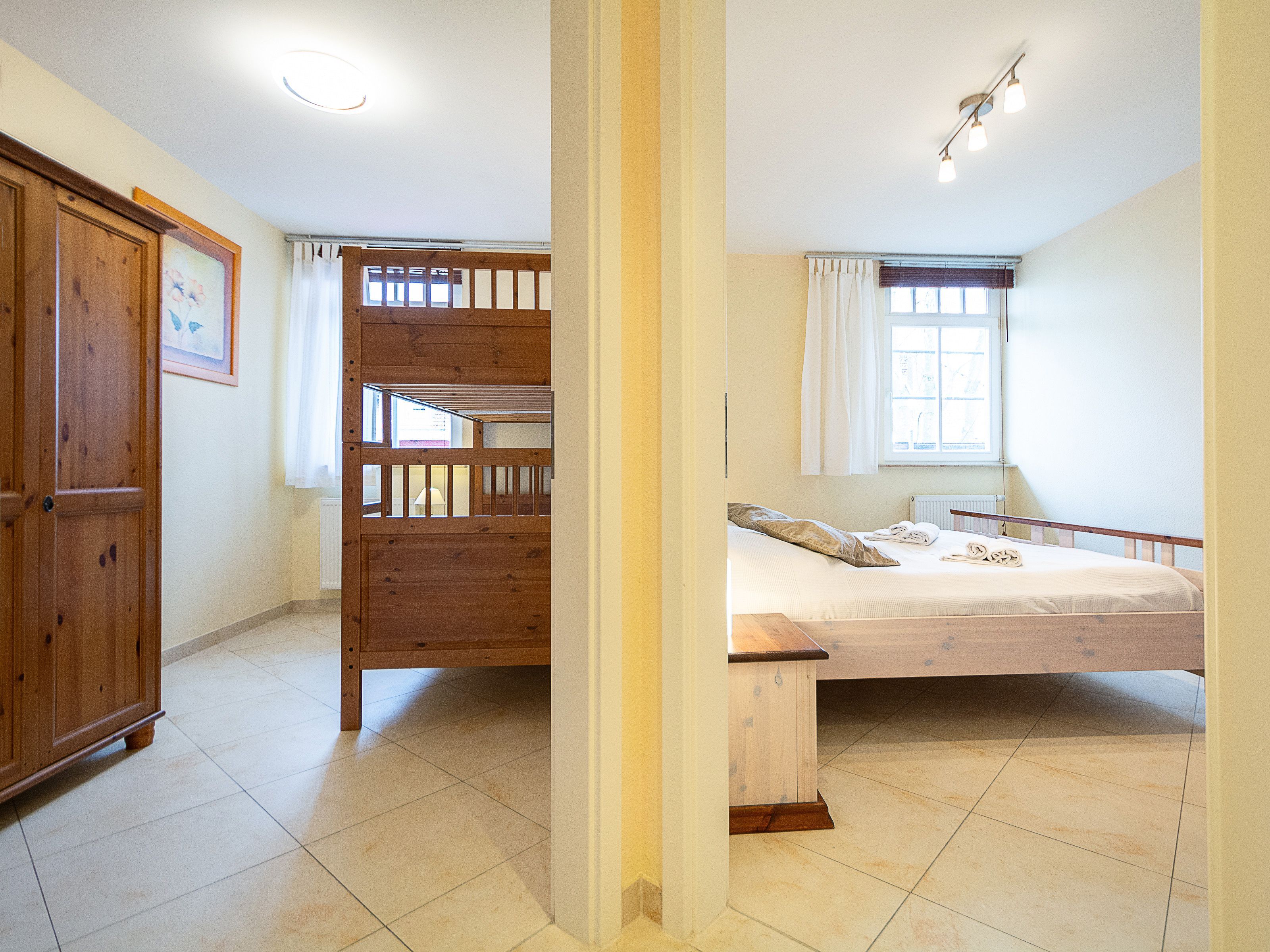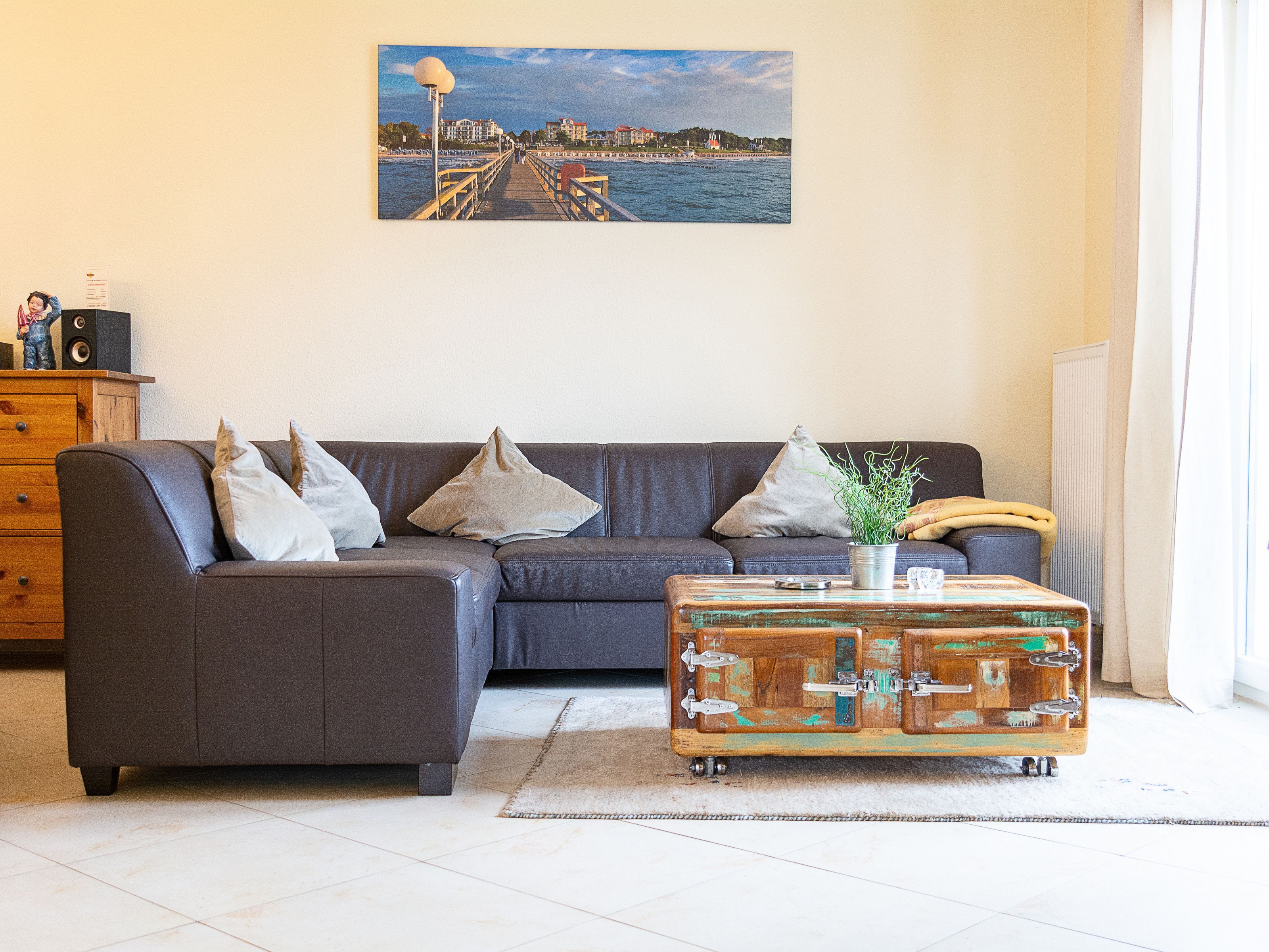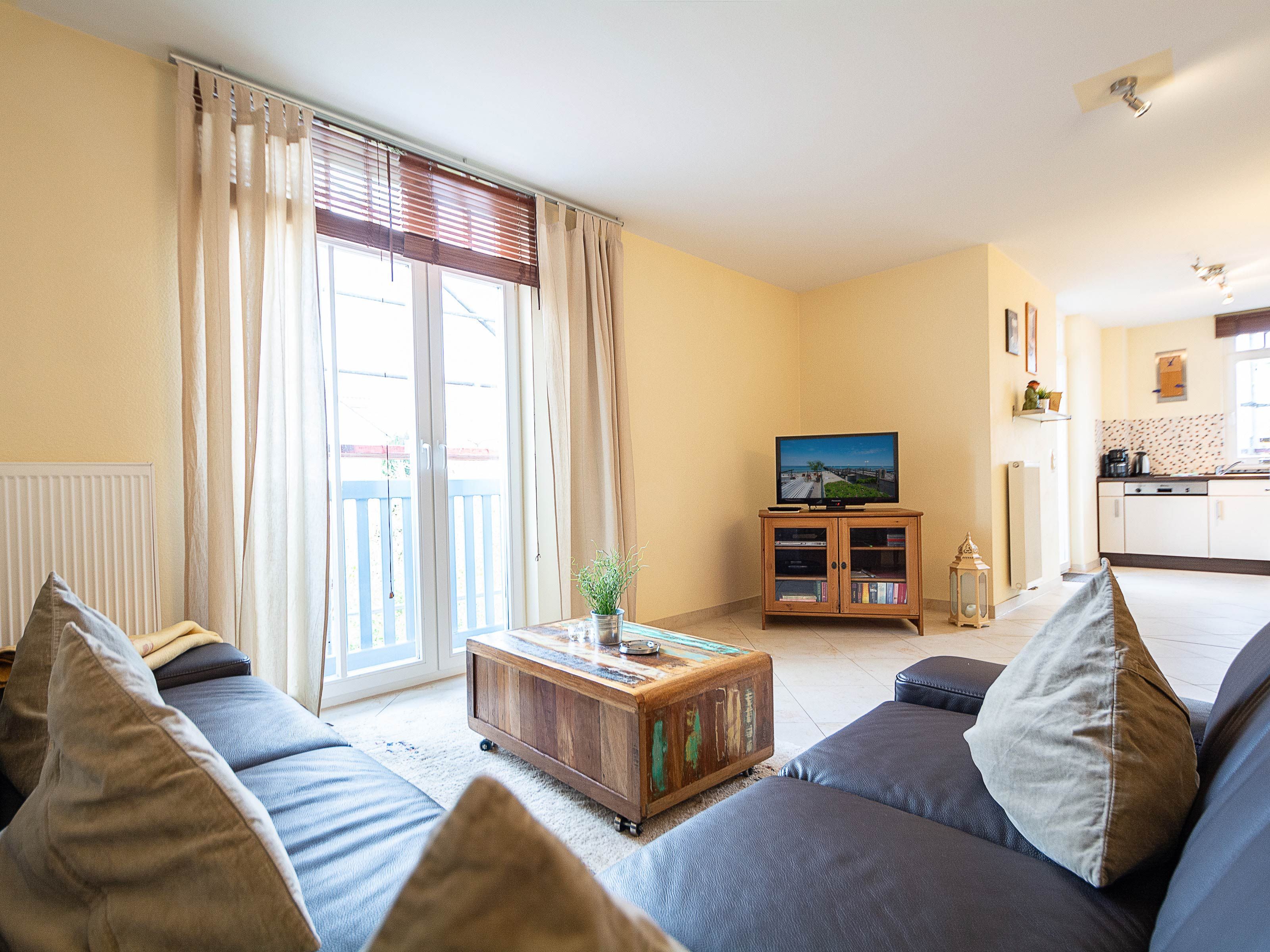 Sie wohnen in einer sehr geschmackvoll eingerichteten 3-Raum-Wohnung von ca. 68 qm Größe, die im ersten Obergeschoss liegt. Das Wohnzimmer ist ausgestattet mit Küchenzeile (Herd mit Backofen, Geschirrspüler, Kaffeemaschine, Wasserkocher, Toaster, Mikrowelle), bequemer Sitzgruppe, Essecke, Stereoanlage und TV-Gerät. Vom Wohnraum aus betreten Sie den Balkon in Richtung Westen, der zum Entspannen einlädt. Ein Schlafzimmer mit Doppelbett und ein Schlafzimmer mit Etagenbett sowie das Bad mit Dusche und WC vervollständigen das Gesamtbild dieser Wohnung.