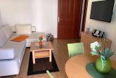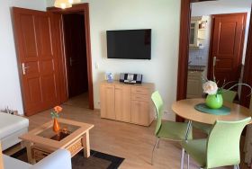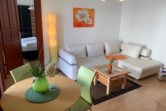 Die stilvoll eingerichtete Nichtraucher-Ferienwohnung mit einer Größe von ca. 50 qm befindet sich ebenerdig in der Villa Medici. Geschmackvoll eingerichtet bietet sie ein Wohnzimmer mit einer Doppelbettschlafcouch, Flat-TV und Esstisch sowie ein separates Schlafzimmer mit Boxspringbett und Kleiderschrank. Die moderne Einbauküche verfügt über ein Cerankochfeld, Backofen, Mikrowelle, Kaffeemaschine, Wasserkocher und Toaster. Das Badezimmer ist mit einer Badewanne sowie einer Dusche, WC und Bidet ausgestattet.