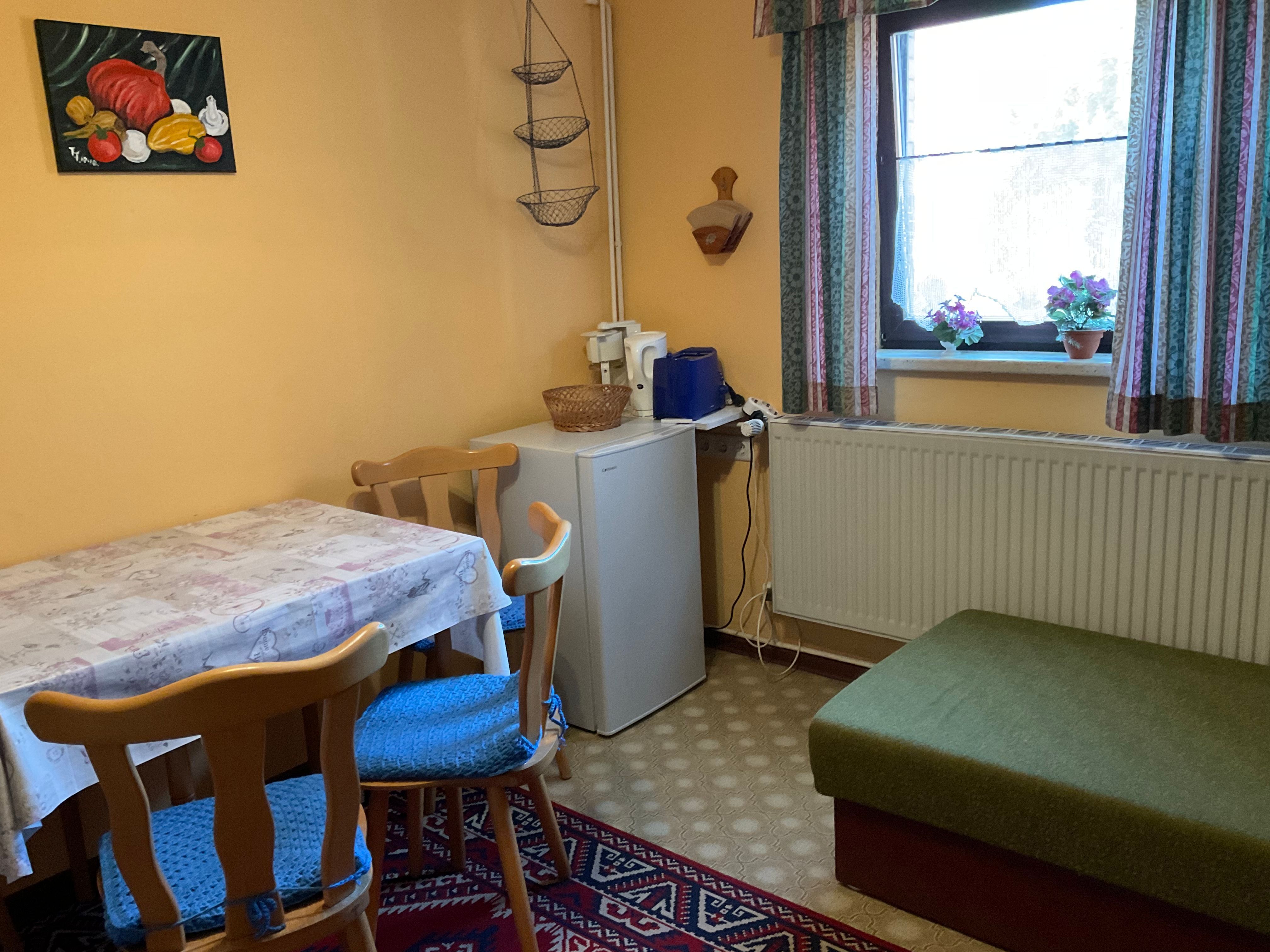 Die Ferienwohnung ist sehr einfach ausgestattet und besteht aus einem Wohn-Schlafraum, durch einen Raumteiler getrennt mit Radio und TV und einer Sitzecke. und einem weiteren Zimmer mit zwei Aufbettungsmöglichkeiten auf Bettliegen. Sie hat eine kleine Pantry-Küche und ein Bad mit Dusche und WC.