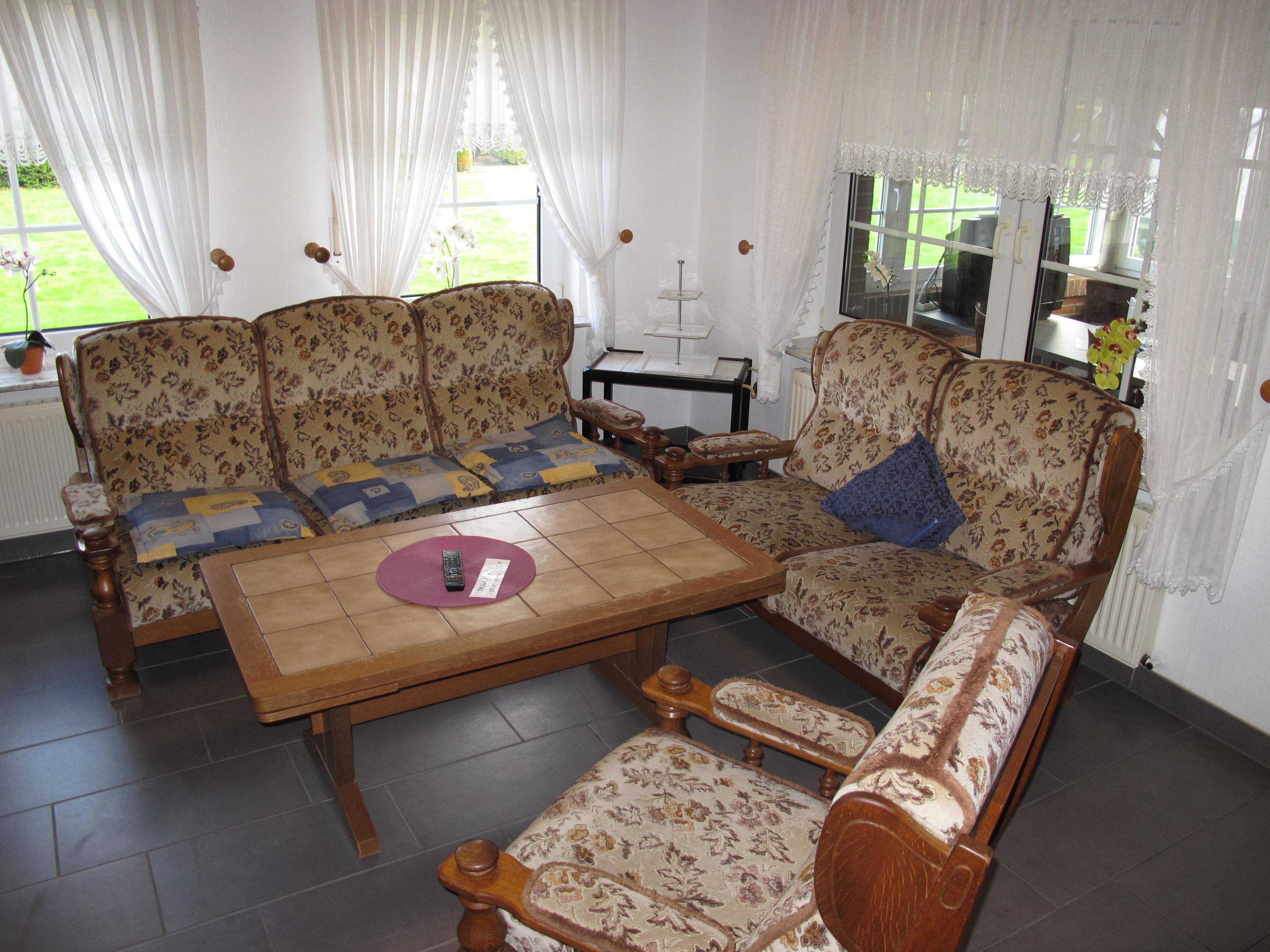 Das gepflegte Ferienhaus ist gut und funktionell ausgestattet und rustikal-gemütlich eingerichtet. Fliesenböden; in den Schlafzimmern im Dachgeschoß Teppichböden. Mehrere Sat-TV, DVD, Internet (WLAN, kostenlos). 3x Waschmaschine und 3x Trockner, Das ganze Haus und der Wintergarten mit Gas-Zentralheizung.