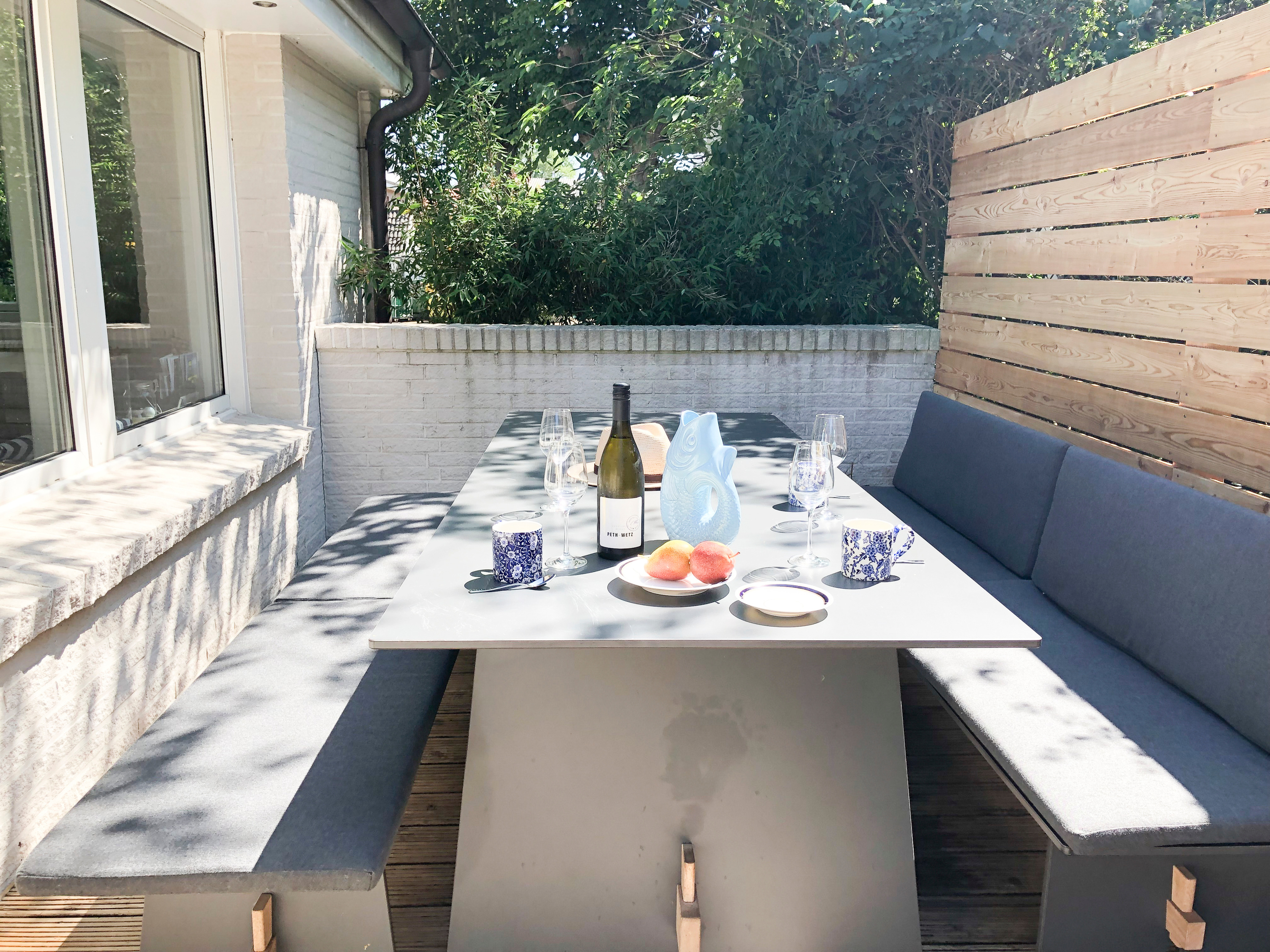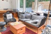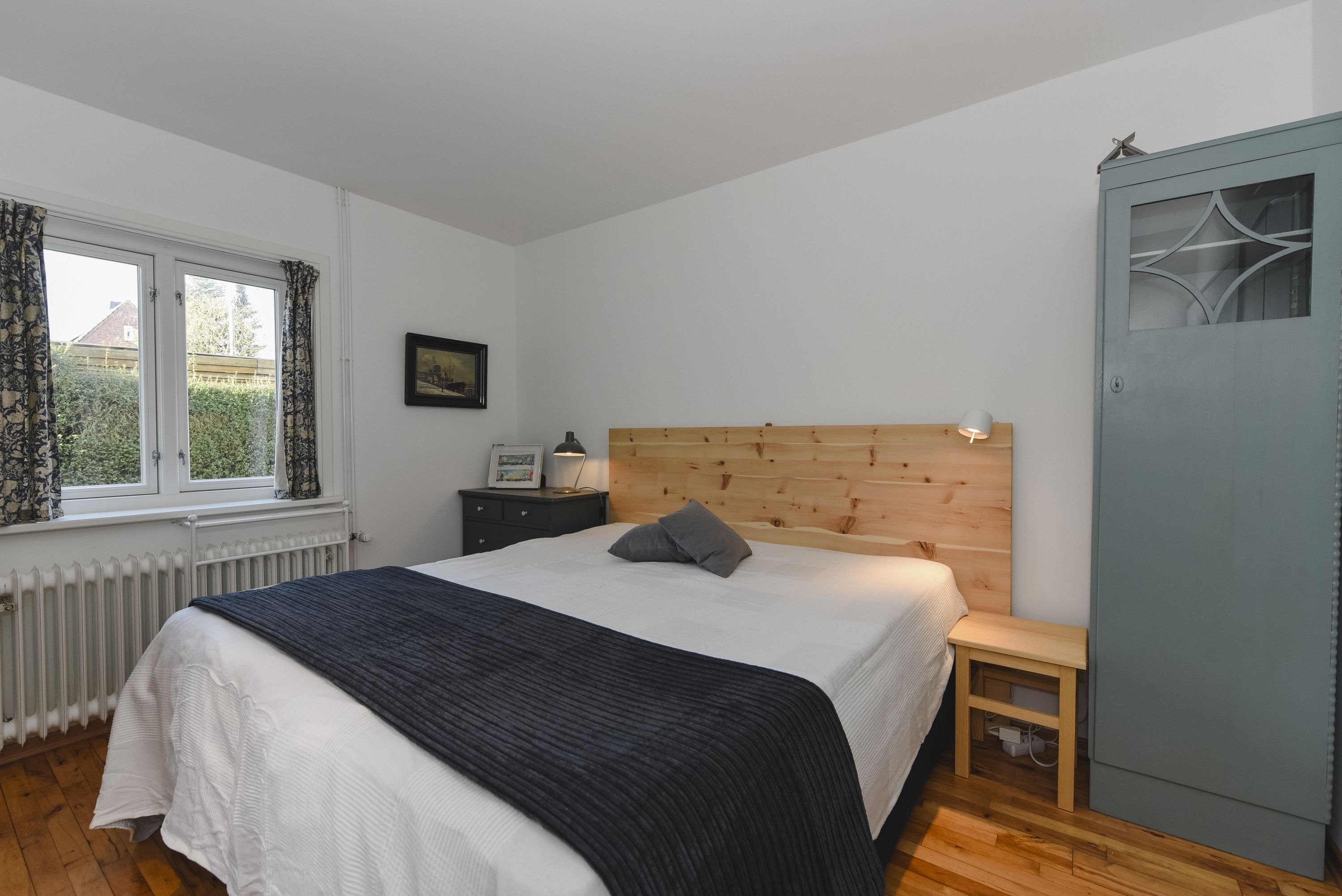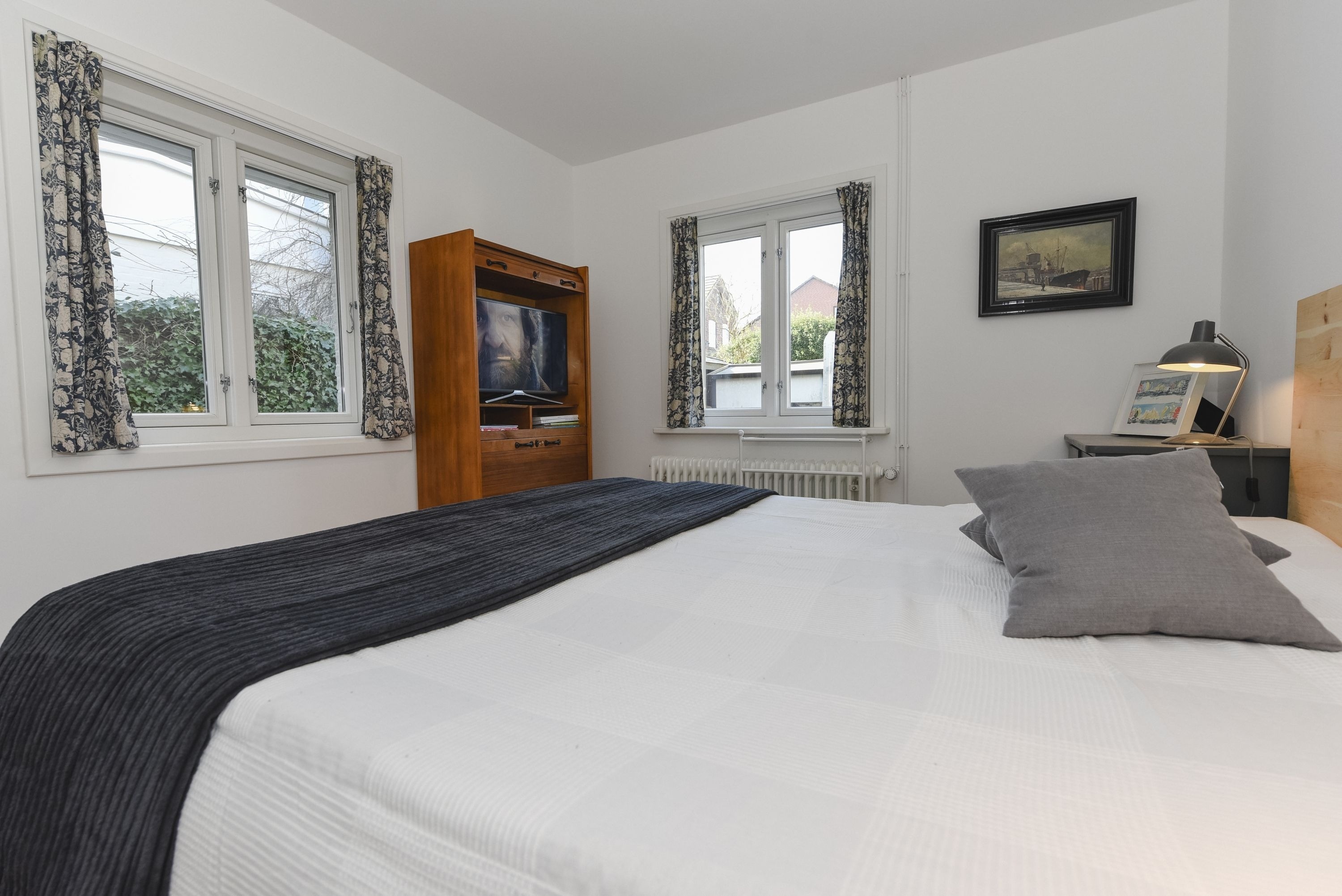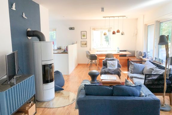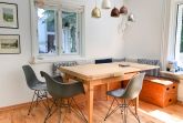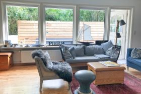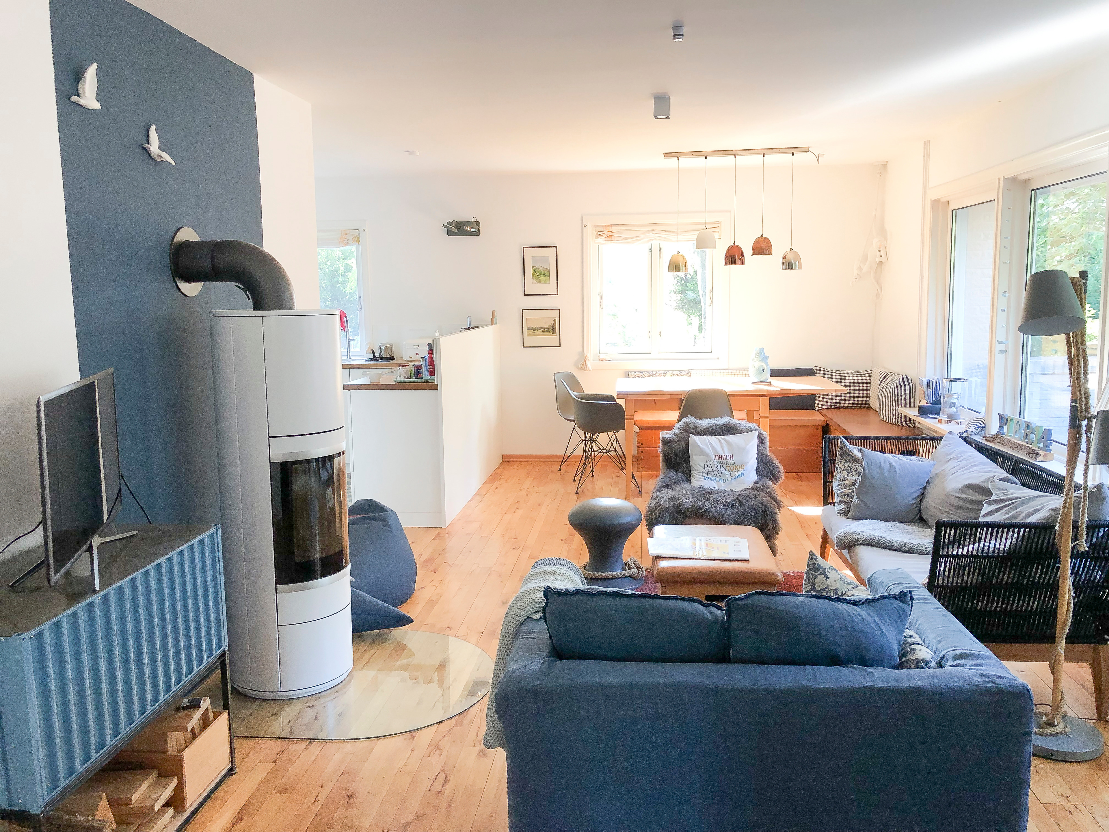 Trotz der zentralen Lage genießen Sie auf dem eingewachsenen Grundstück in einer ruhigen Einbahnstraße erholsame Momente und viel Privatsphäre. Das Haus wurde mit viel Liebe und einem Blick für besondere Details renoviert und überzeugt durch geschmackvolles Design und eine warme, einladende Atmosphäre. Der Kamin im Wohnzimmer mit großem Sichtfenster wird schnell zum Mittelpunkt Ihres Aufenthalts – hier können Sie bei einem prasselnden Feuer entspannen. Große Fensterfronten lassen viel Sonnenlicht in das Haus und sorgen für eine helle, freundliche Stimmung. Der Essbereich bietet genügend Platz für gesellige Runden mit Familie oder Freunden und führt Sie direkt auf die Holzbohlenterrasse mit Gartenmöbeln, wo Sie Ihre Mahlzeiten oder einfach die frische Luft genießen können.
