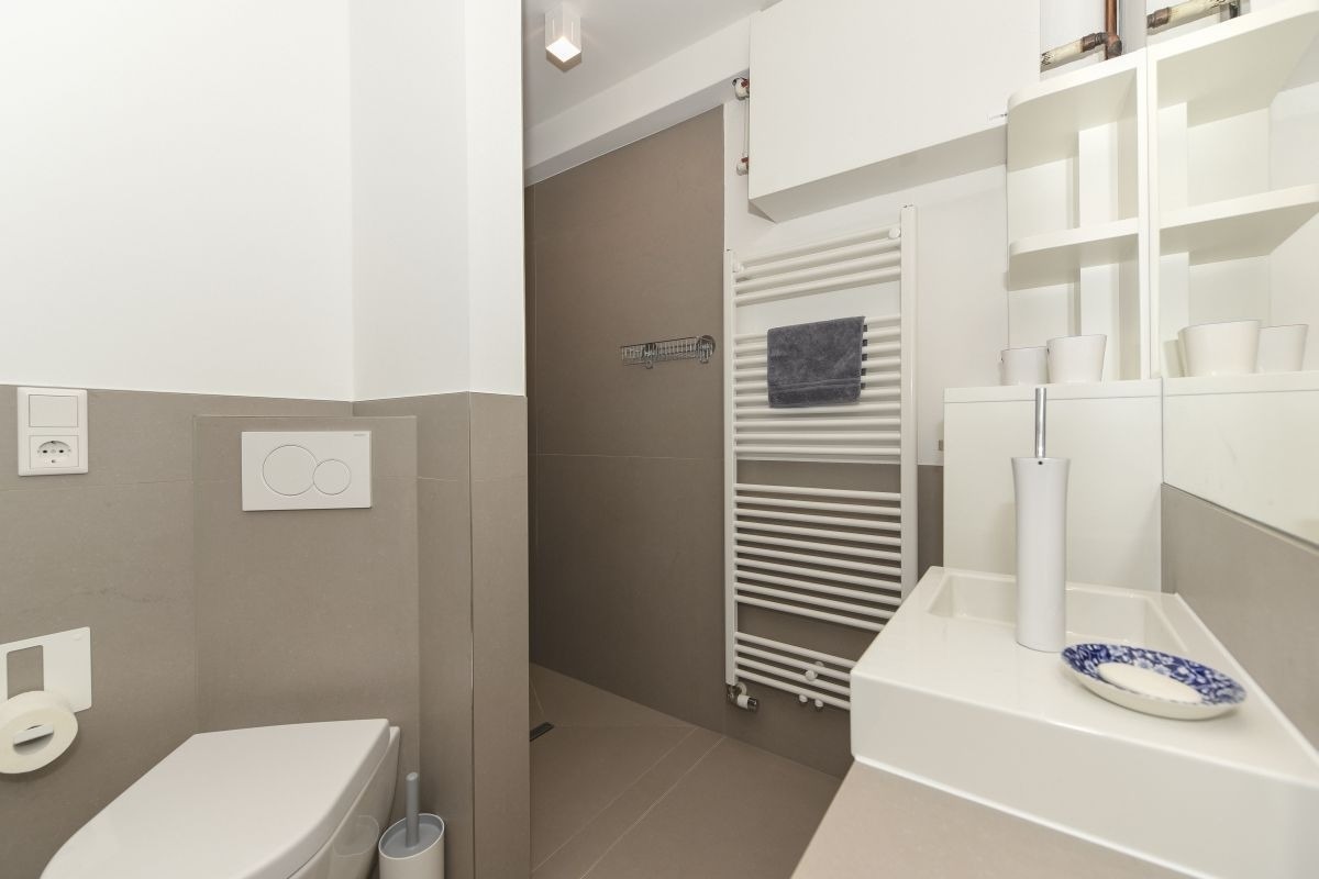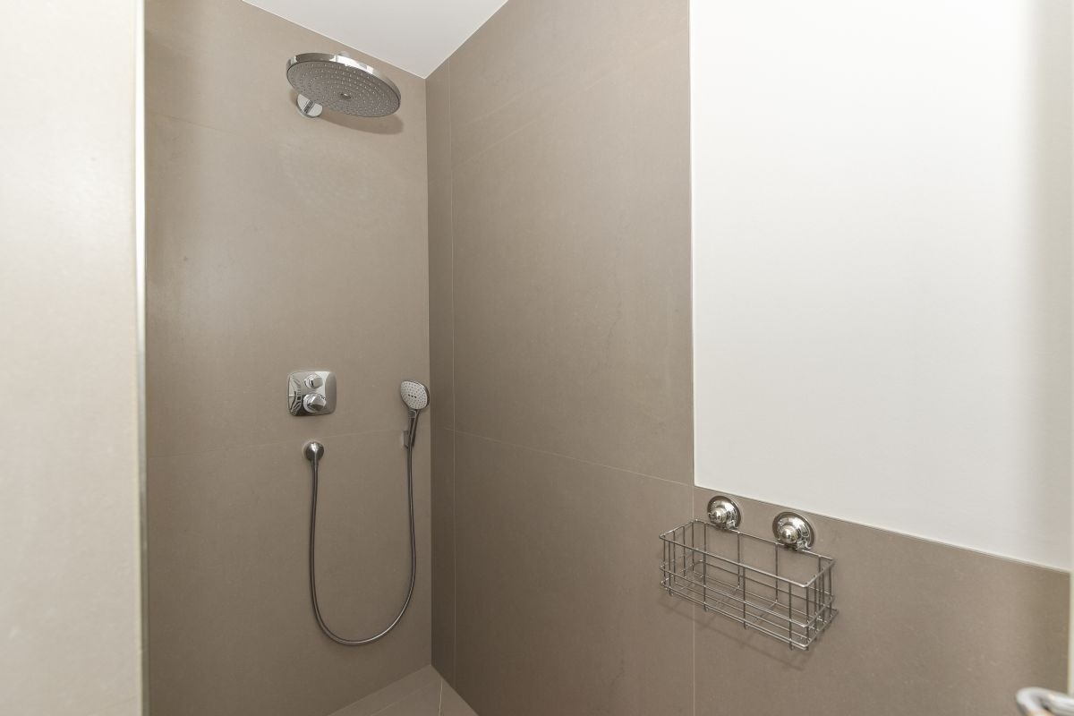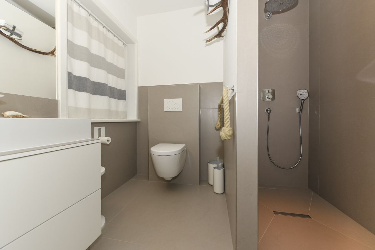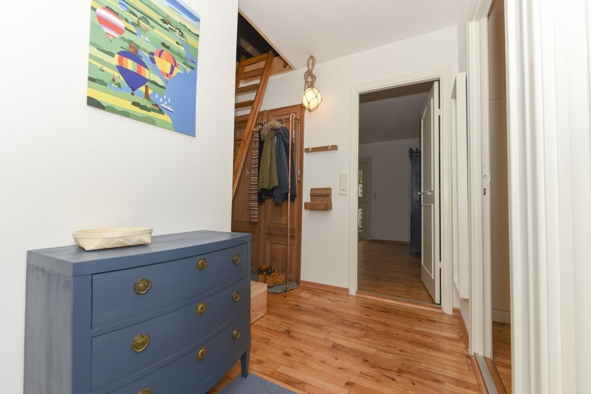 Die geräumige Diele bietet ausreichend Platz für Ihre Gummistiefel, Flip-Flops und Wanderschuhe. Vom Flur aus gelangen Sie zu einem der Duschbäder mit einer ebenerdigen Regendusche und einer großen Handtuchheizung. Ein weiteres Bad befindet sich direkt an der Küche, und hier stehen Ihnen auch eine Waschmaschine und ein Wäschetrockner zur Verfügung.