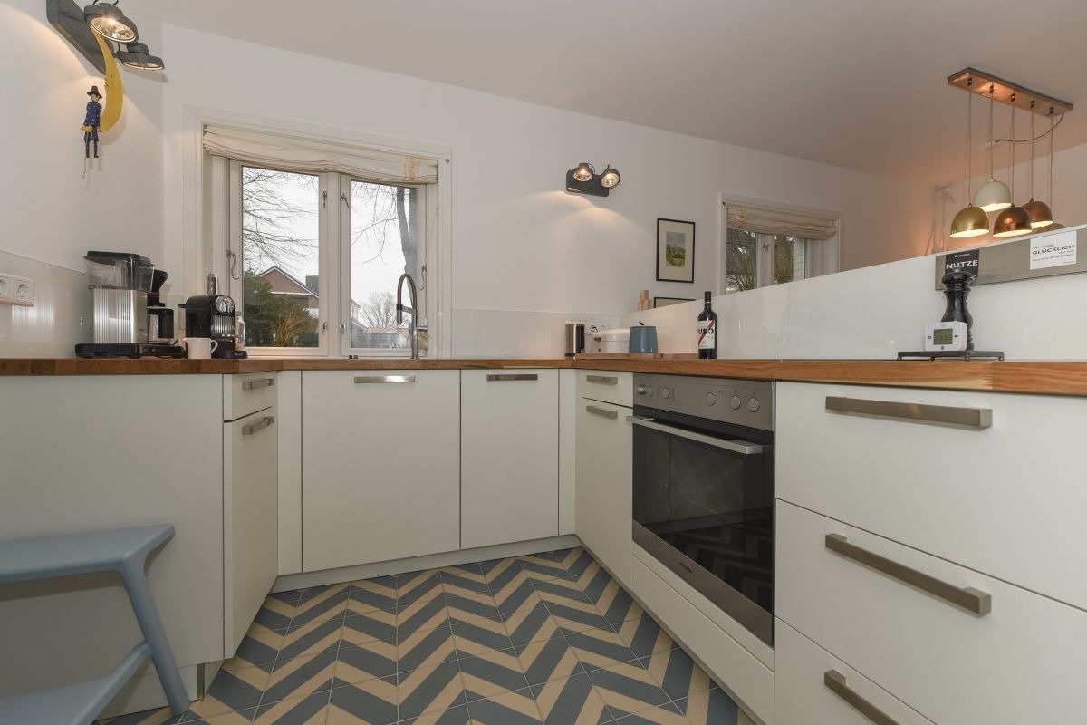 Die offene Küche wurde harmonisch in den Wohnbereich integriert und lädt zu kreativen Kocherlebnissen ein. Mit einer hochwertigen Ausstattung macht das Zubereiten von Mahlzeiten hier richtig Spaß.