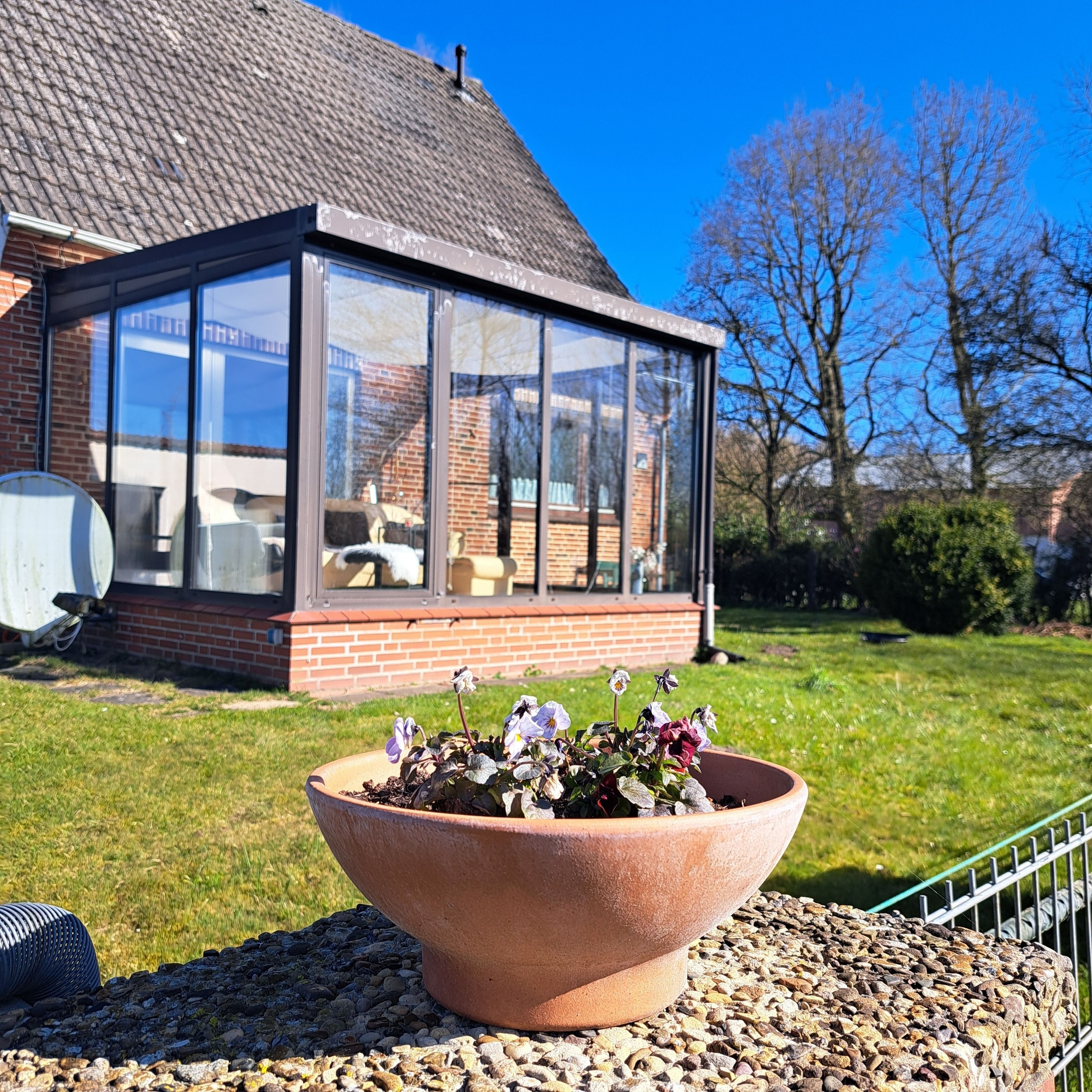 Das gesamte Haus ist mit Außenjalousien ausgestattet. Auf dem großzügigen 1000 Quadratmeter großen Grundstück finden Sie eine kleine Terrasse mit Gartenmöbeln und Grillmöglichkeit sowie einen Stellplatz für ein Auto. Ein kleiner Teich und eine überdachte Außenterrasse komplettieren das Bild. Das Grundstück ist eingezäunt und somit besonders hundefreundlich.