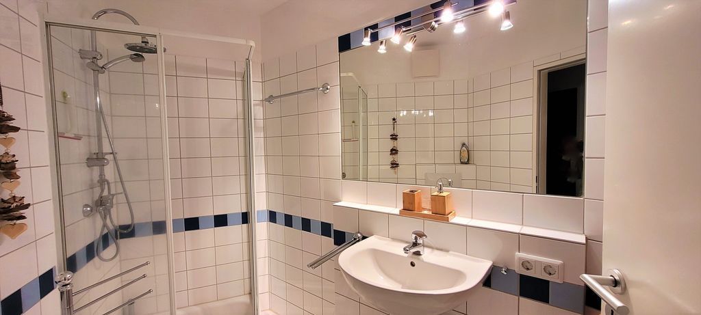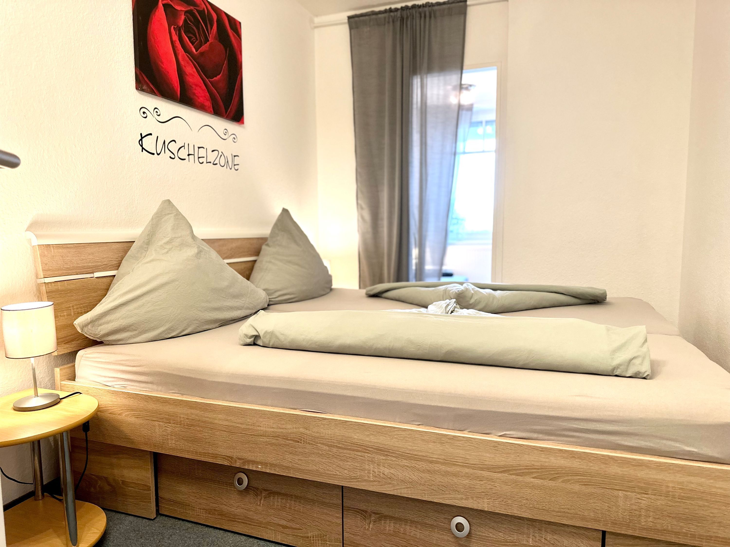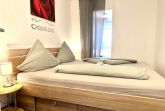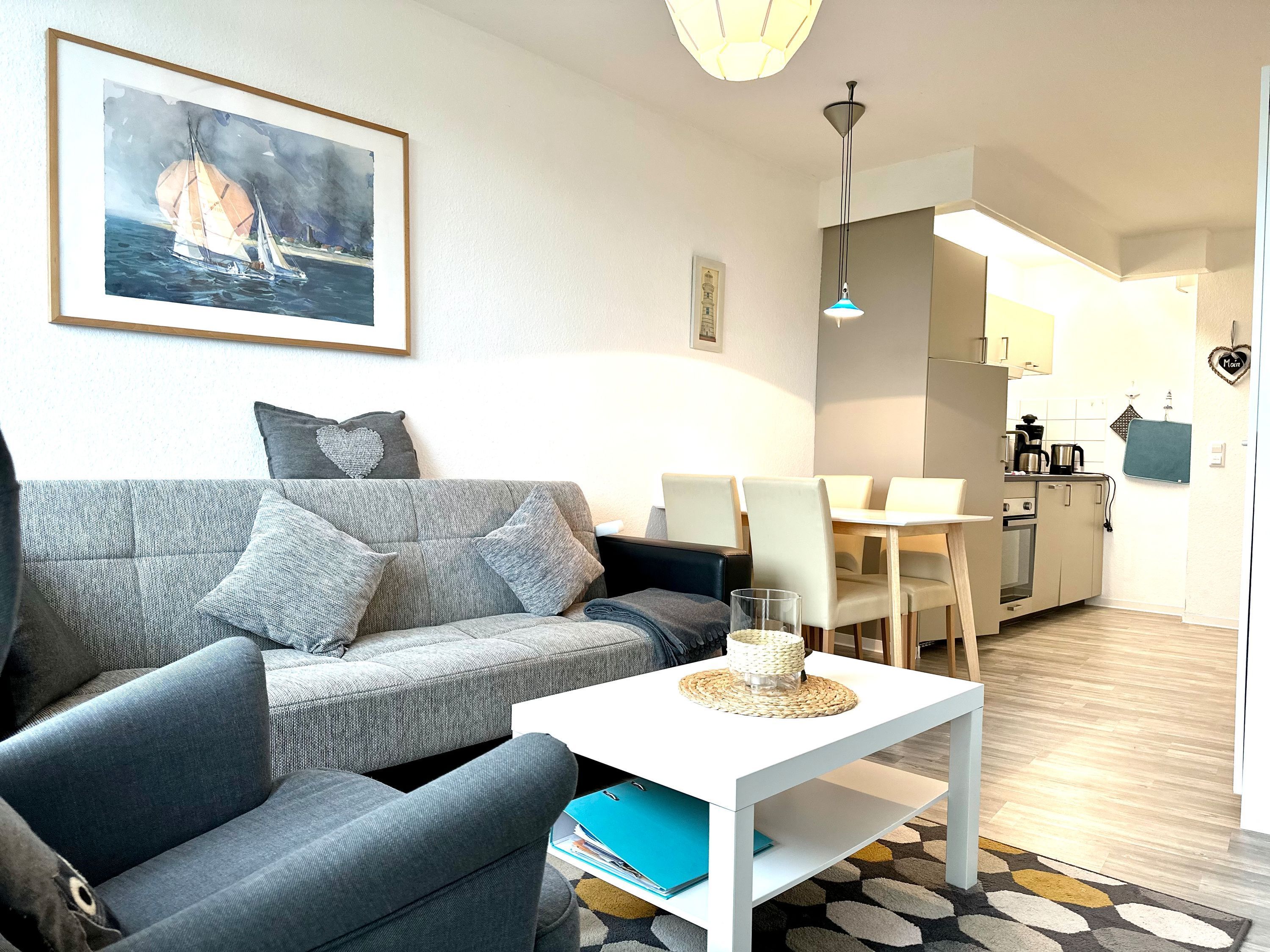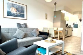 Unsere komplett ausgestattete Komfortferienwohnung J102 ist ca. 46 qm groß und verfügt über 1 Schlafzimmer mit Doppelbett und einem Schlafsofa (1,30mx1,91m)(passender Matratzenschoner im Bettkasten des Sofas), 1 Wohnschlafzimmer mit Essecke und Küche mit Backofen, Sat-TV, Bad mit Dusche, einer großen Terrasse. Das Rauchen ist in der Wohnung nicht erlaubt,
