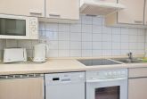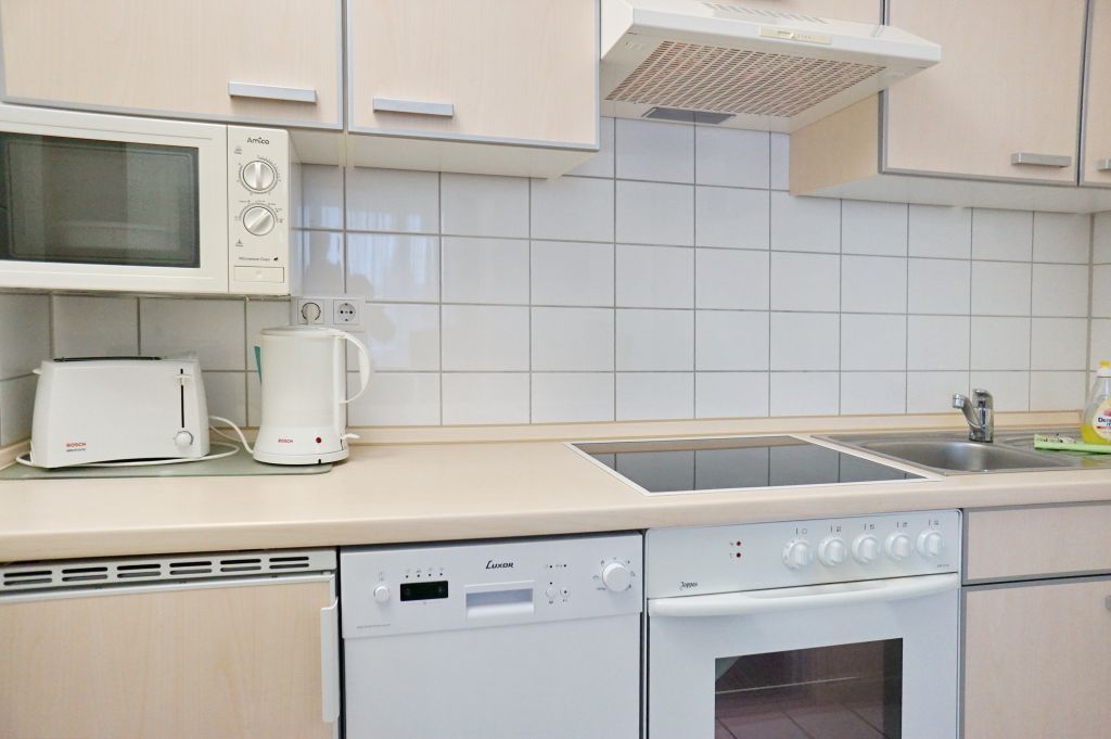 Die durch Glaswand getrennte Küche verfügt über Kühlschrank, Herd mit Backofen, Mikrowelle und Geschirrspüler.