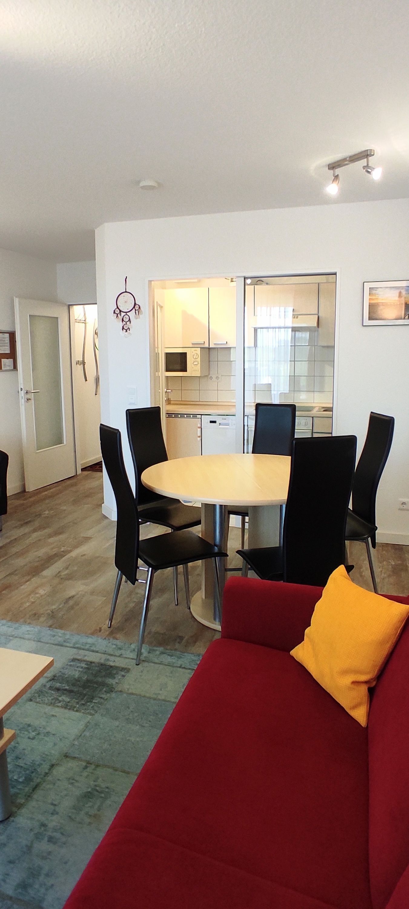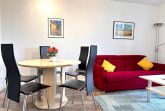 Das Wohnzimmer hat zwei Sessel, Schlafsofa, einen Couchtisch, eine Schrankwand mit SAT-TV (LCD) und Blu-ray-/DVD/CD-Player, Internet/WLAN, Telefon (deutsches Festnetz) sowie eine Essecke.