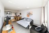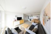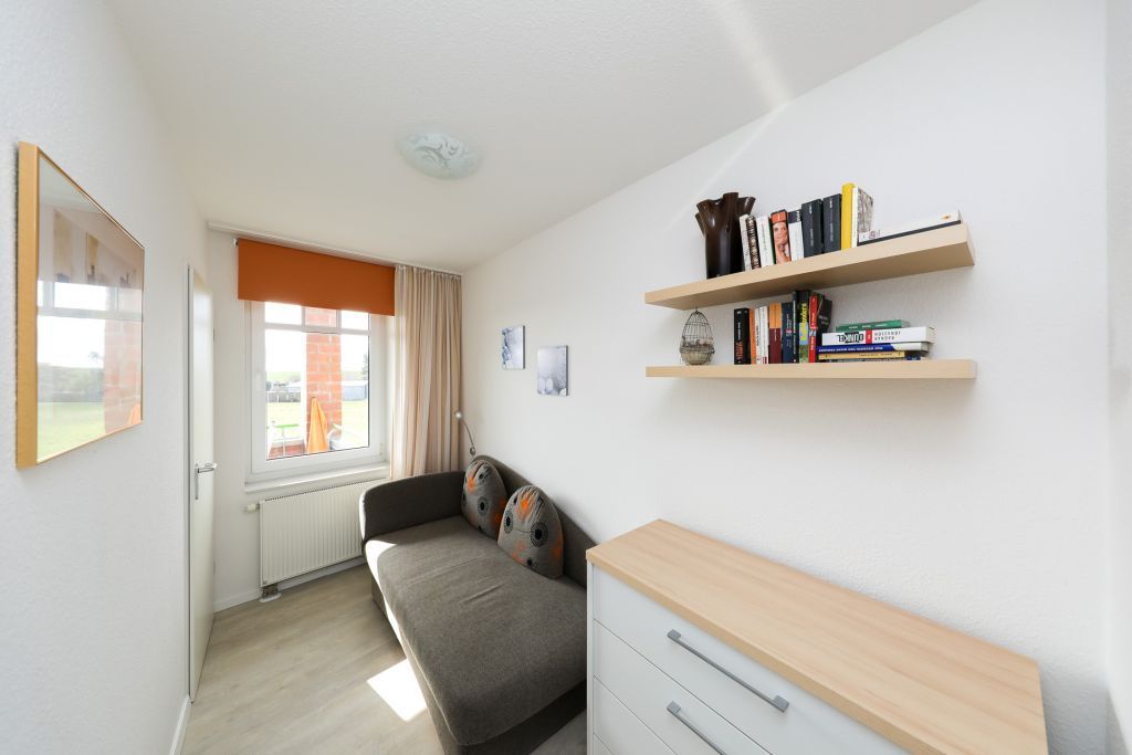 Der große möblierte Balkon bietet eine schöne Aussicht auf das Grün und den Deich und ist von morgens bis zum Sonnenuntergang sonnig. Alle Fenster und die Terrassentür sind mit Insektenschutz ausgestattet und im Wohnzimmer gibt es elektrische Außenjalousien.