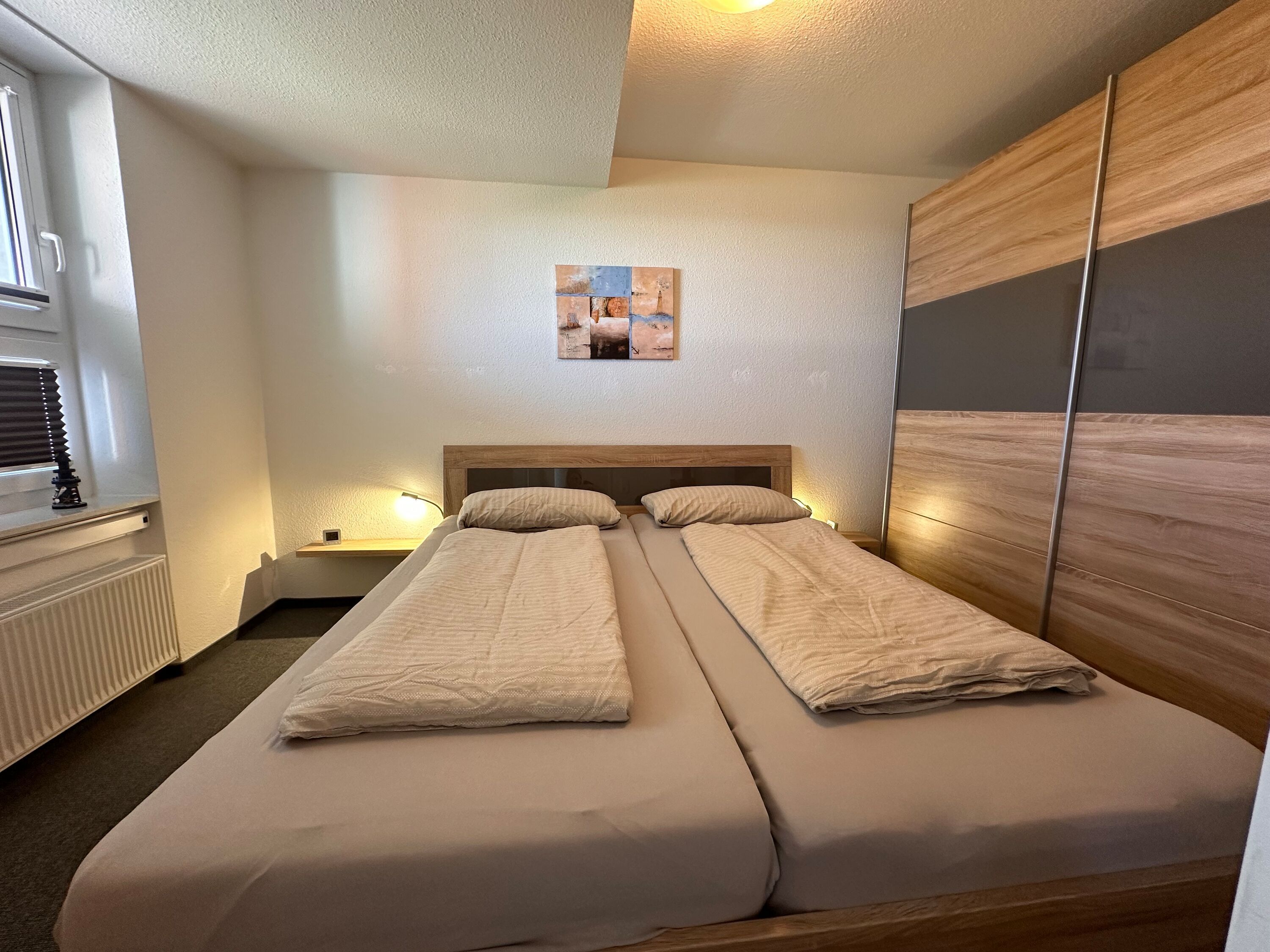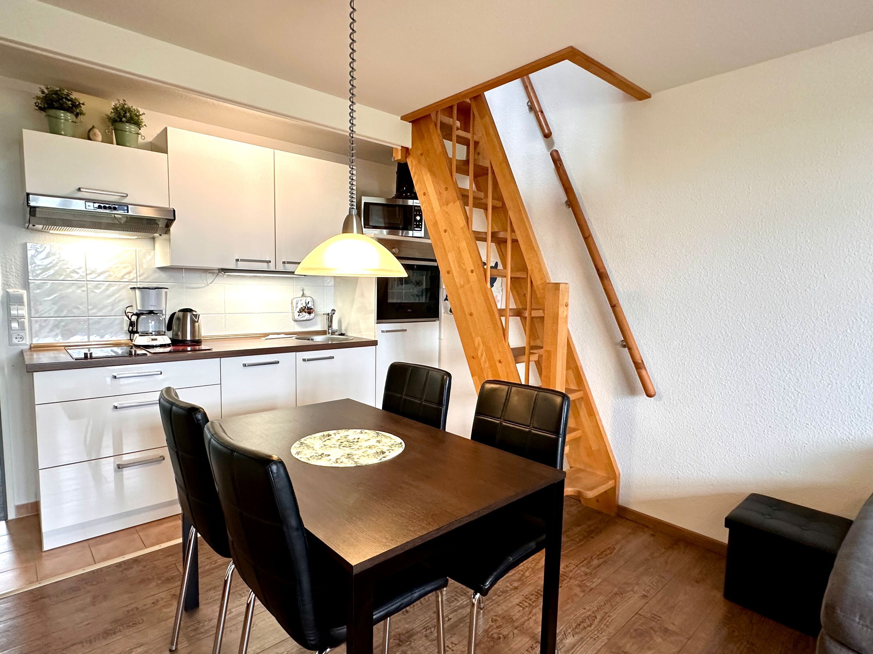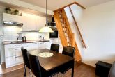 Die Wohnung 304 - De Kru - befindet sich in der obersten 3. Etage im Haus Neptun und hat eine Größe von 60 qm. Sie geht über 2 Etagen, auf der unteren Ebene befindet sich ein Schlafzimmer mit Doppelbett und großem Kleiderschrank, Wohnzimmer mit Küchenzeile und Essecke sowie das Badezimmer mit Dusche. Vom Wohnzimmer aus gelangt man über eine Raumspartreppe ins obere Studio, wo sich ein weiteres Schlafzimmer mit Doppelbett und Kommoden befinden. Die Wohnung ist modern und gemütlich eingerichtet.