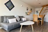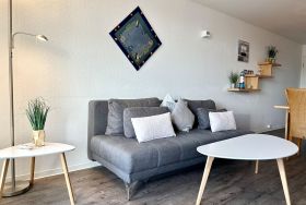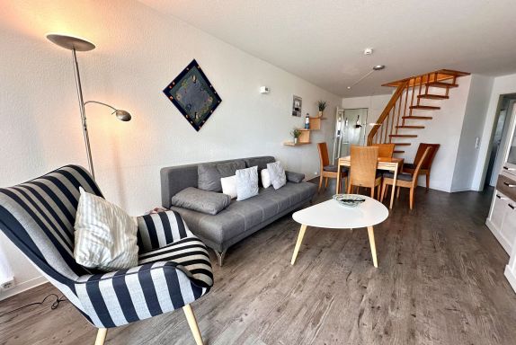 Unsere komplett ausgestattete Komfortferienwohnung T304 ist ca. 61qm groß und verfügt über 2 Schlafzimmer einmal Doppelbett, einmal zwei Einzelbetten), 1 Wohnzimmer, Sat-TV, Küchenzeile mit Geschirrspüler und Backofen, Bad mit Dusche und Badewanne, einen großen Balkon, Haustiere sind erlaubt. Die Wohnung geht über 2 Etagen, vom Wohnzimmer aus geht eine Spartreppe nach oben zum 2. Schlafzimmer.