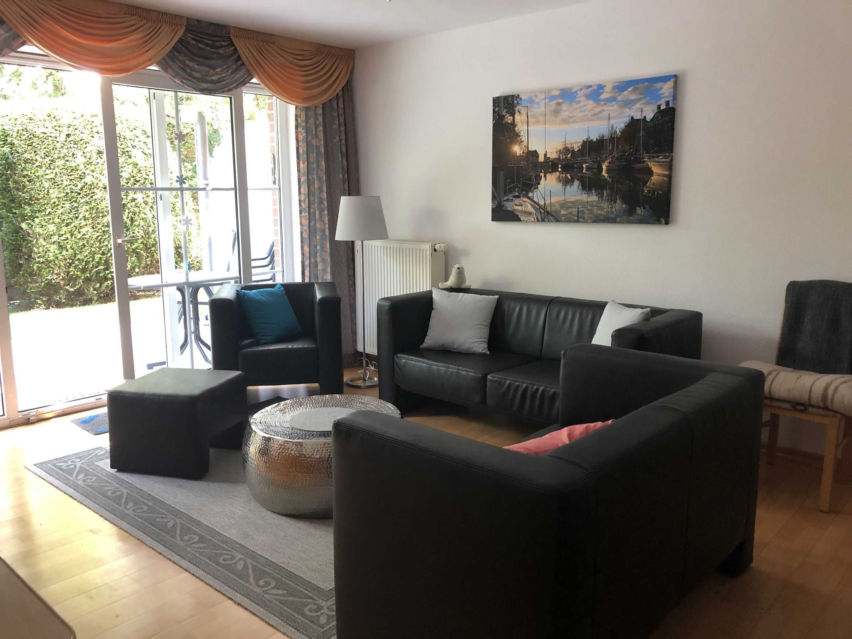 Ferienwohnung im Ortskern nahe Museumshafen mit zwei Schlafzimmern mit Doppelbetten, einem großzügigen und hellen Wohn- und Essbereich, separater Einbauküche, Badezimmer mit Badewanne, Waschmaschine und Trockner, überdachter Terrasse in Südlage. 1 Hund erlaubt.
