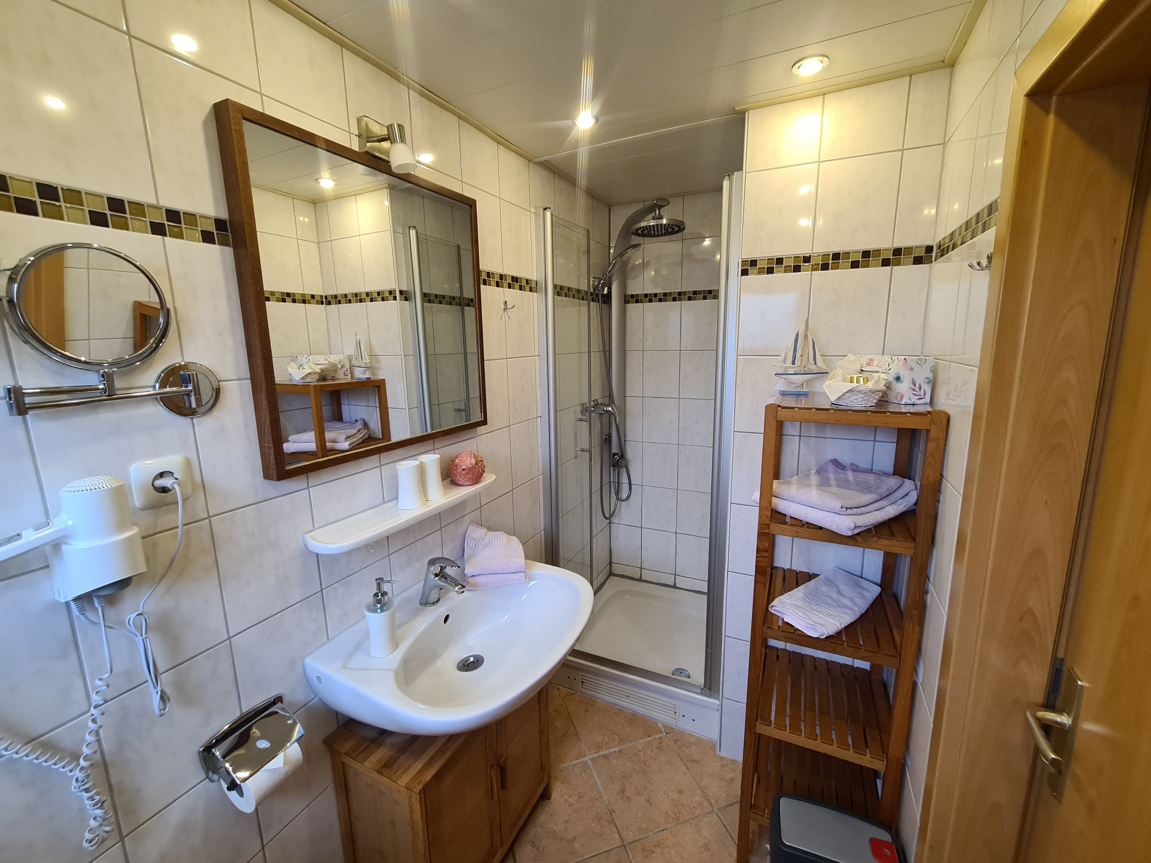 Das Badezimmer erwartet Sie in warmen Tönen  und bietet mit Kosmetikspiegel, Fön, Bidet und Rain- Duschbrause ein bisschen Luxus an.