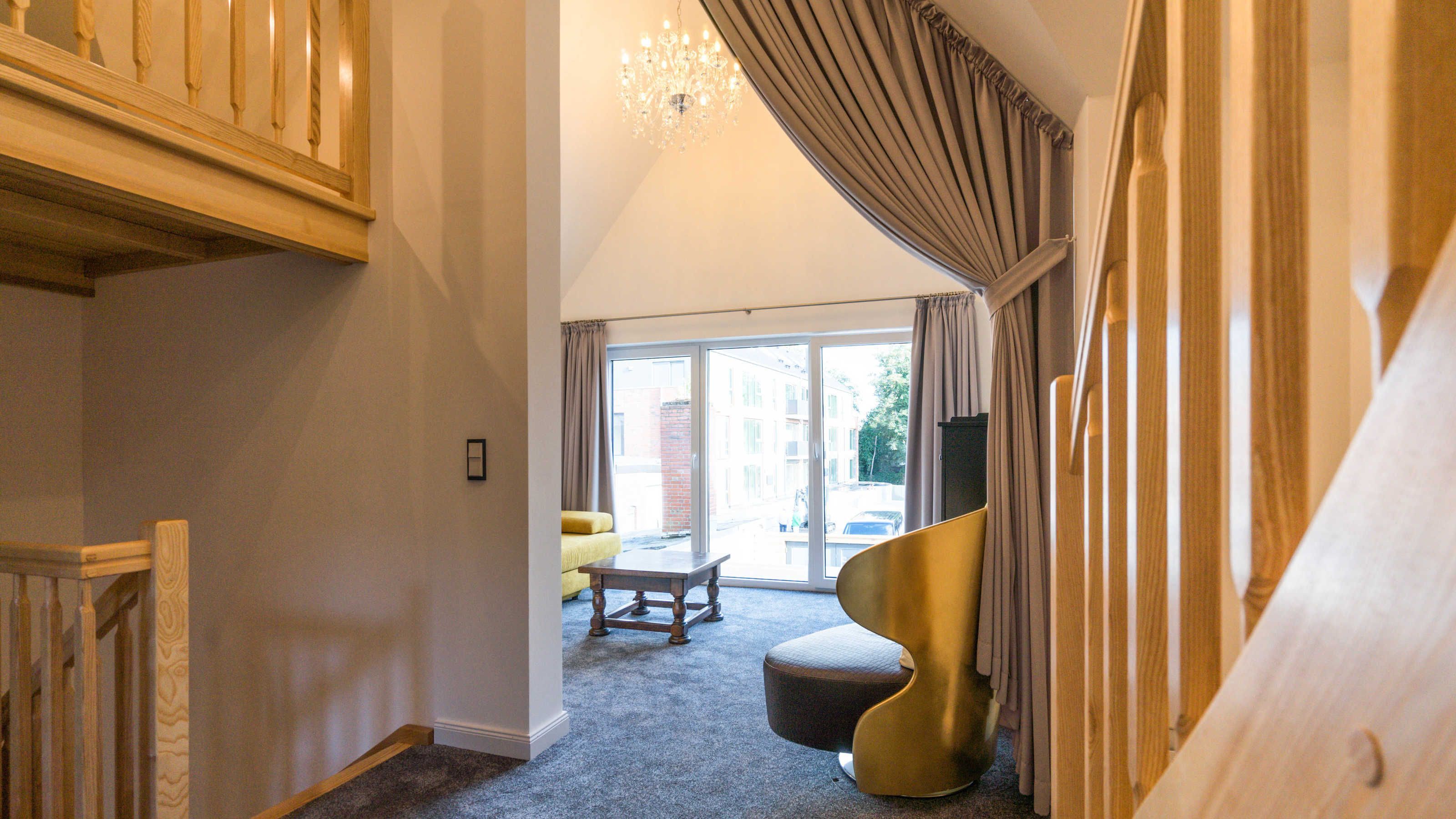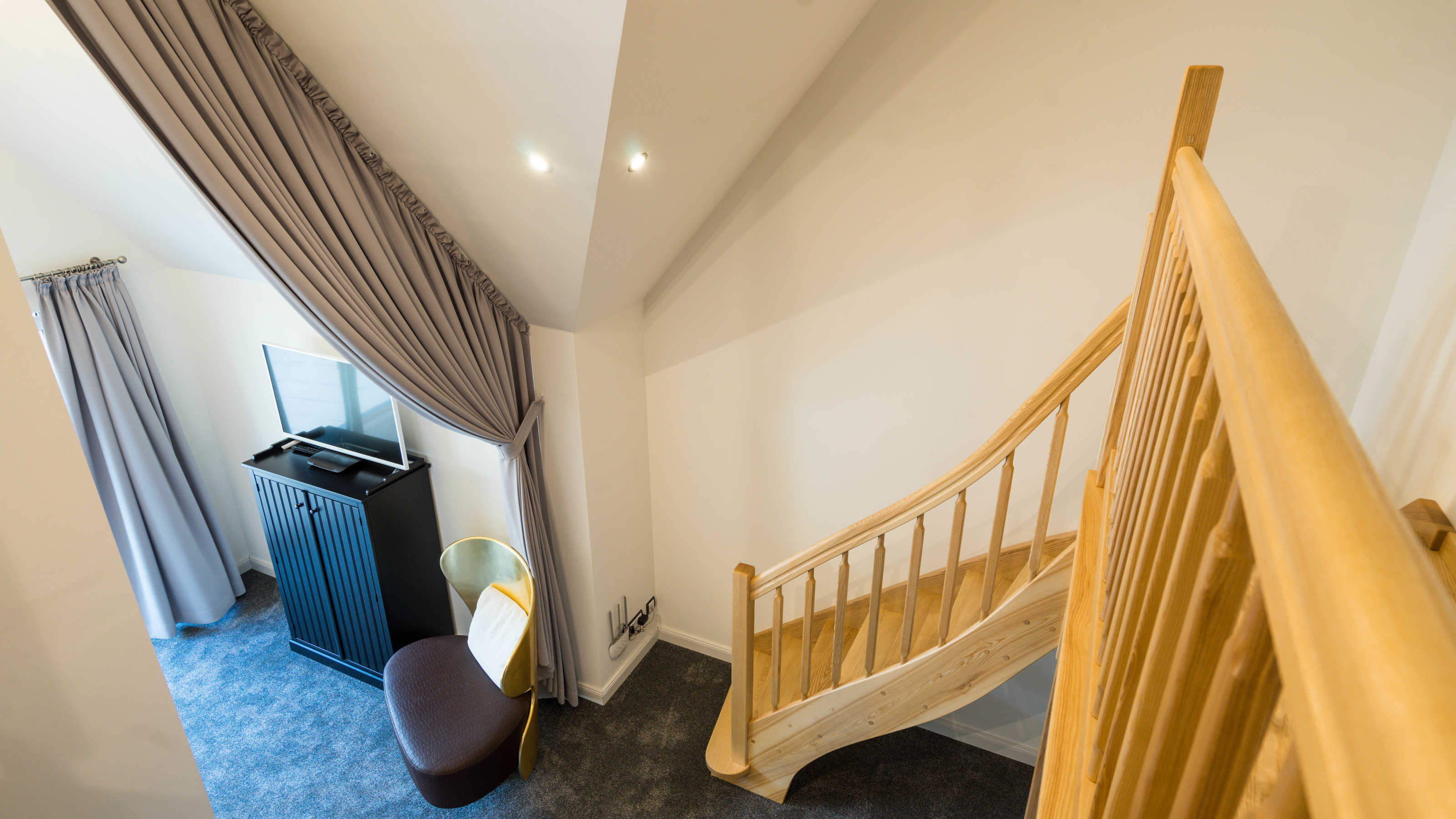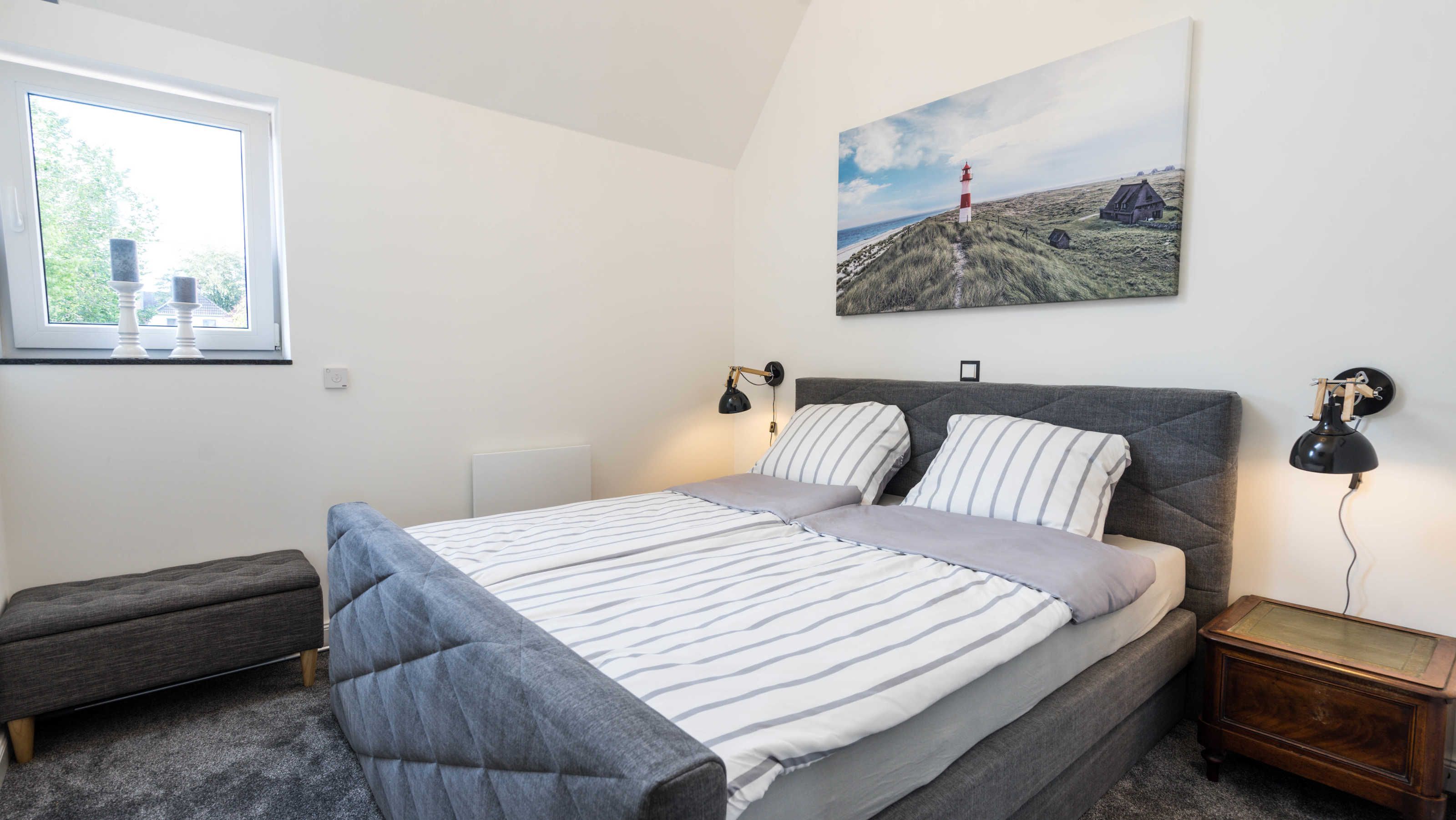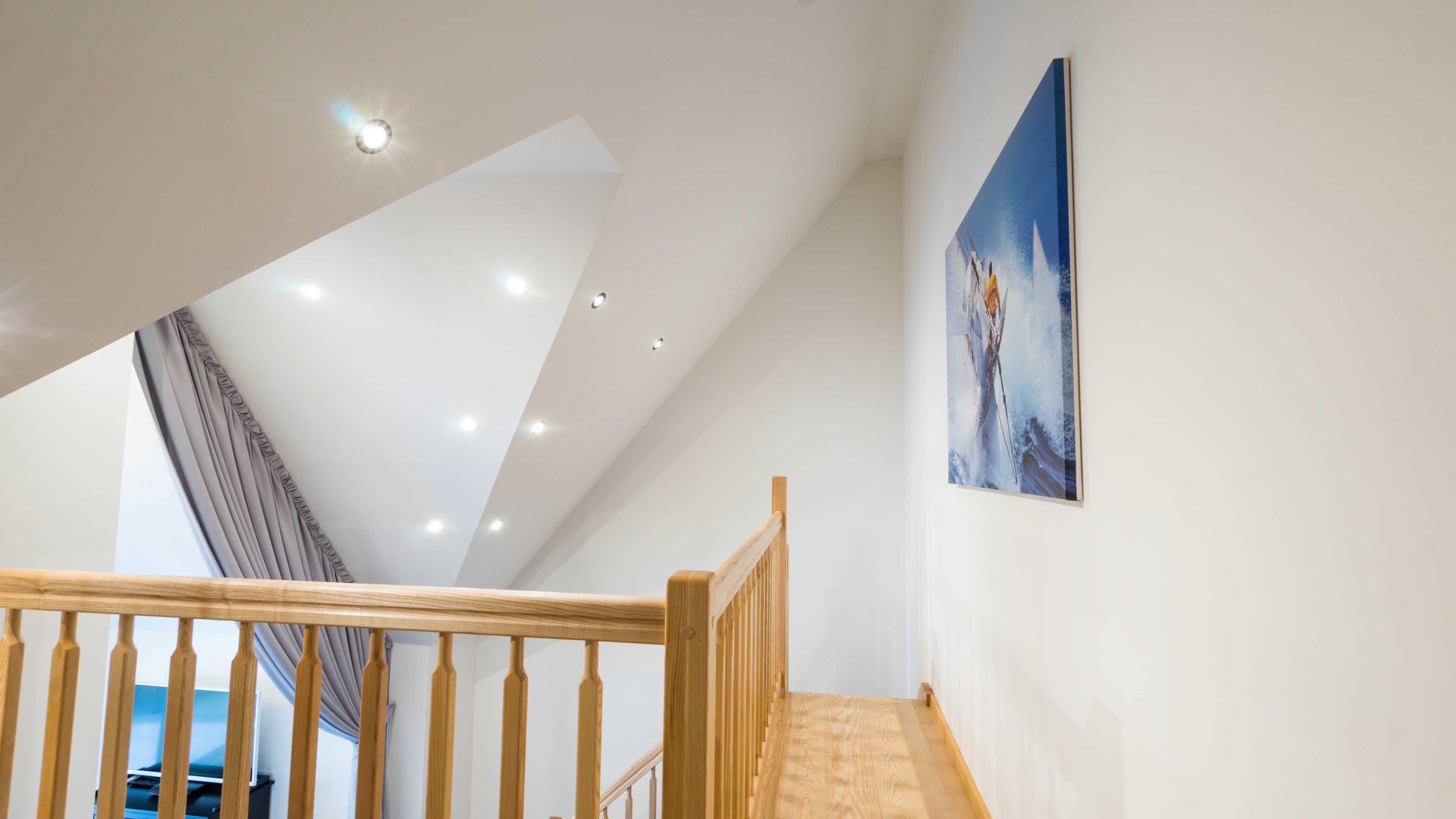 Über eine breite, offene Treppe gelangen Sie zum Obergeschoss mit zwei Schlafzimmern. Das moderne Duschbad rundet das Wohfühlgefühl ab.