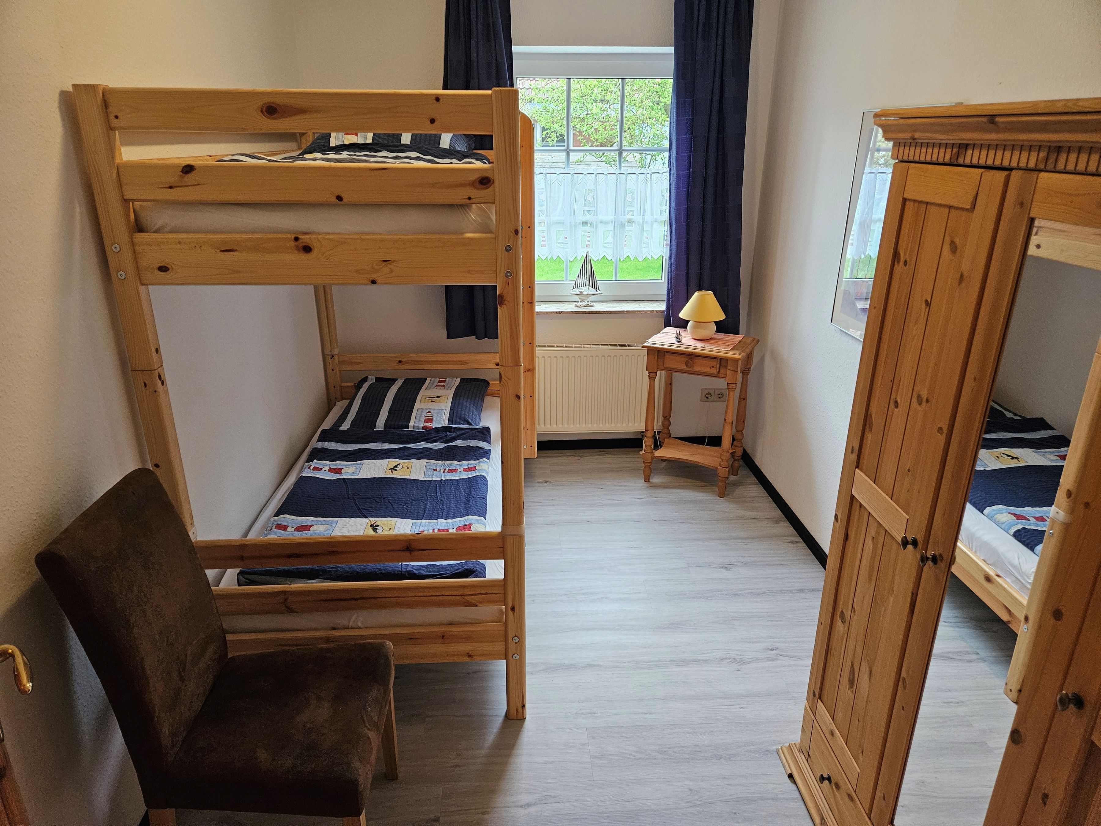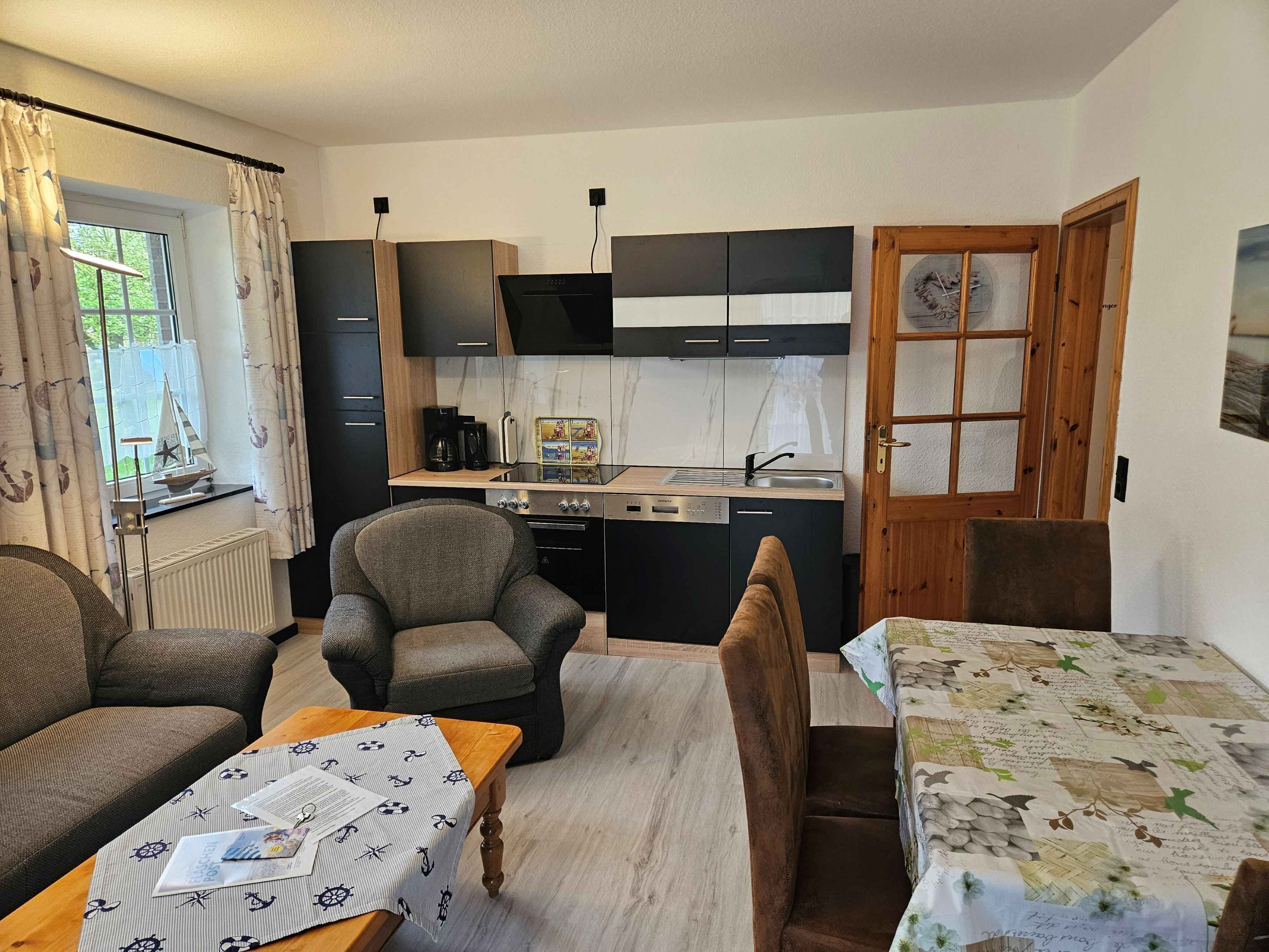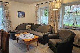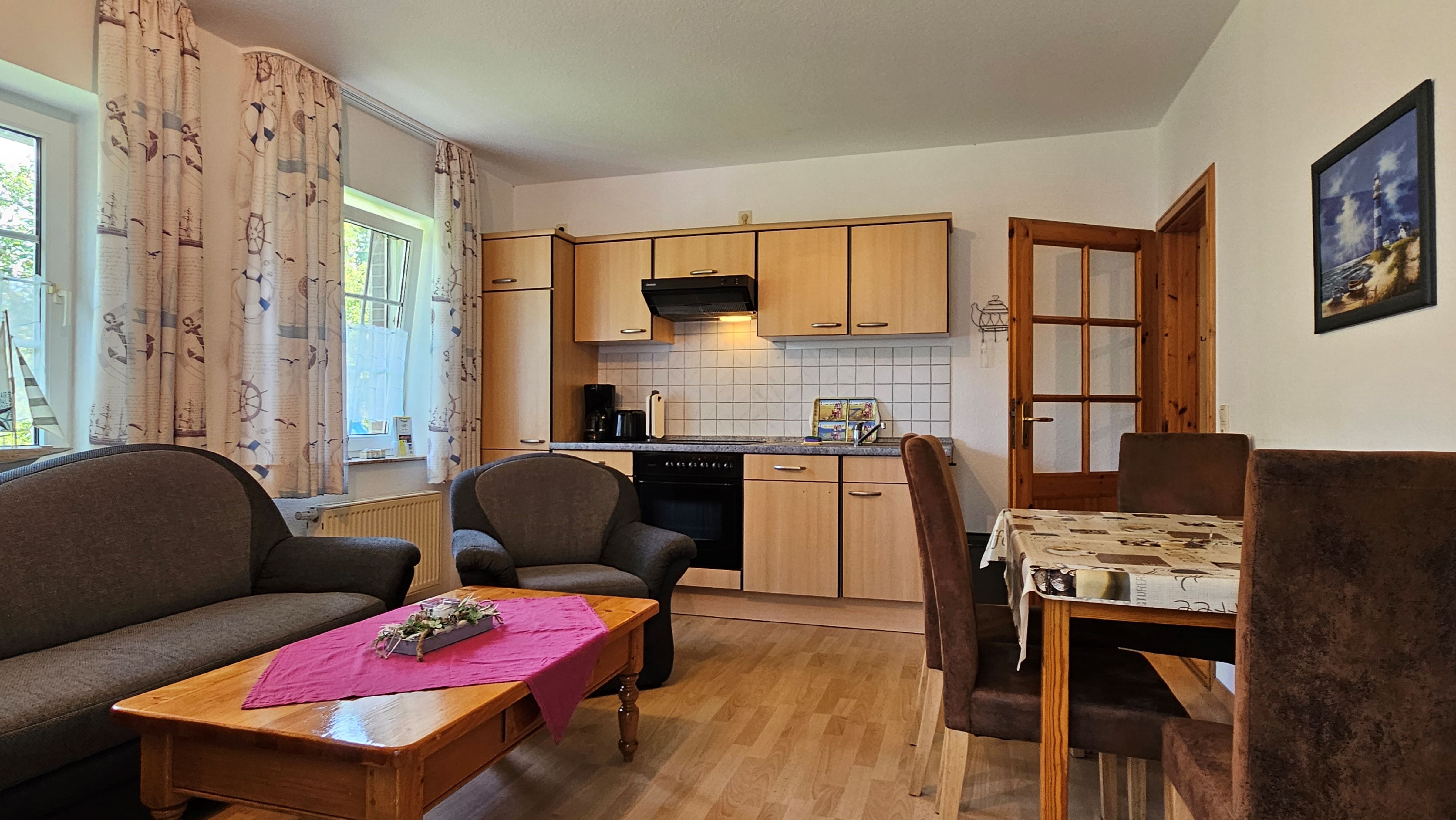 Die Erdgeschoßwohnung Langeoog verfügt über einen gemütlichen Wohnraum mit Küchenzeile sowie angrenzender Terrasse zum Garten. Weiterhin bietet sie zwei Schlafräume (eines mit Doppelbett und eines mit einem Etagenbett), ein Bad mit Dusche und einen Abstellraum. Alle Böden sind mit Laminat- und Fliesenböden ausgestattet. Flachbildfernseher, Blu-ray-Player und WLAN gehören selbstverständlich zur Ausstattung.