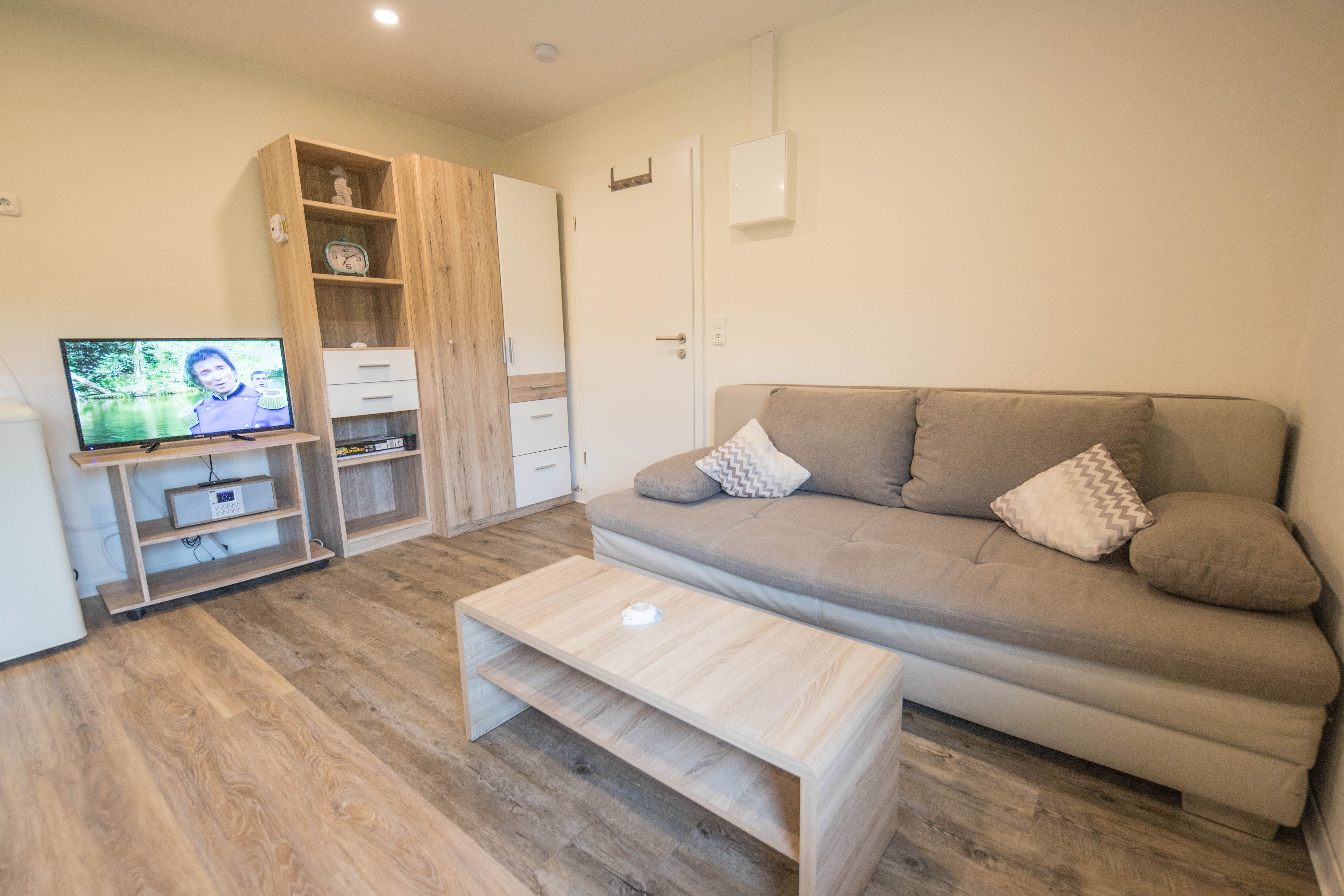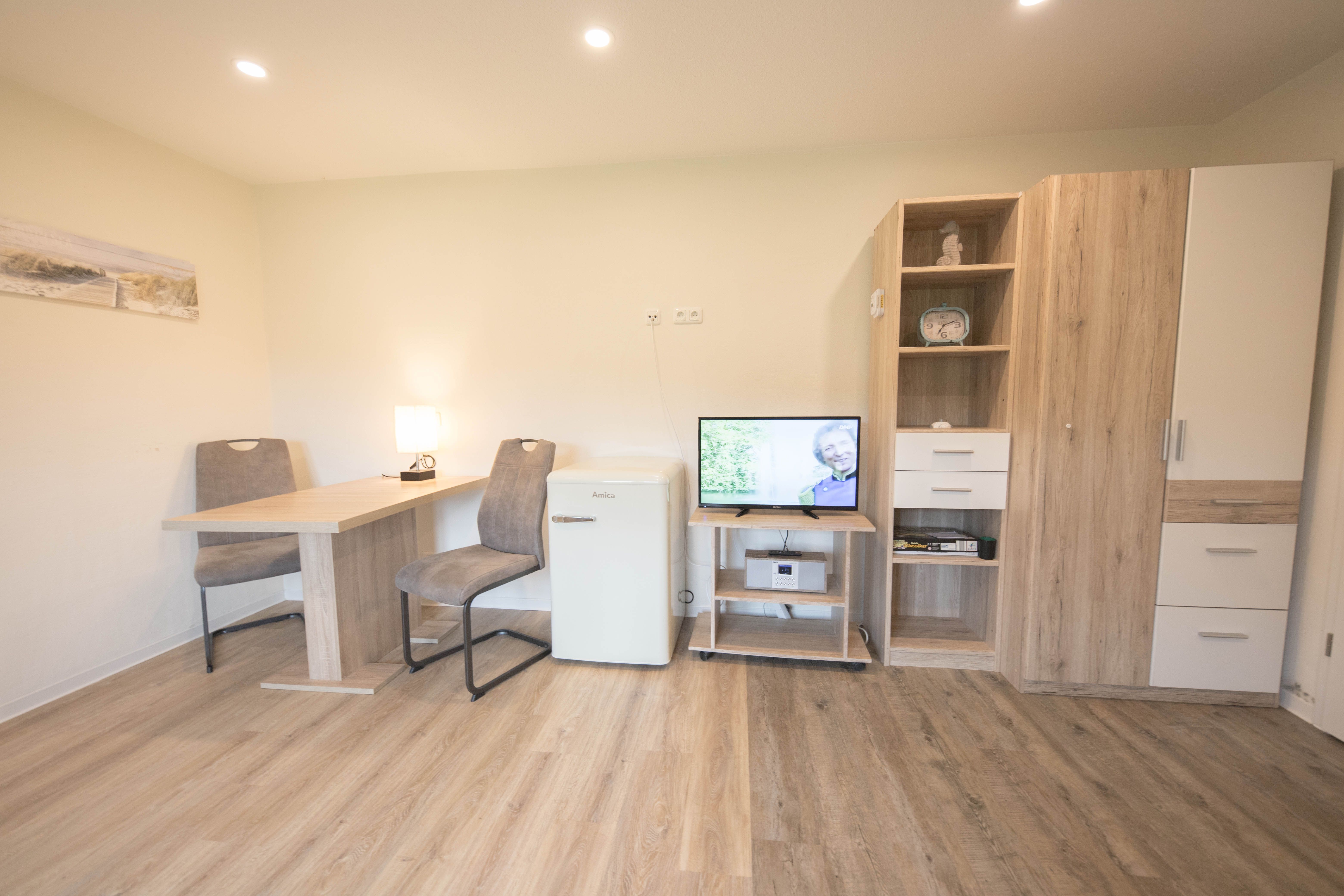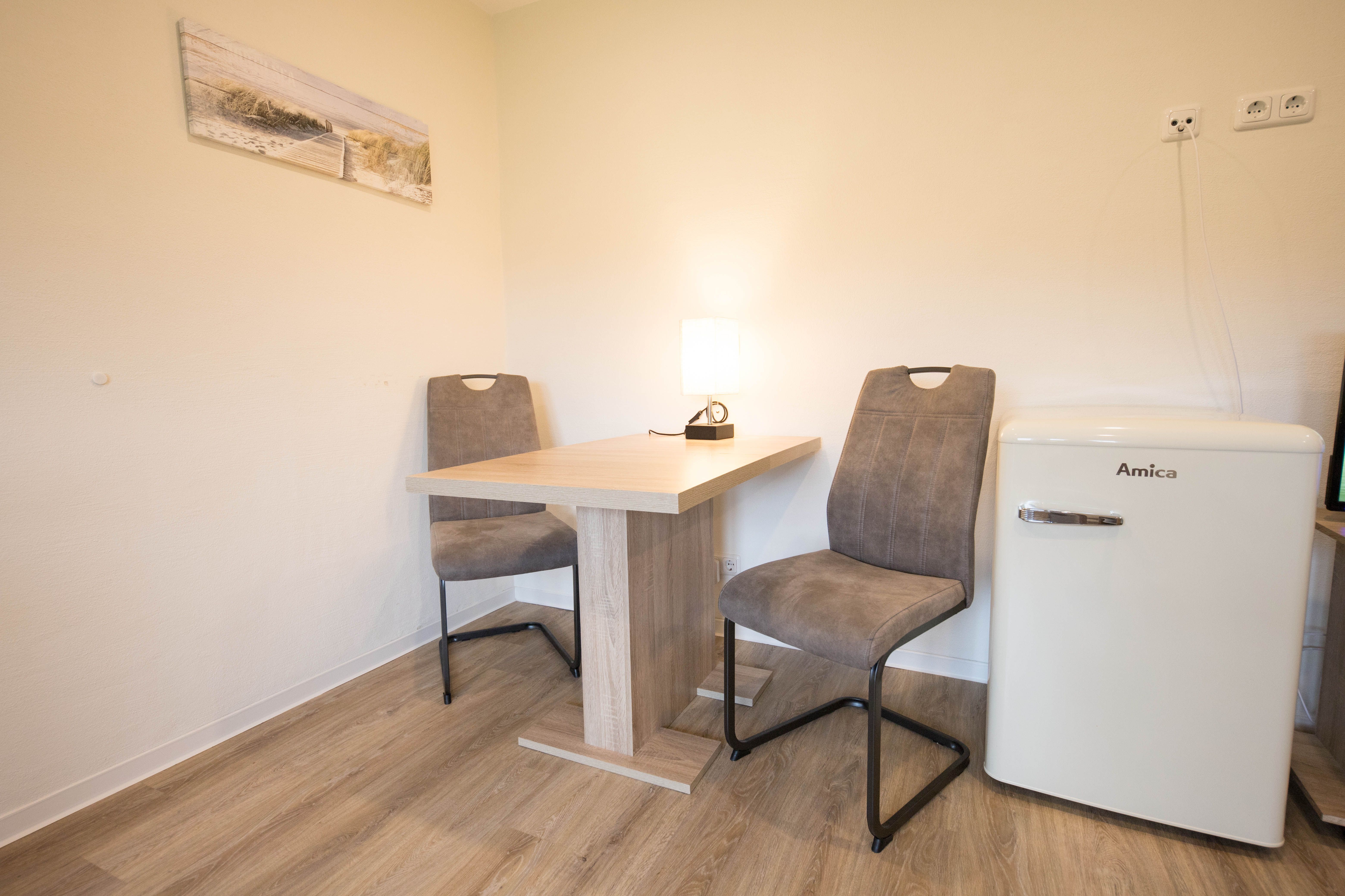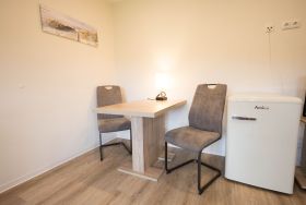 Das Appartement Juist ist ein Einraum-Appartment mit einem kombinierten Wohn-und Schlafraum mit Schlafsofa und Essplatz und einer integrierten offenen Pantryküche. Dem Zimmer schließt sich ein Tageslichtbad mit Dusche und WC an.