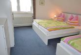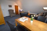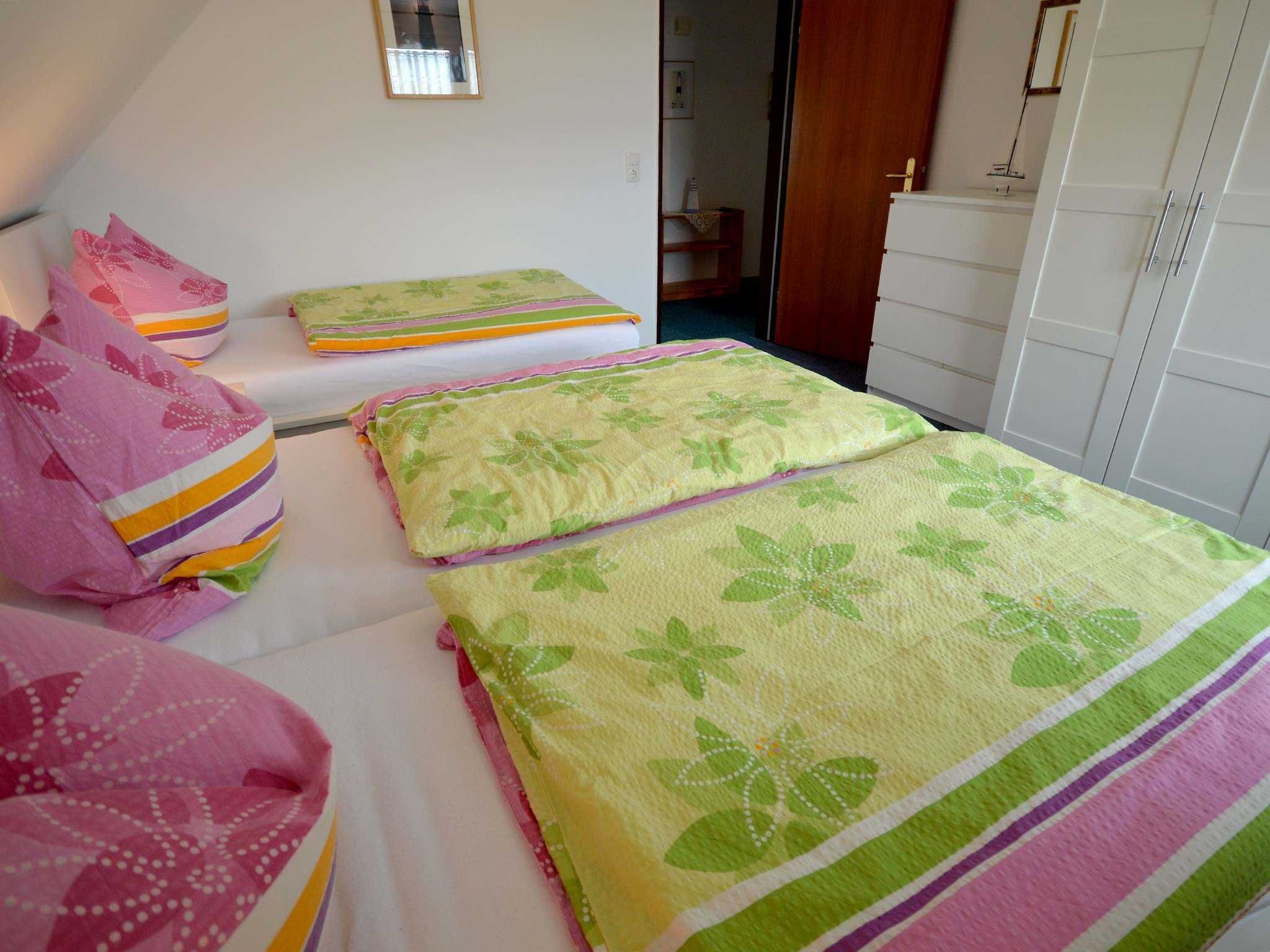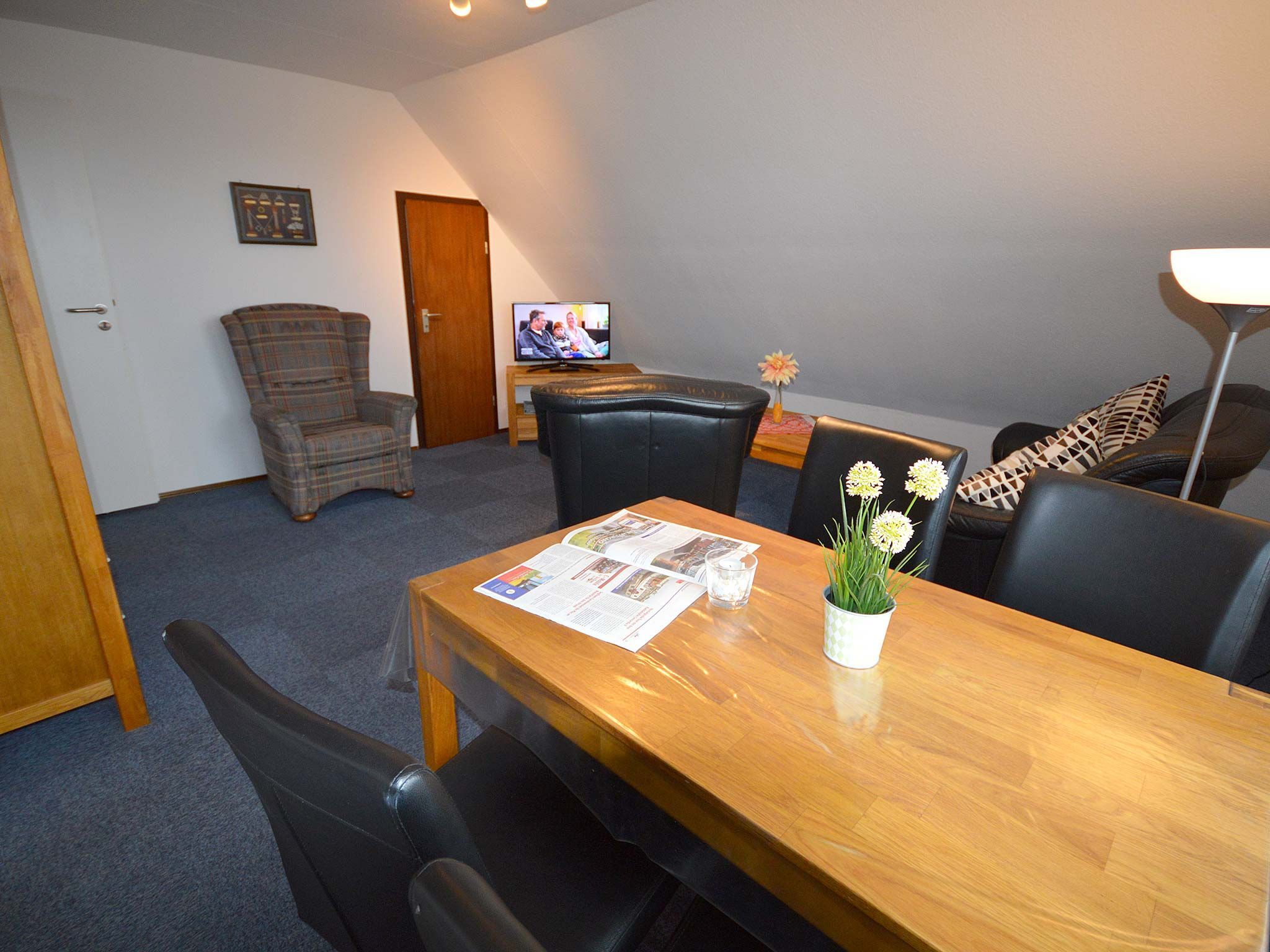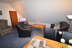 Helle und gemütlich eingerichtete Ferienwohnung für bis 3 Personen in der 1. Etage mit separatem Eingang. Ein Wohnzimmer mit Couchgarnitur (2er-Sofa, Sessel und 1 Ohrensessel), Essecke, SAT-TV Flachbildschirm und CD/Radio. Sep. Küche mit komplett eingerichteter Küchenzeile, Cerankochfeld, Backofen, Spülmaschine, Microwelle, Kühlschrank mit Gefrierfach etc. Das Schlafzimmer ist mit einem Doppelbett und einem Einzelbett ausgestattet. Das moderne Bad ist mit Dusche/WC, Fön und ein Fenster ausgestattet. Die komplette Ferienwohnung hat Außenrollos. Nichtraucherwohnung!