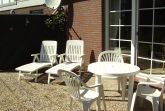 Grosse komplett eingezäunte Terrasse mit Gartenmöbeln.