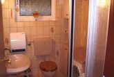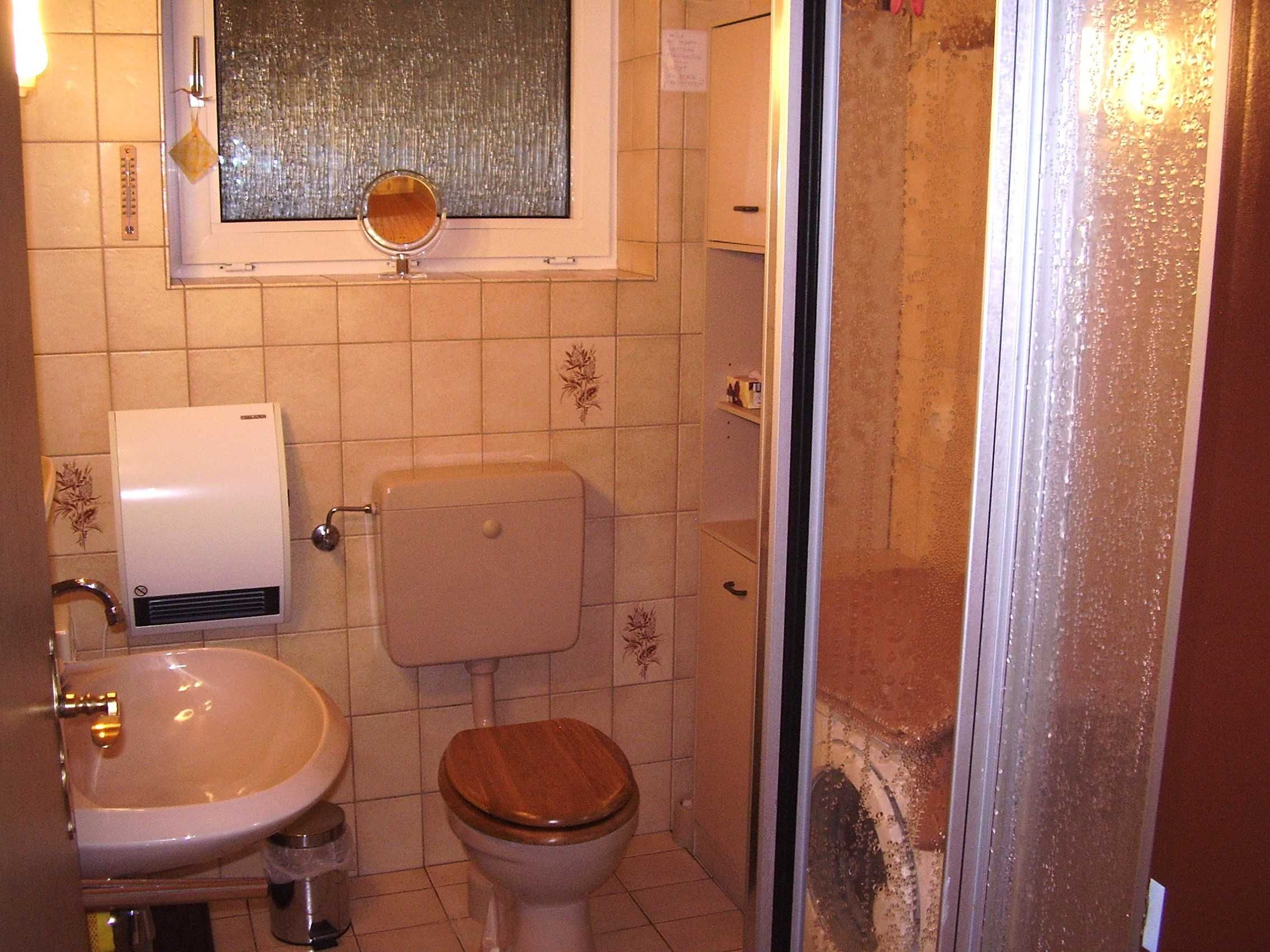 Badezimmer mit Dusche, WC und Waschmaschine.