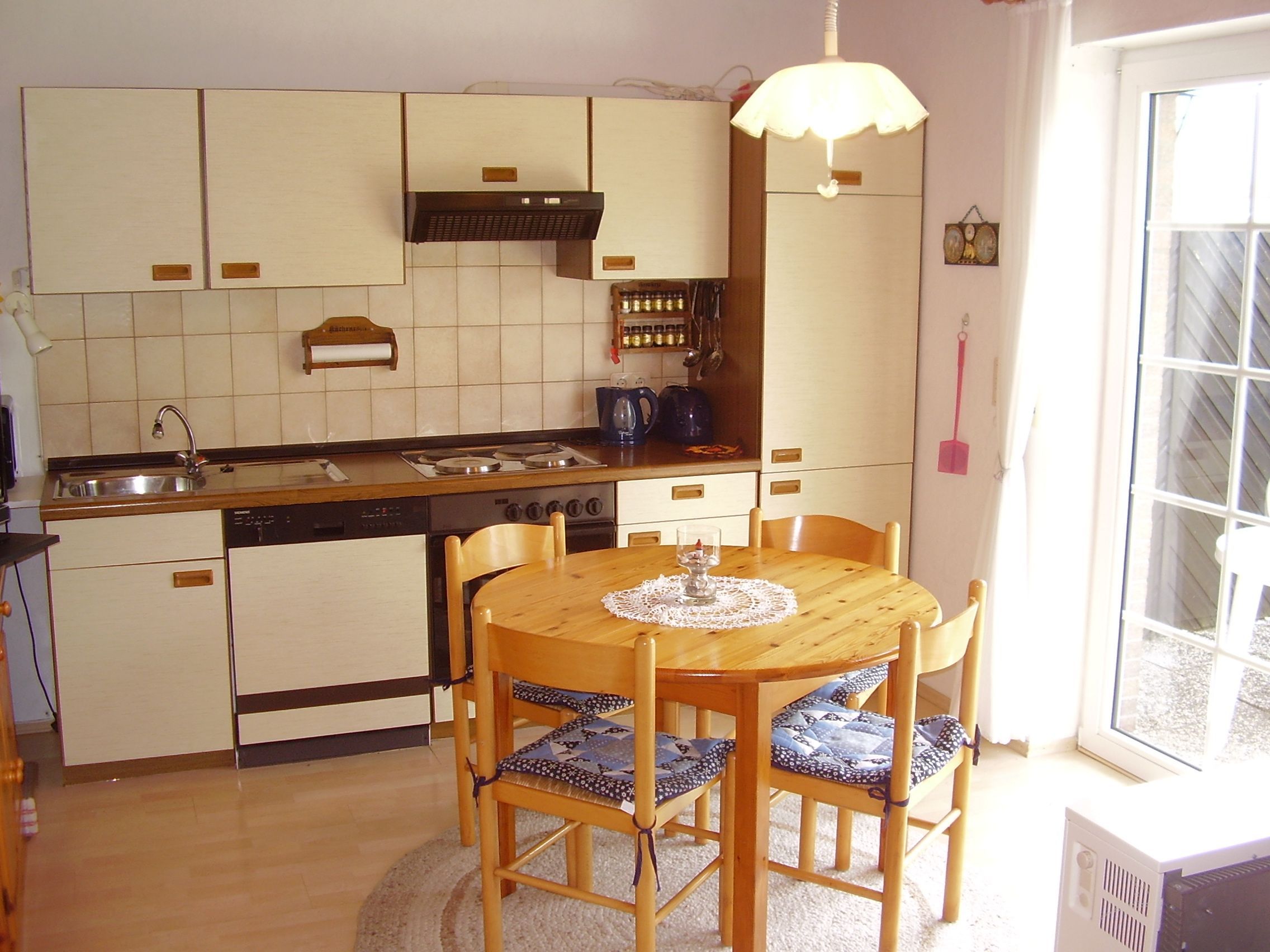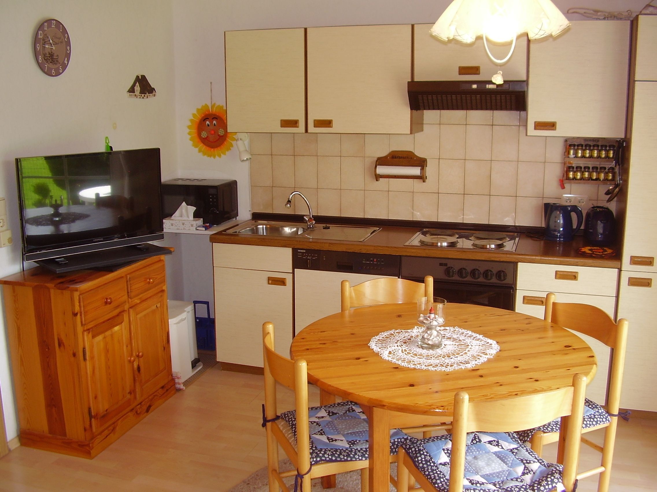 Die Einbauküche ist mit VierPlattenHerd mit Backofen, Kühlschrank, Spülmaschine, Mikrowelle und allen erforderlichen Elektrogeräten und Küchenutensilien ausgestattet.