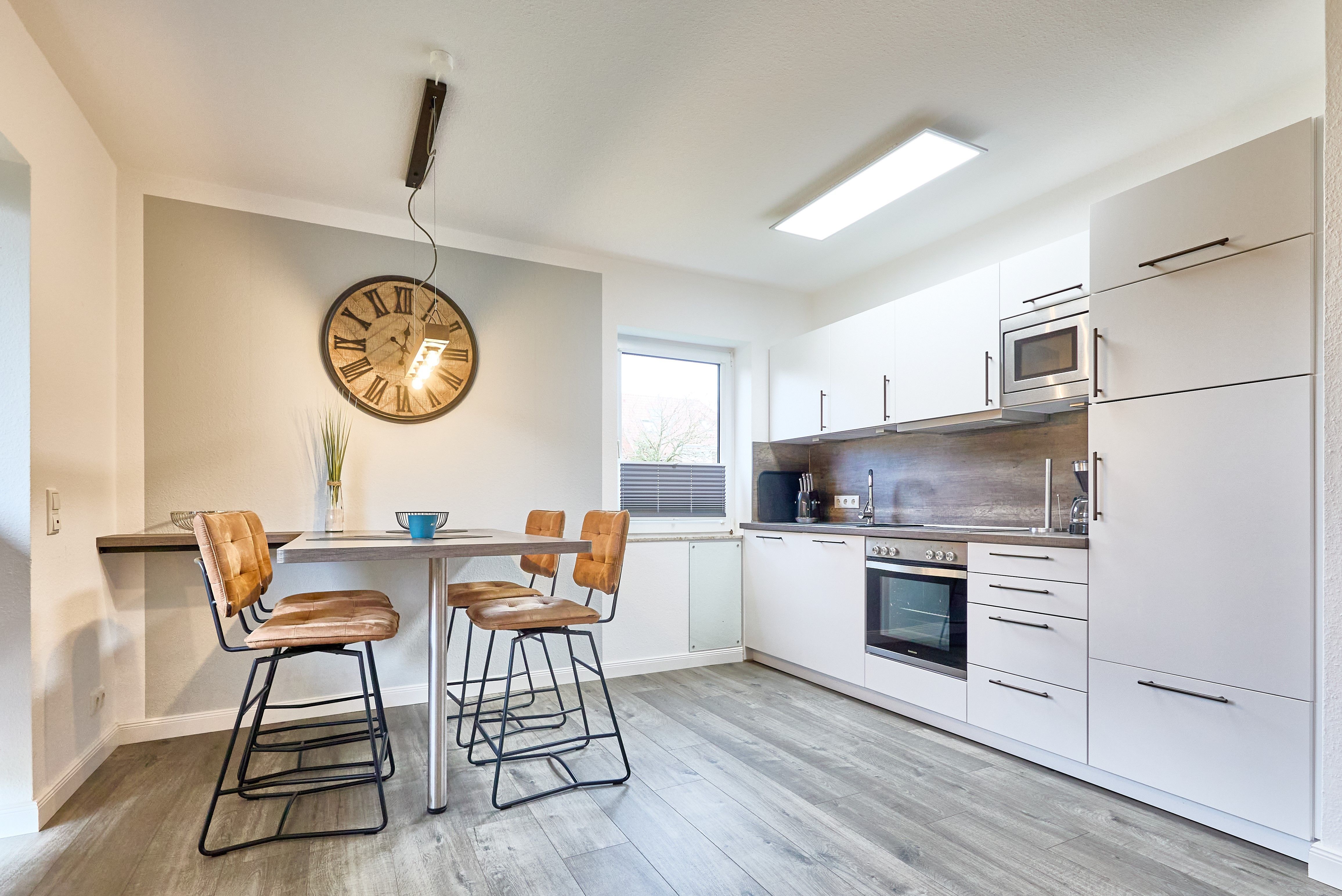 Der Wohnbereich, gestaltet mit einer stylischen Ledercouch und einem wandhängenden Flat-TV, öffnet sich zur westlich gelegenen Terrasse. Einladend für entspannte Momente und abendliches Relaxen. Ein großer Esstisch und die komplett ausgestattete Einbauküche mit Geschirrspüler lassen keine Wünsche offen. Der Abstellraum mit Waschmaschine komplettiert das Rundum-sorglos-Paket.