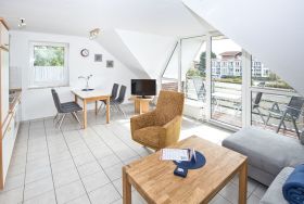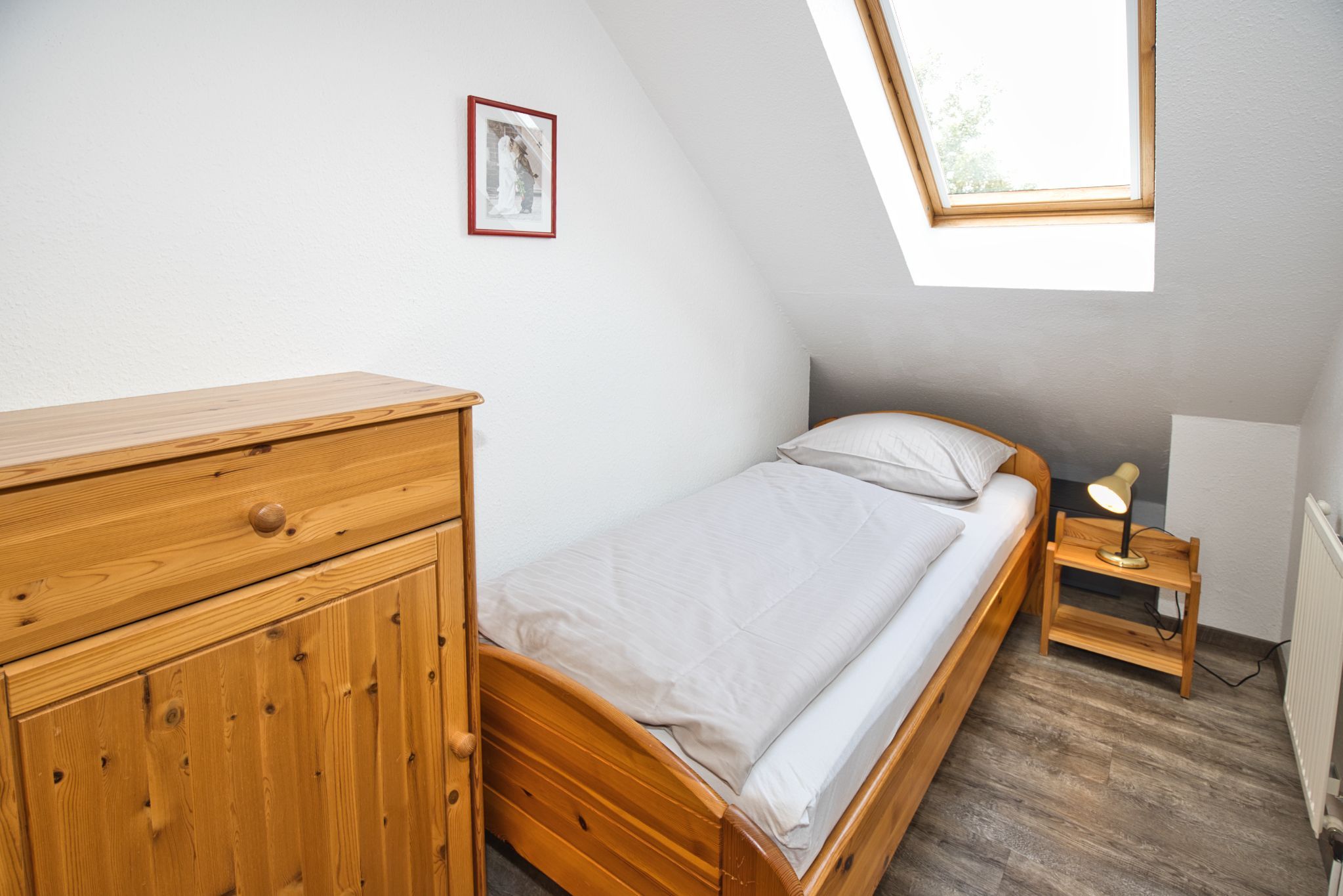 Maike 15b, 3-Raum, ca. 54m², 1.OG, bis zu 3 Personen. Die gemütlich ausgestattete Ferienwohnung empfängt Sie im 1.OG und ist aufgeteilt mit einem kleinen Flur, Duschbad/WC, Schlafzimmer mit Doppelbett, einem weiteren kleinen Schlafbereich mit einem Einzelbett. dieser Bereich ist ebenfalls durch eine Tür getrennt und vom Flur aus erreichbar. Des Weiteren ein Wohnbereich mit großem Esstisch und der gut ausgestatteten Einbauküche. Vom Wohnbereich geht es auf den sonnigen Süd Balkon (mit Balkonmöbeln). Die Wohnung hat einen eigenen Eingang mit einer direkt dahinterliegende Treppe zum 1. OG, in die Wohnung.