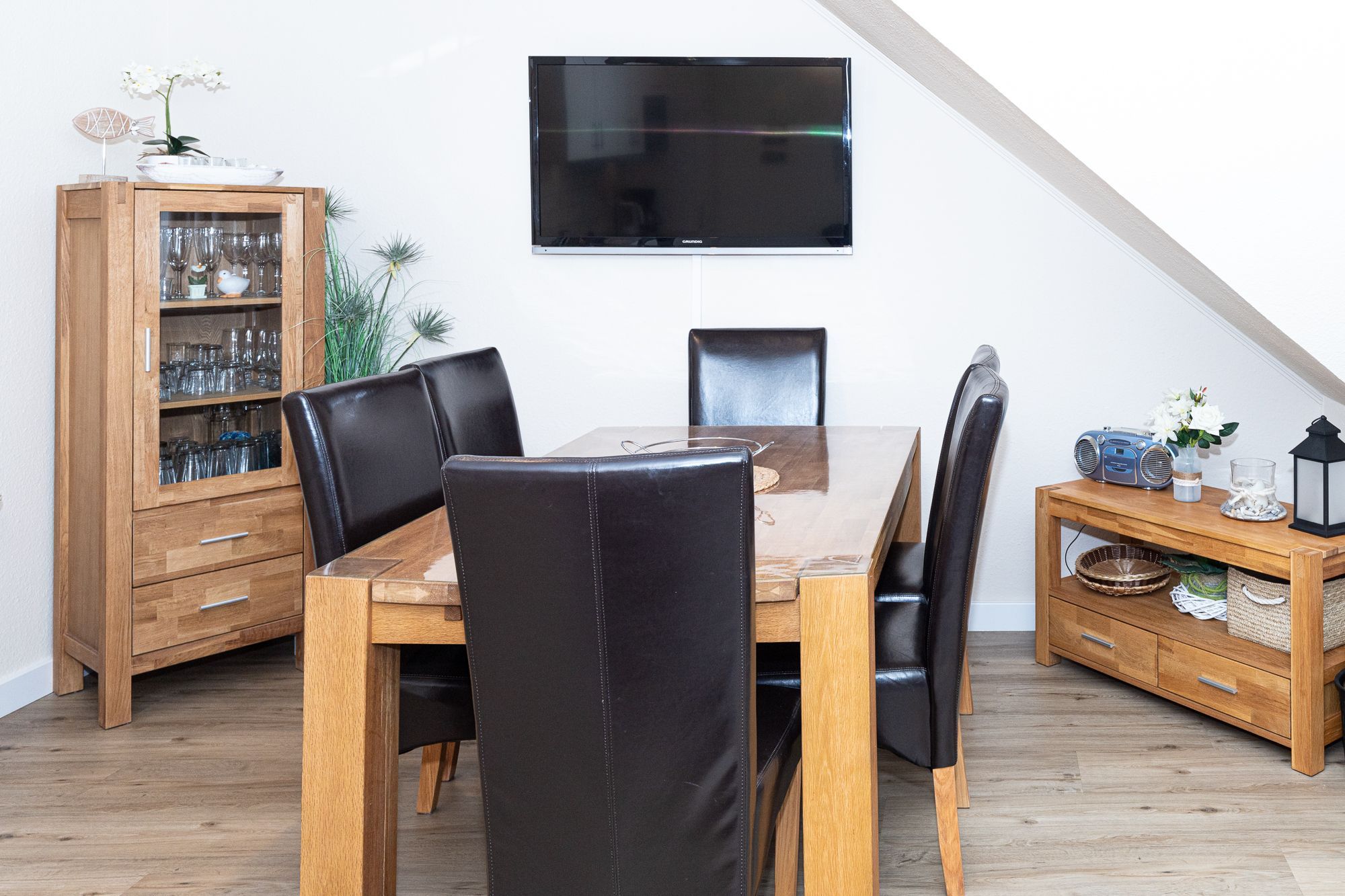 Maike 11b, 4-Raum, ca. 69m², 1. Obrgeschoss und Dachgeschoss, bis zu 5 Personen. Kostenfreier Strandkorb zum wohlfühlen am Duhner Strand. Die gemütlich und modern ausgestattete Ferienwohnung empfängt Sie im 1. Obergeschoss des Hauses und ist aufgeteilt mit einem kleinen Flur, Duschbad (Dusche/WC), Schlafzimmer mit Doppelbett und Kleiderschrank und einem weiteren Schlafbereich mit einem Einzelbett und einer Kommode, dem Wohnbereich mit großem Esstisch und der gut ausgestatteten Einbauküche. Vom Wohnbereich geht es auf den sonnigen Balkon (mit Balkonmöbeln). In dem sehr schönen ausgebauten Dachgeschoss (erreichbar über Treppe mit Sparstufen, für kleinere Kinder nur bedingt geeignet), mit Dielenboden ausgelegt, befindet sich ein weiteres Schlafzimmer mit 2 Einzelbetten und einer Sitzmöglichkeit. In diese Wohnung ist ein Baby-Reisebett leider nur sehr ungünstig zu stellen.