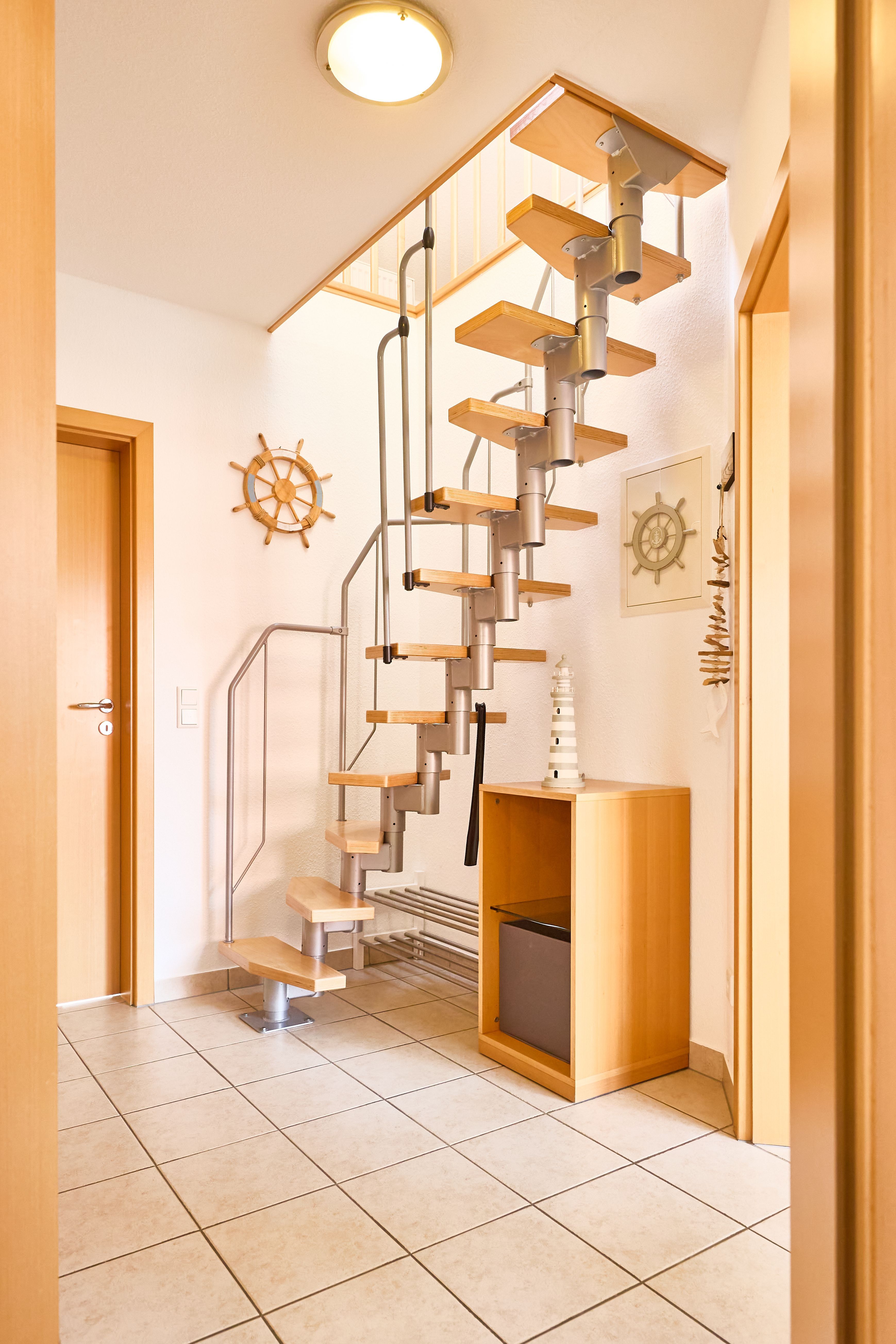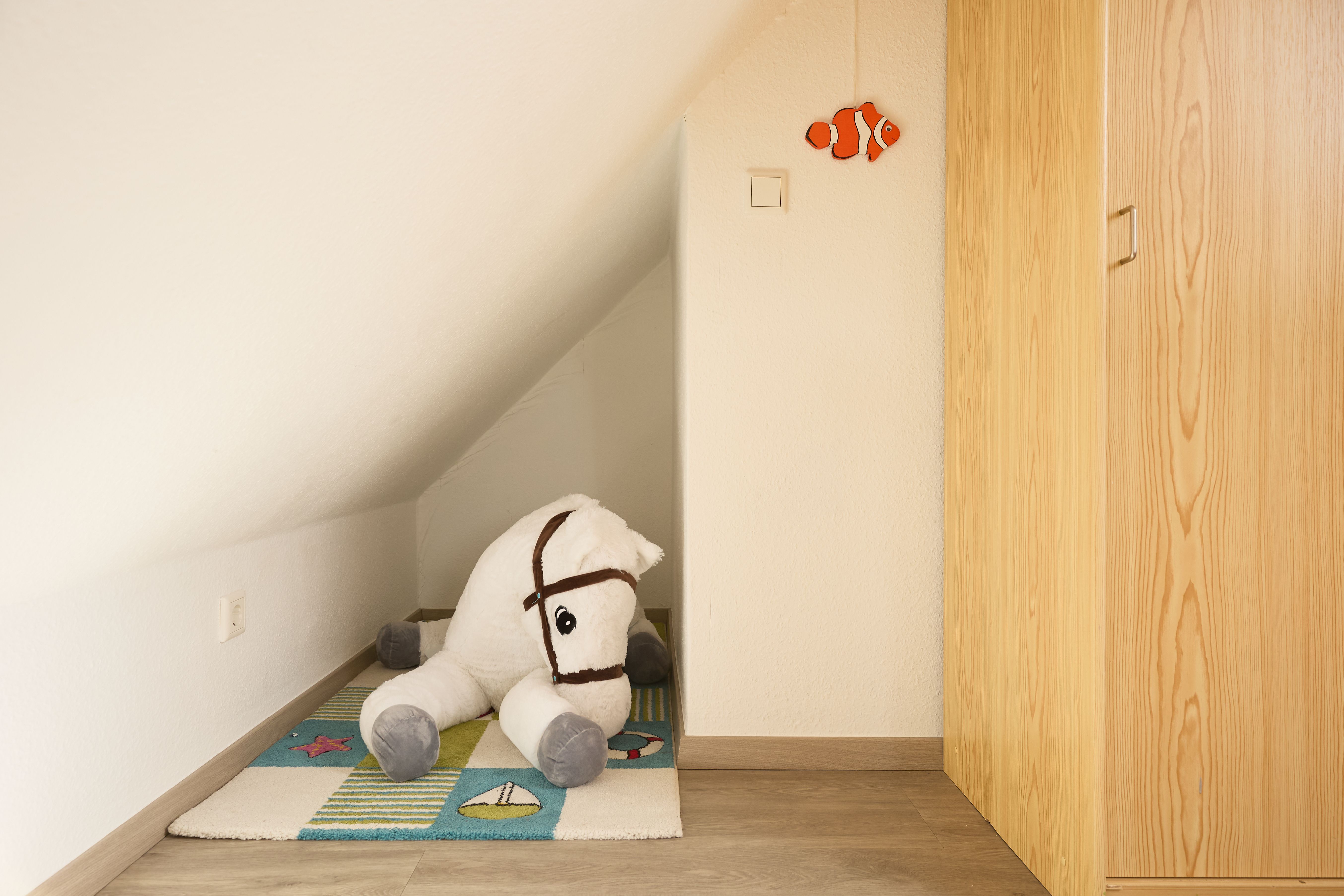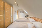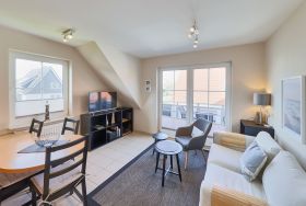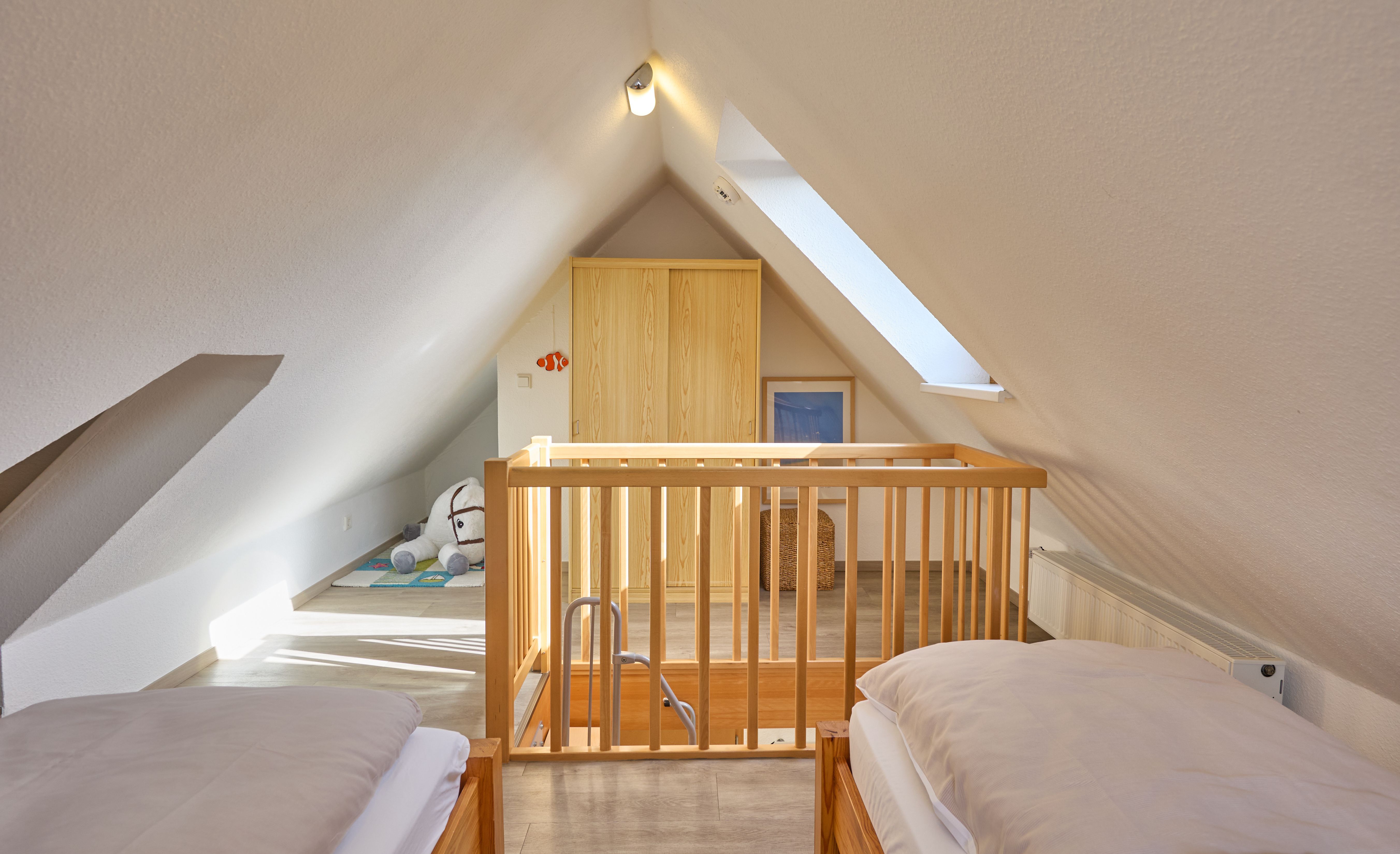 Neptun 12, Whg. 4, 3-Raum, 1.OG + DG, ca. 64m², bis zu 4 Personen, Kleiner Spielbereich für die Kleinen im Dachgeschoss. Die Ferienwohnung ist für bis zu 4 Personen geeignet und ist aufgeteilt mit einem separaten Schlafzimmer, mit einem Doppelbett (im 1.OG), einem Kinderzimmer (auch für Große) mit 2 Einzelbetten und einem Spielbereich für die Kleinen (im ausgebauten Dachgeschoss, ein fest eingebautes Treppenschutzgitter ist oberhalb der Treppe vorhanden), einem hellen Duschbad/WC, dem Wohnbereich mit Zugang zum Balkon und dem Essbereich mit der komfortablen Einbauküche. Der gemütliche und sonnige Balkon, mit Balkonmöbeln lädt zum urlauben ein.