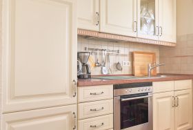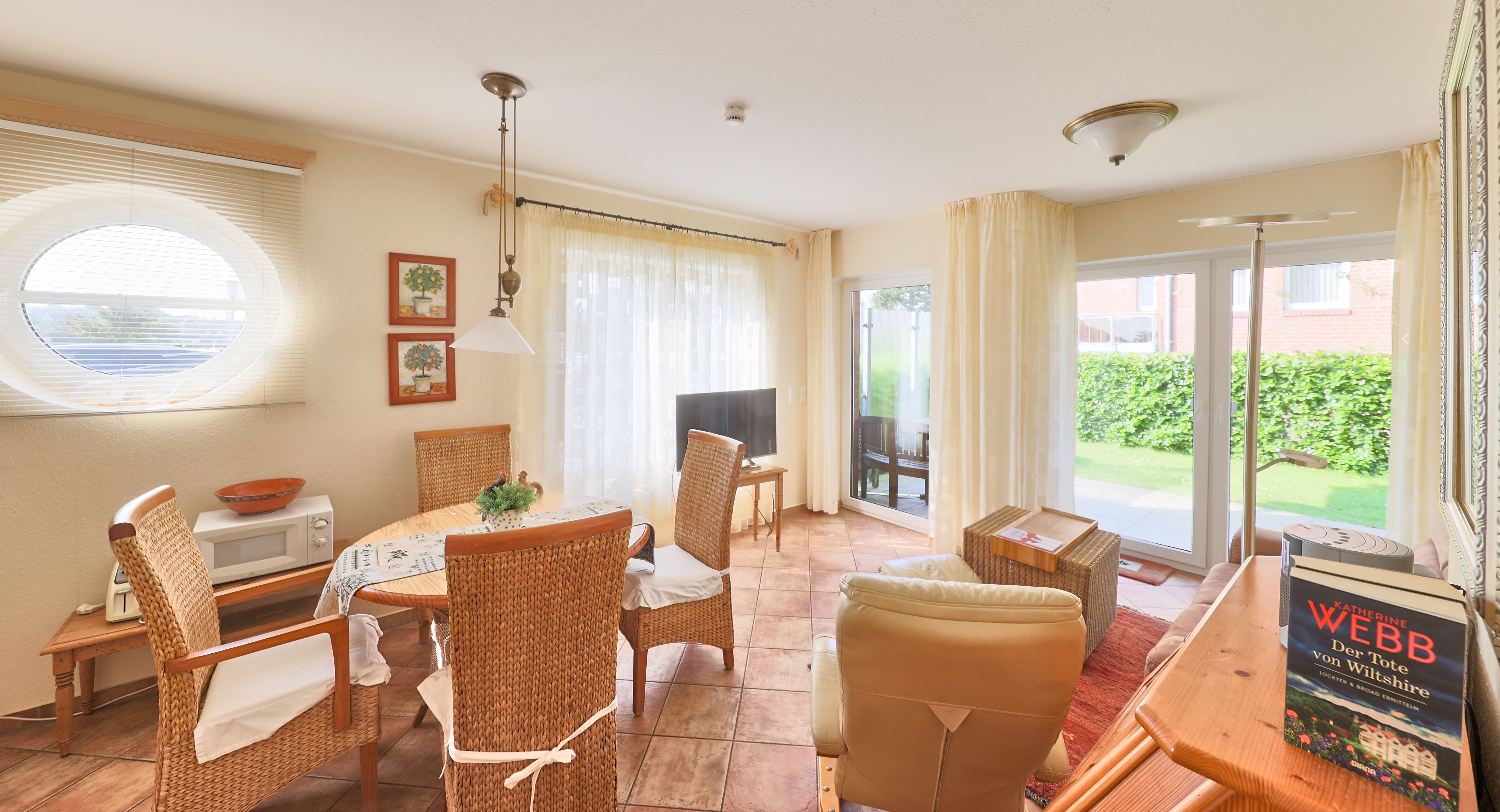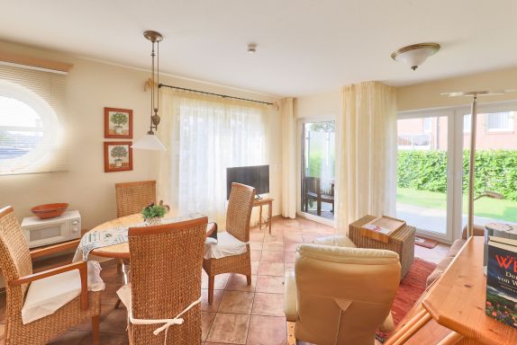 Aquaris, Whg. 1, 2-Raum, ca. 43m², EG, bis zu 2 Personen, sehr stilvoll und gehbehindertengerecht. Sie ist mit einem gemütlich ausgestatteten Schlafzimmer mit großem Kleiderschrank, einem Duschbad (Dusche/WC) mit Fußbodenheizung, sowie dem gemütlichen Wohn- und Essbereich mit Terrasse und einer aufgeteilt. Der Wohnbereich ist mit einer Couch und einem Sessel ausgestattet. Die sehr schöne Einbauküche bietet Komfort und ist komplett eingerichtet. Hier ist Urlaub mehr.