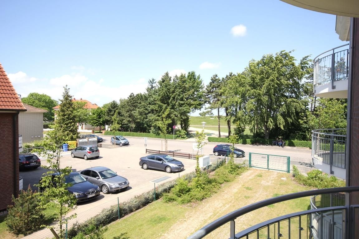 Balkon zur Westseite mit Teilseesicht zwischen den Bäumen, Glaselement als Windschutz