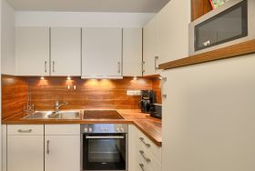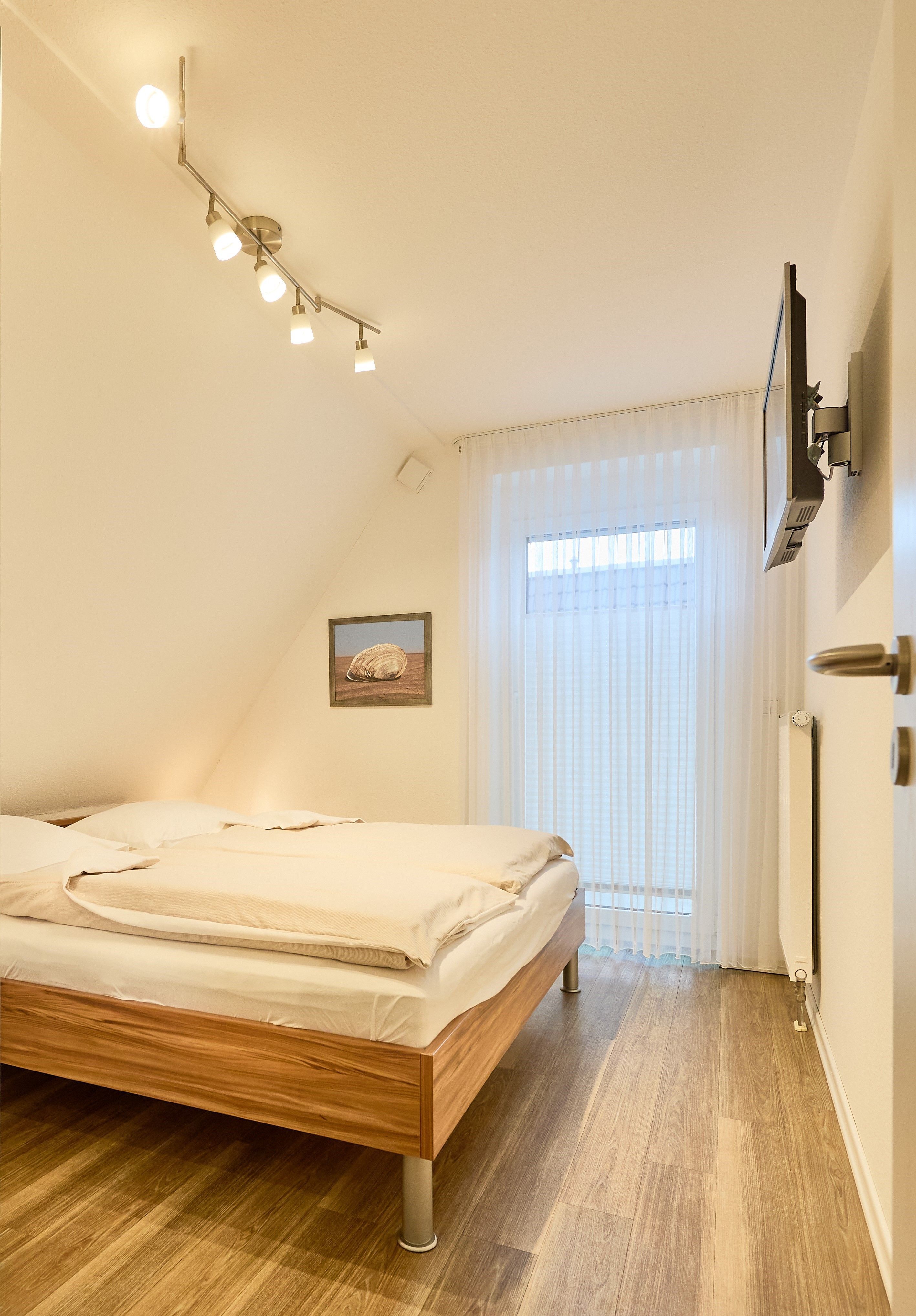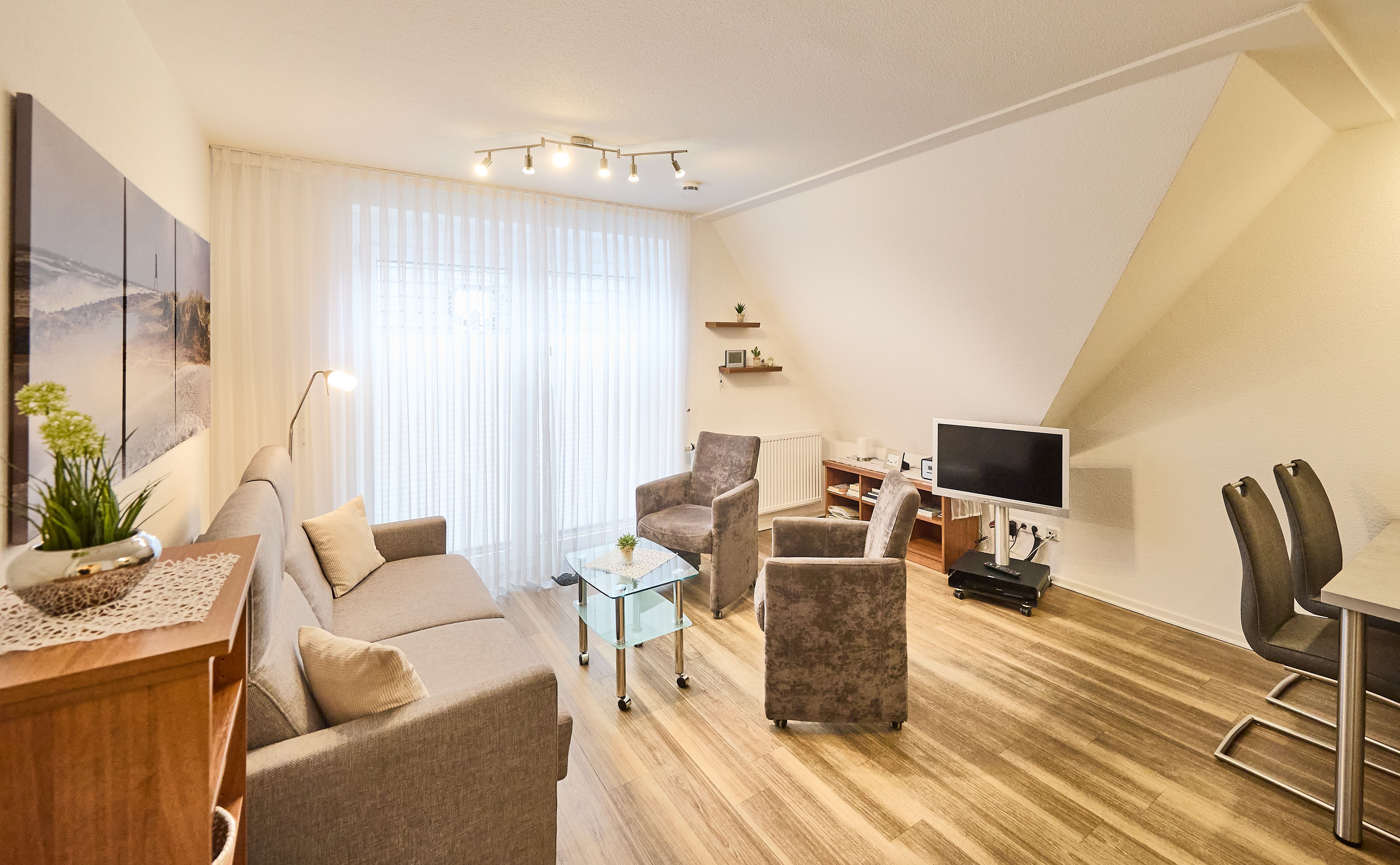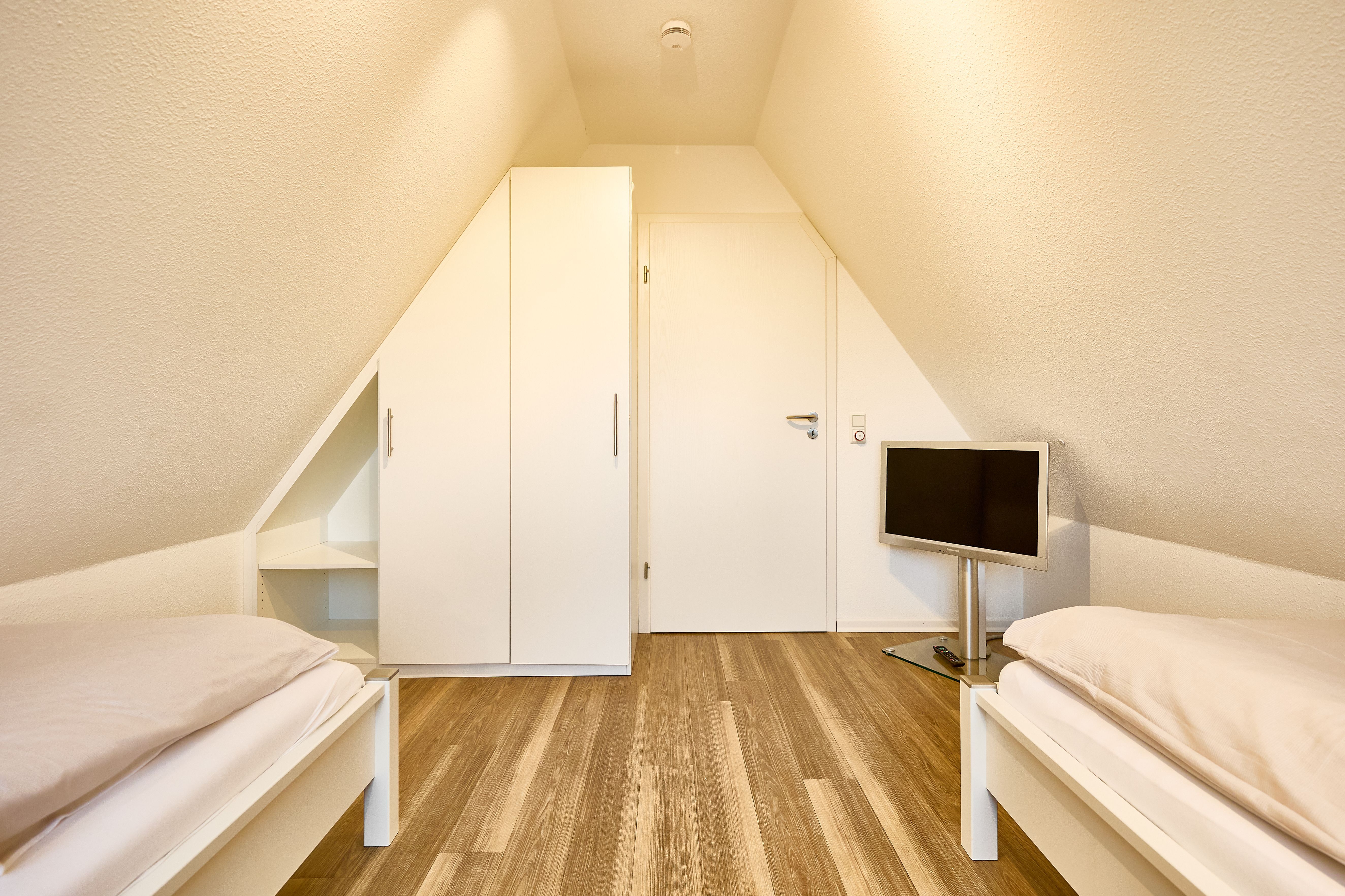 Des Weiteren beherbergt die Wohnung ein geräumiges und stilvolles Duschbad mit WC. Im Dachgeschoss erwartet Sie ein weiteres Schlafzimmer mit zwei Einzelbetten, ein modernes WC mit Waschtisch sowie eine gemütliche Leseecke, ein Schreibtisch mit Stuhl und kostenloser WLAN-Zugang für entspanntes Surfen im Internet. Die gesamte Wohnung ist mit einem bodenfreundlichen Belag ausgestattet, der auch Allergikern gerecht wird. In den beiden Schlafzimmern und im Wohnbereich sind hochwertige HD-TVs installiert.