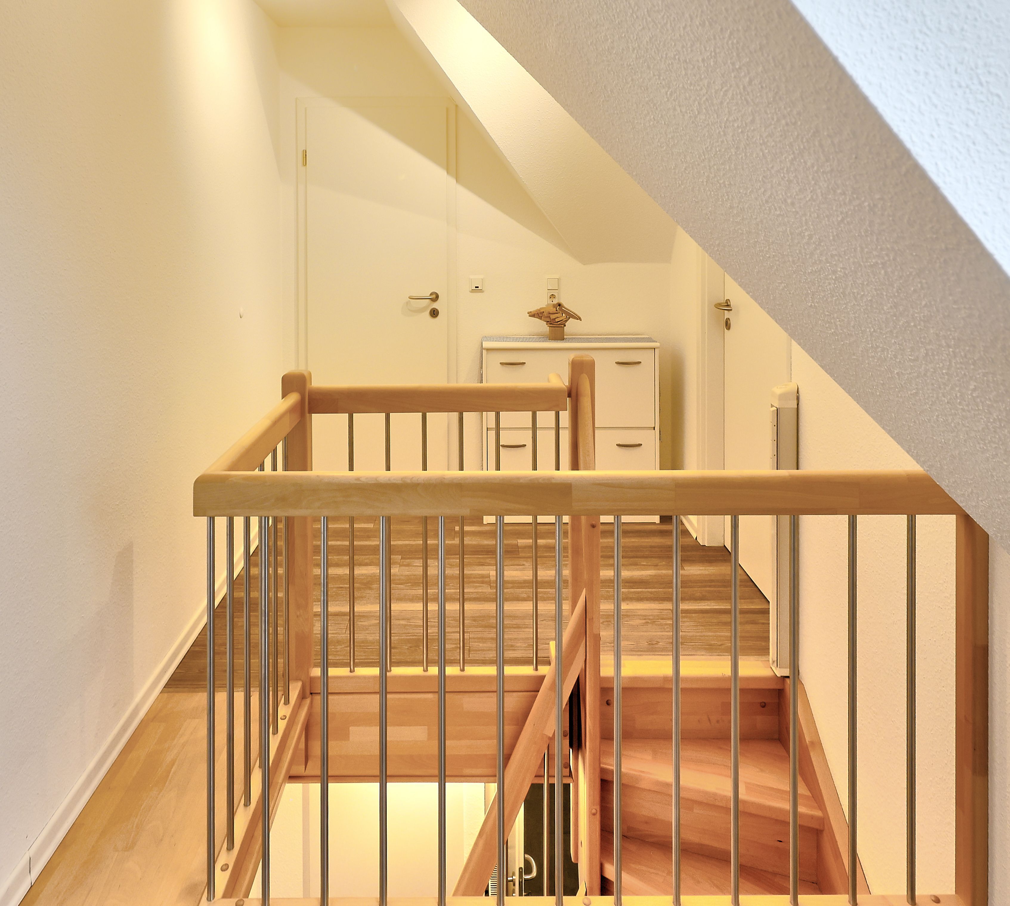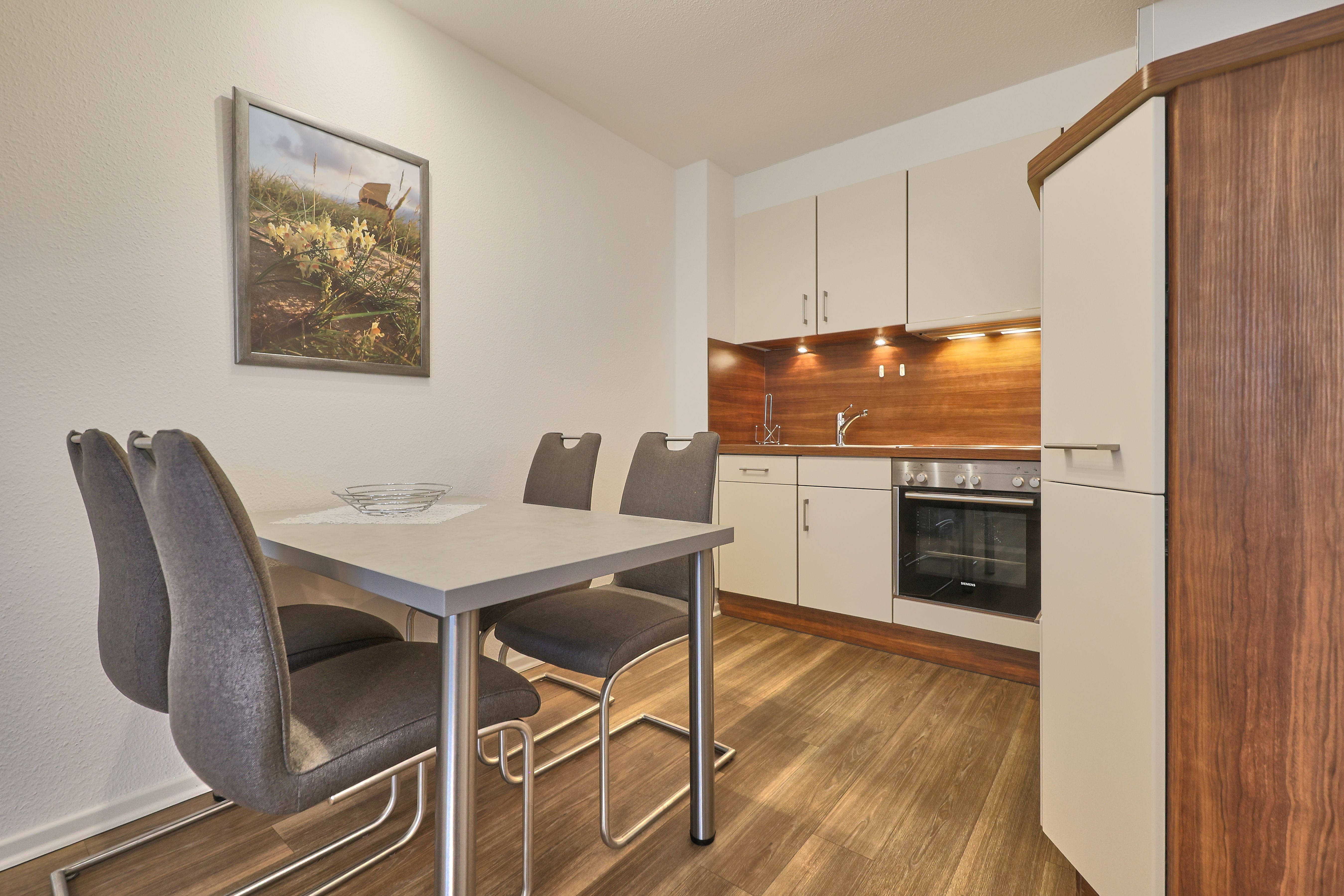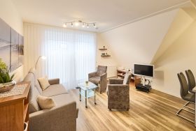 Herzlich willkommen in dieser sehr gemütlichen 3-Raum Maisonette Ferienwohnung über 2 Etagen, die Ihre Erwartungen übertreffen wird. Die sehr gute Ausstattung präsentiert sich mit einem ansprechenden Wohn- und Essbereich, einer vollständig eingerichteten Küchenzeile inklusive hochwertiger Siemens-Einbaugeräte und direktem Zugang zum großzügigen Südwest-Balkon. Dieser ist mit erstklassigen Kettler Balkonmöbeln ausgestattet, und als Sonnenschutz erwartet Sie eine elektrische Sonnenschutzmarkise. Der Balkon ist auch vom Schlafzimmer aus zugänglich, welches mit einem Doppelbett und einem großzügigen Kleiderschrank eingerichtet ist.